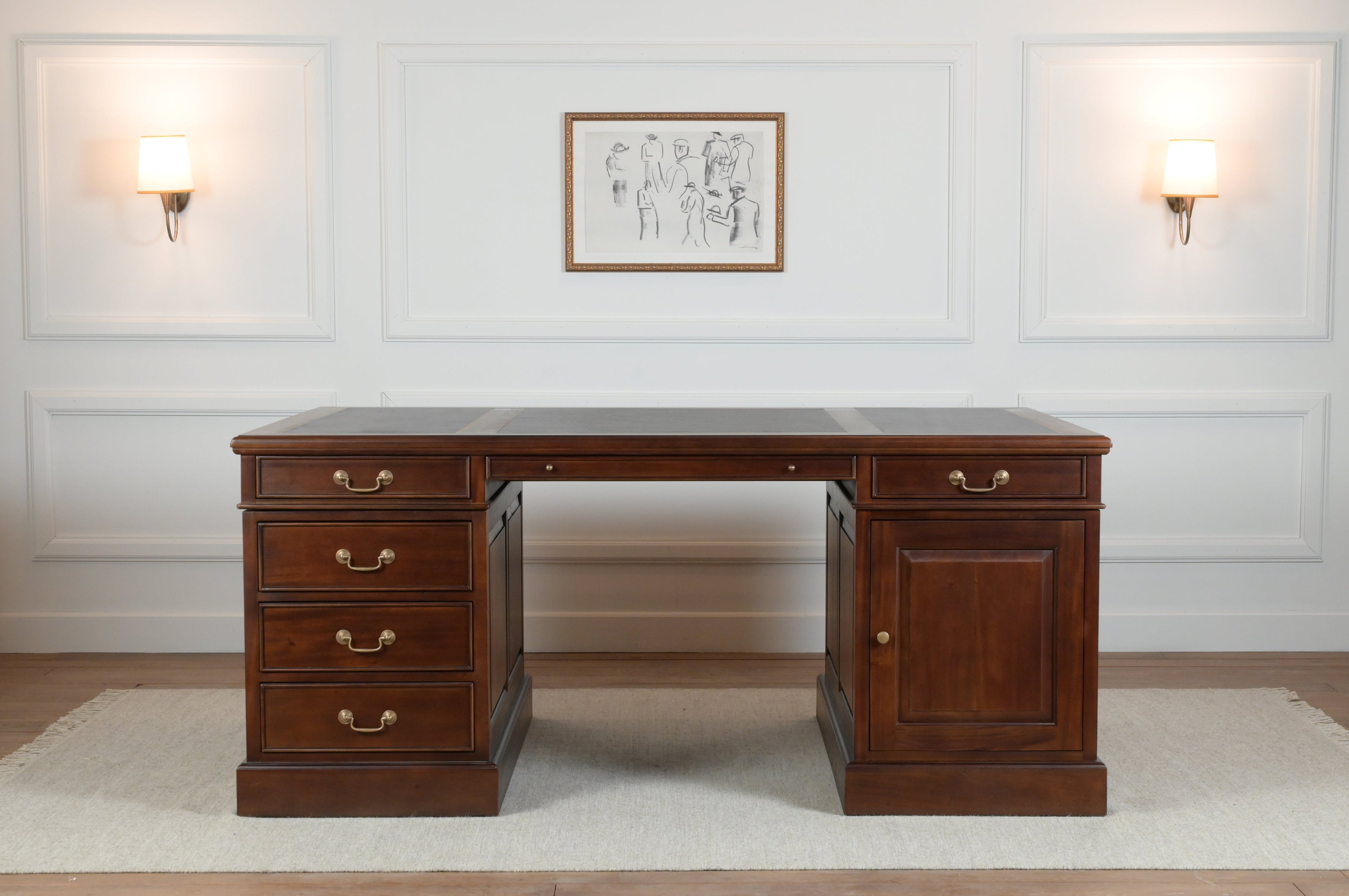 Dit bureau is gemaakt van hoogwaardig massief mahoniehout en het blad dat is ingelegd met echt leer. Het bureau is gebeitst in de kleur Mahonie.