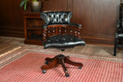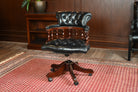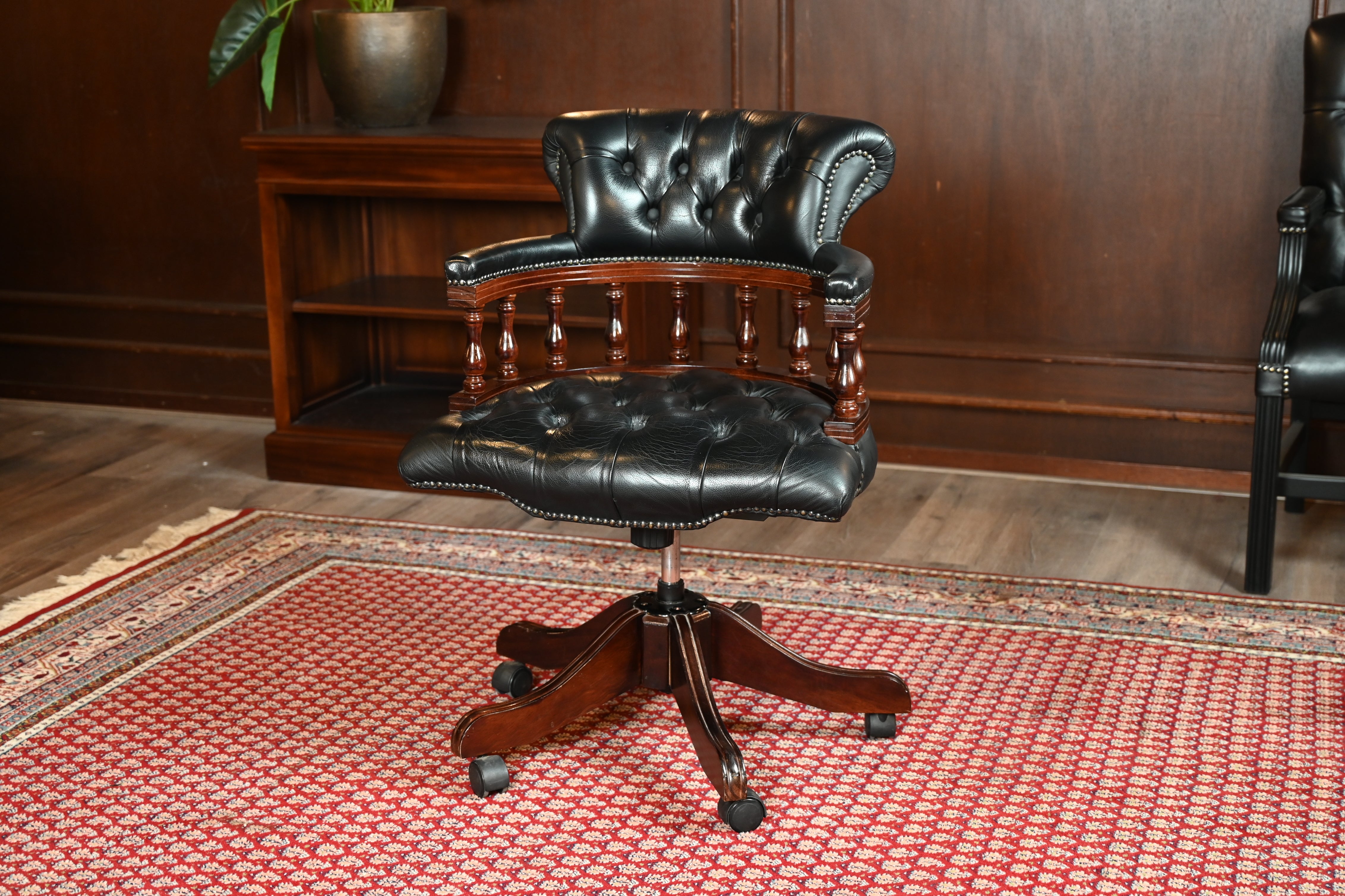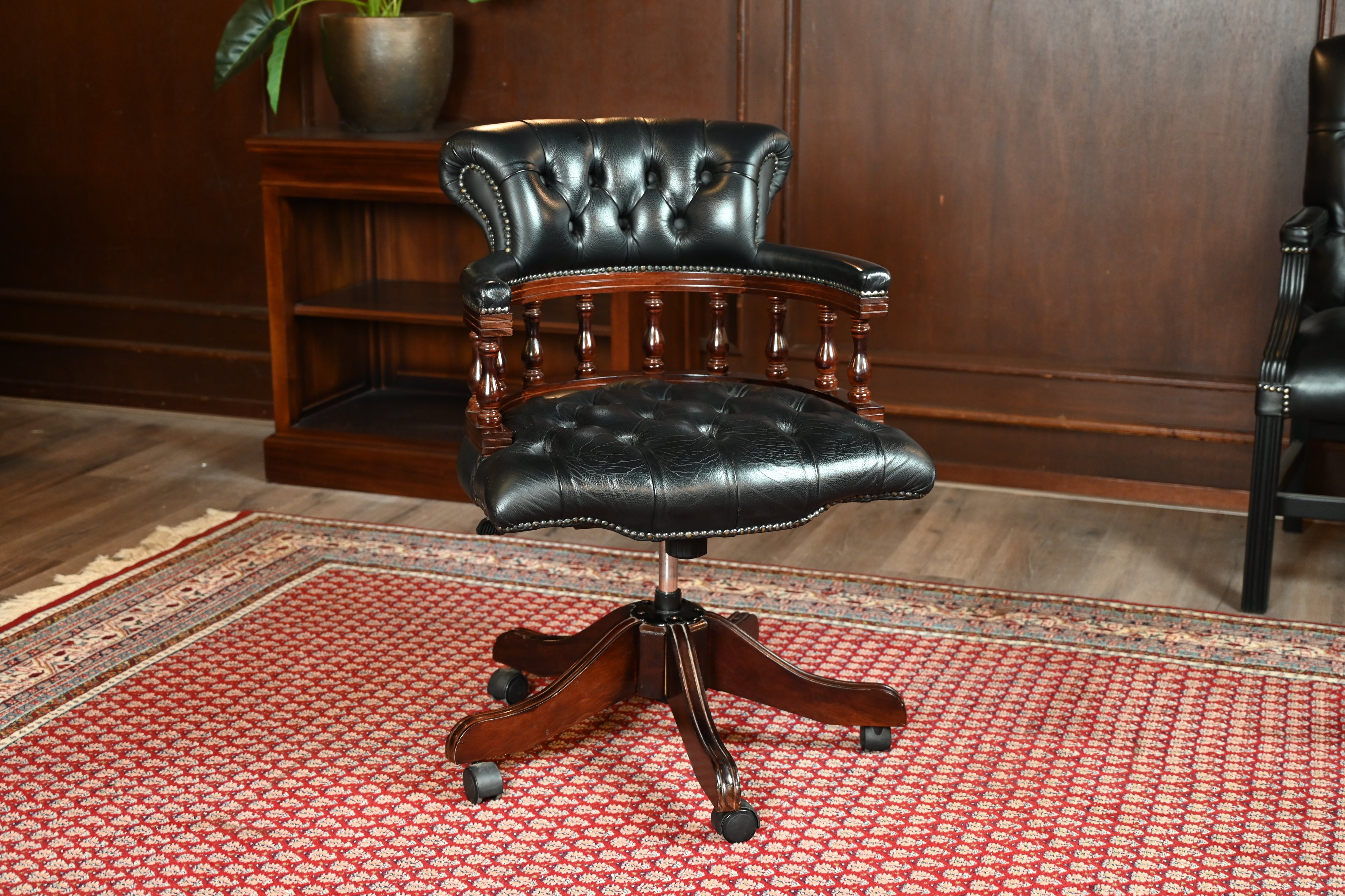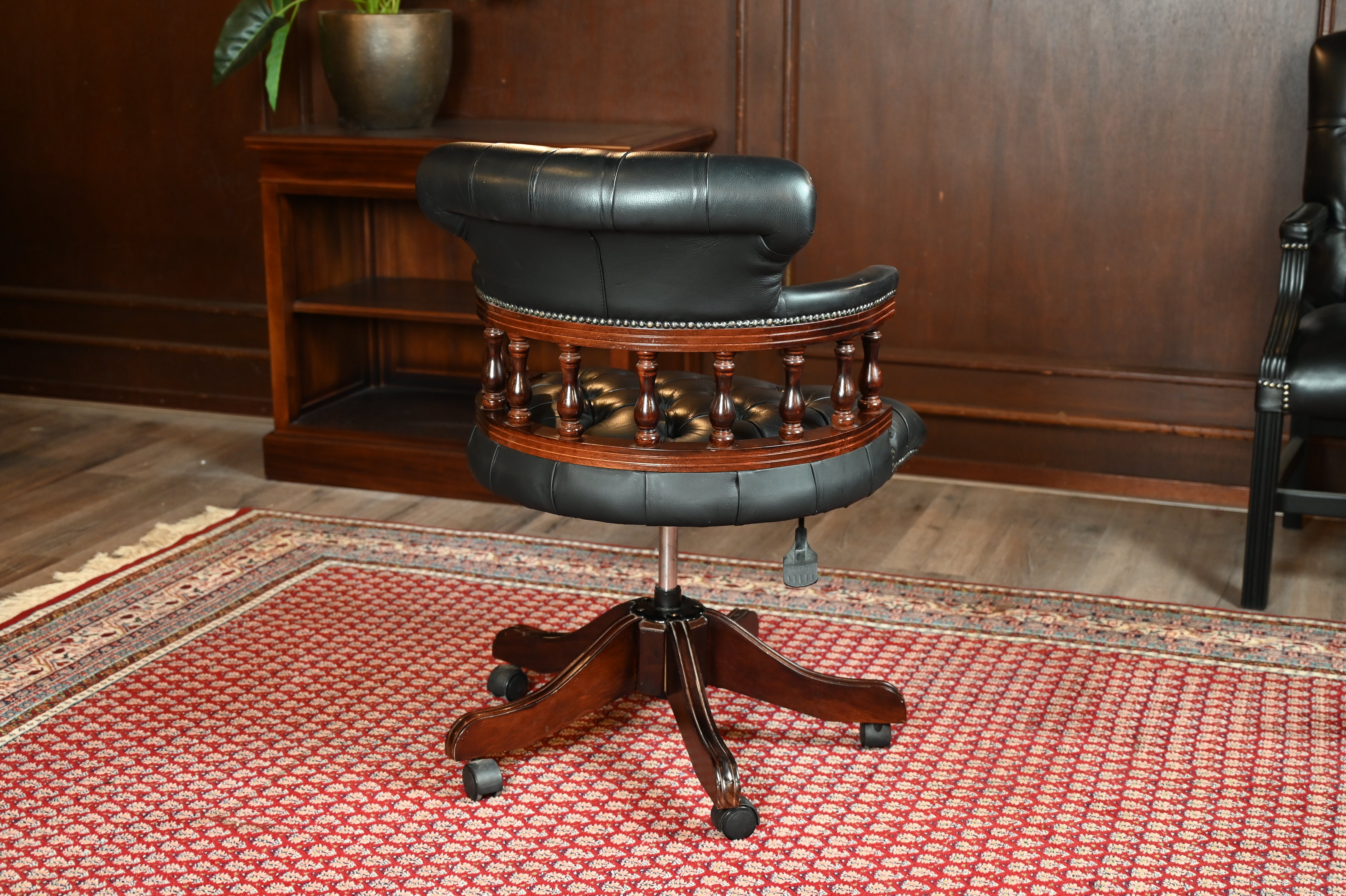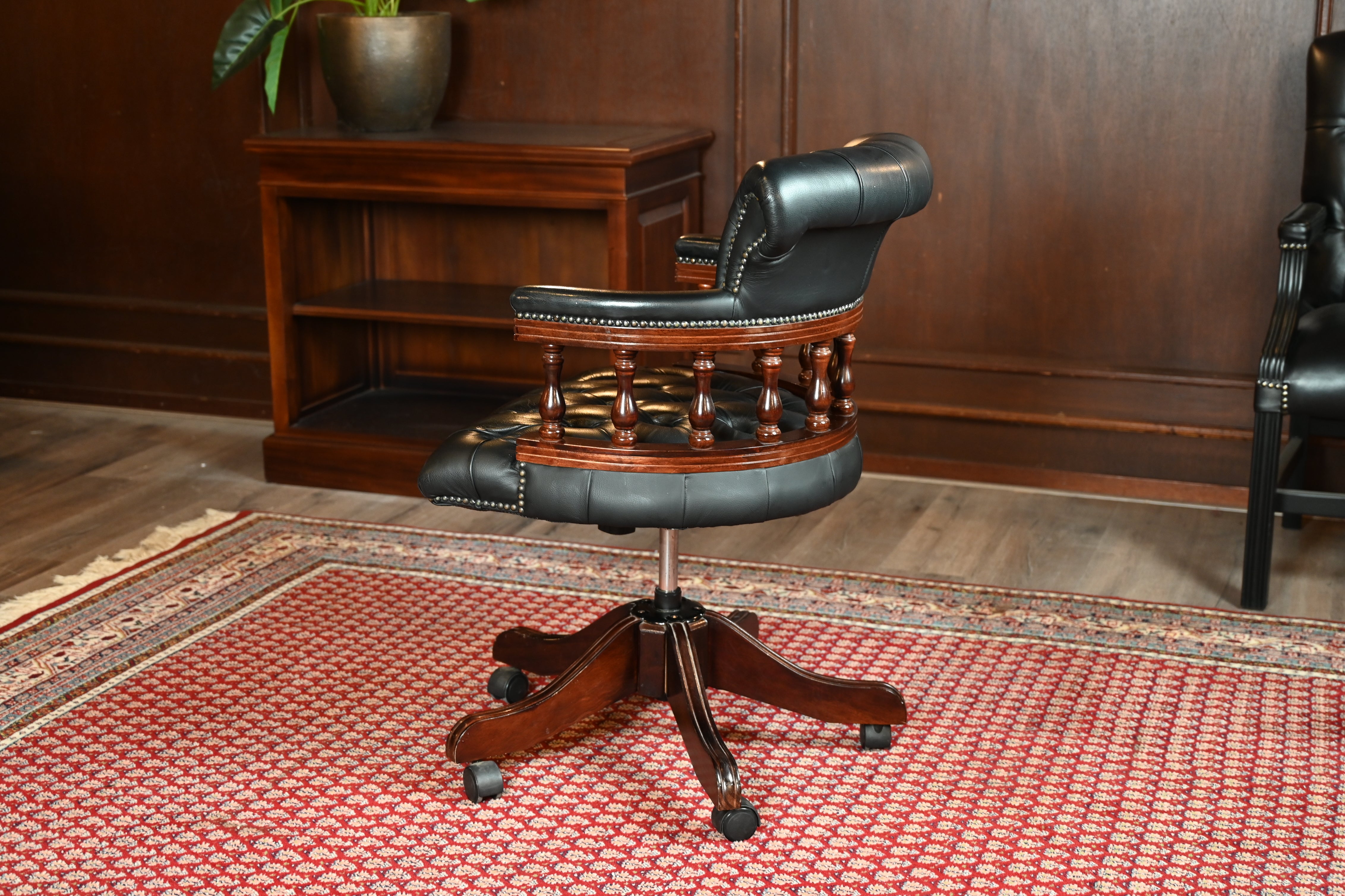 Vintage stoel, zwart leer, mahoniehout, Chesterfield, 255