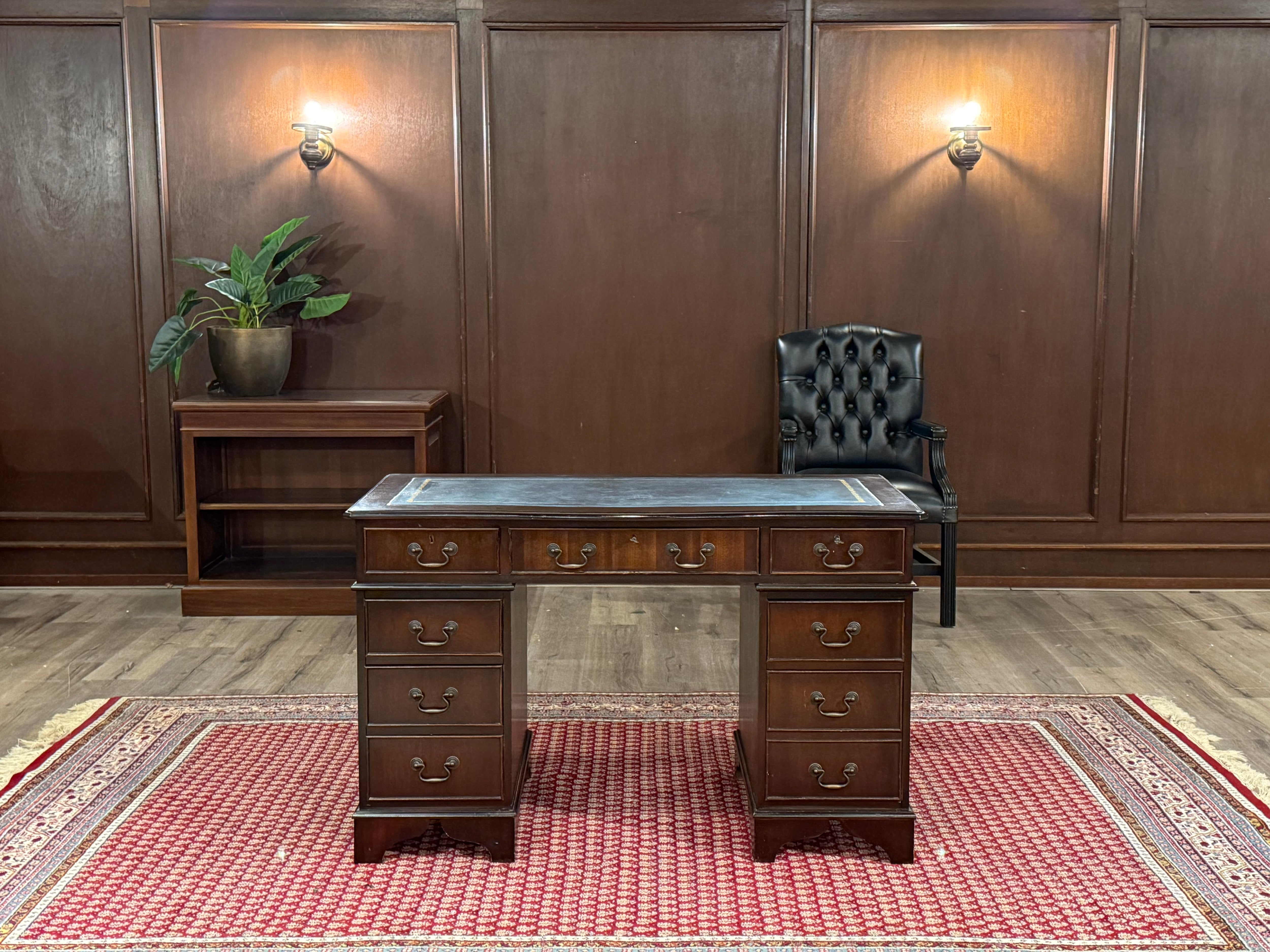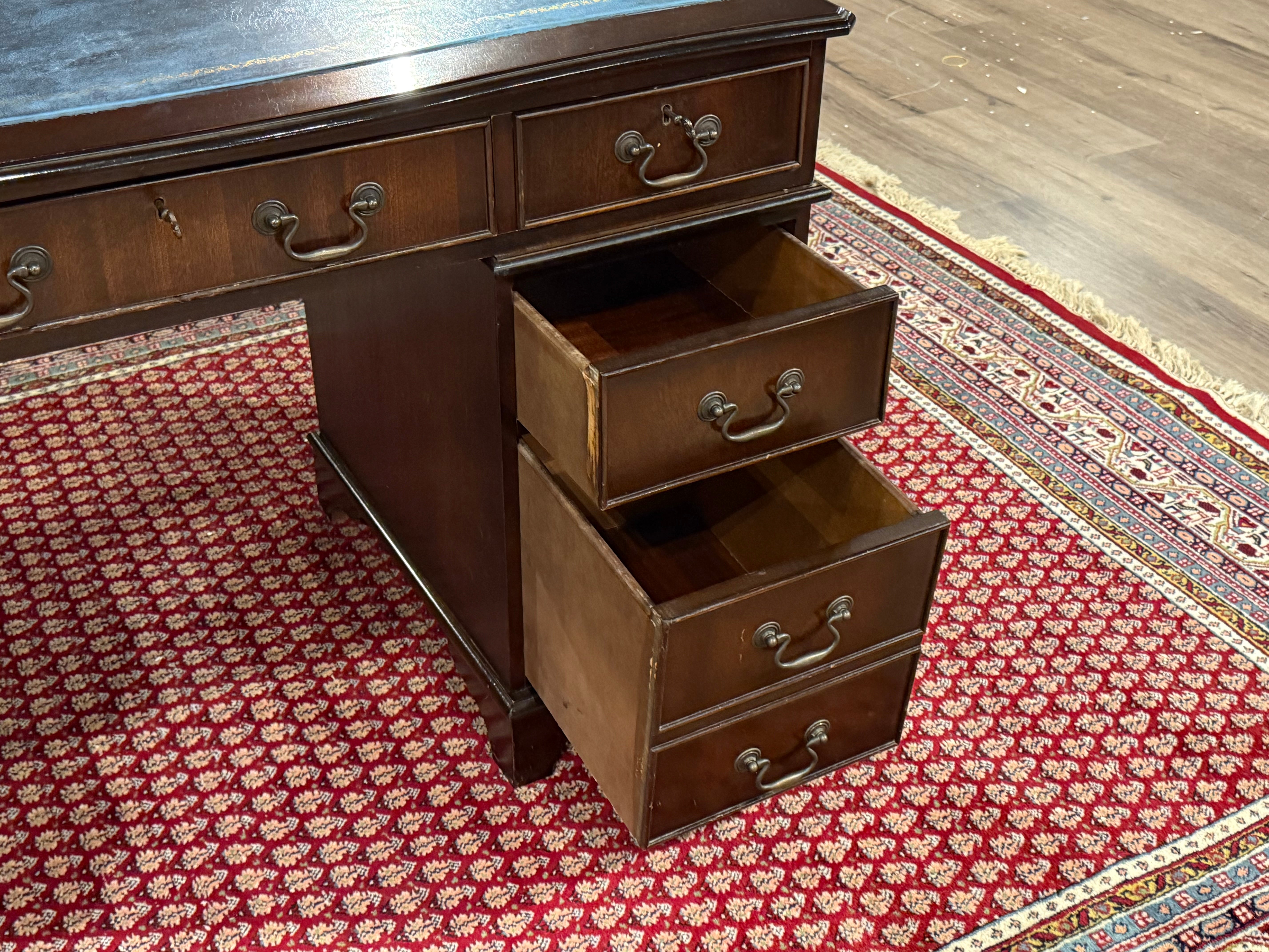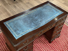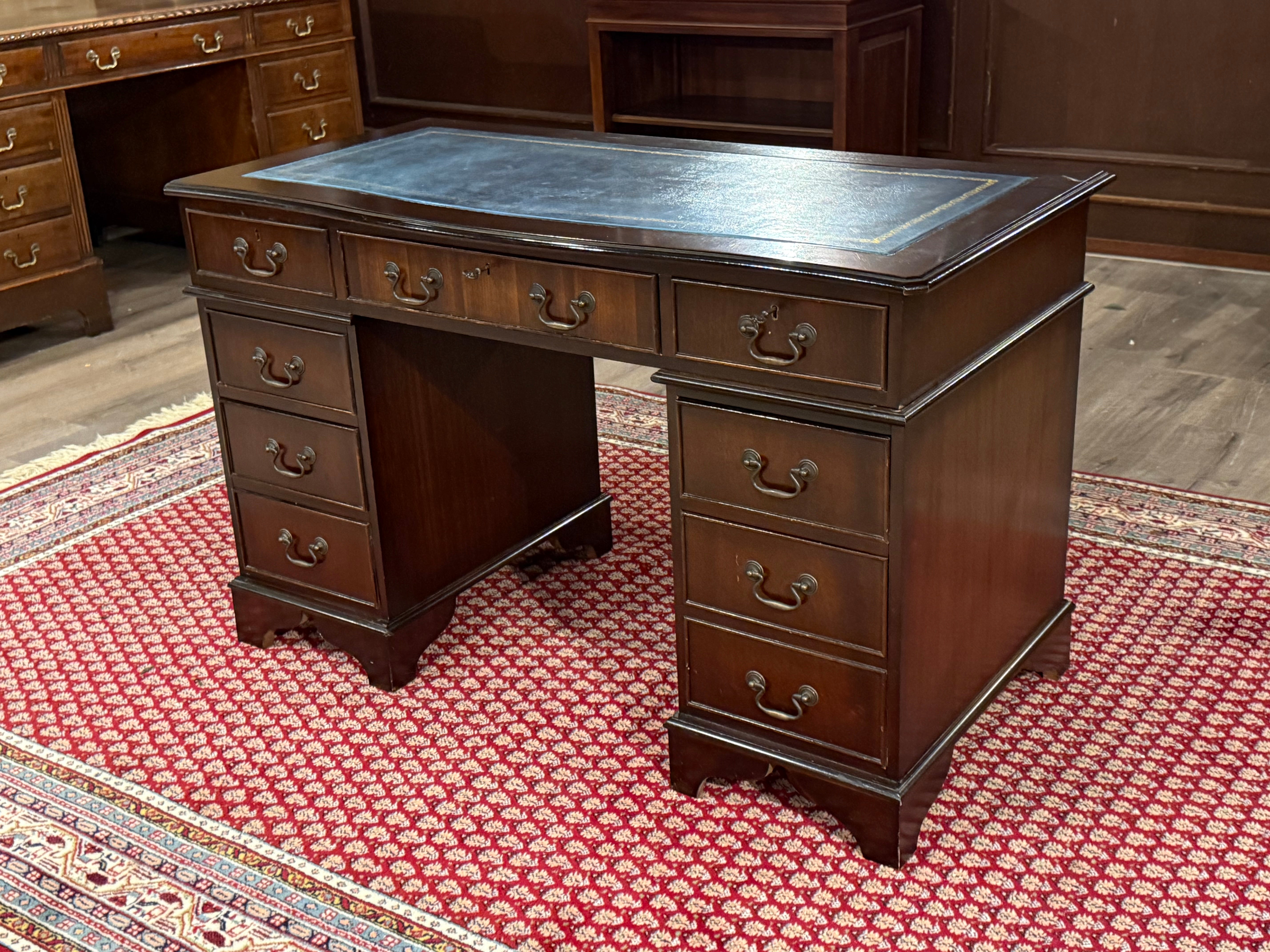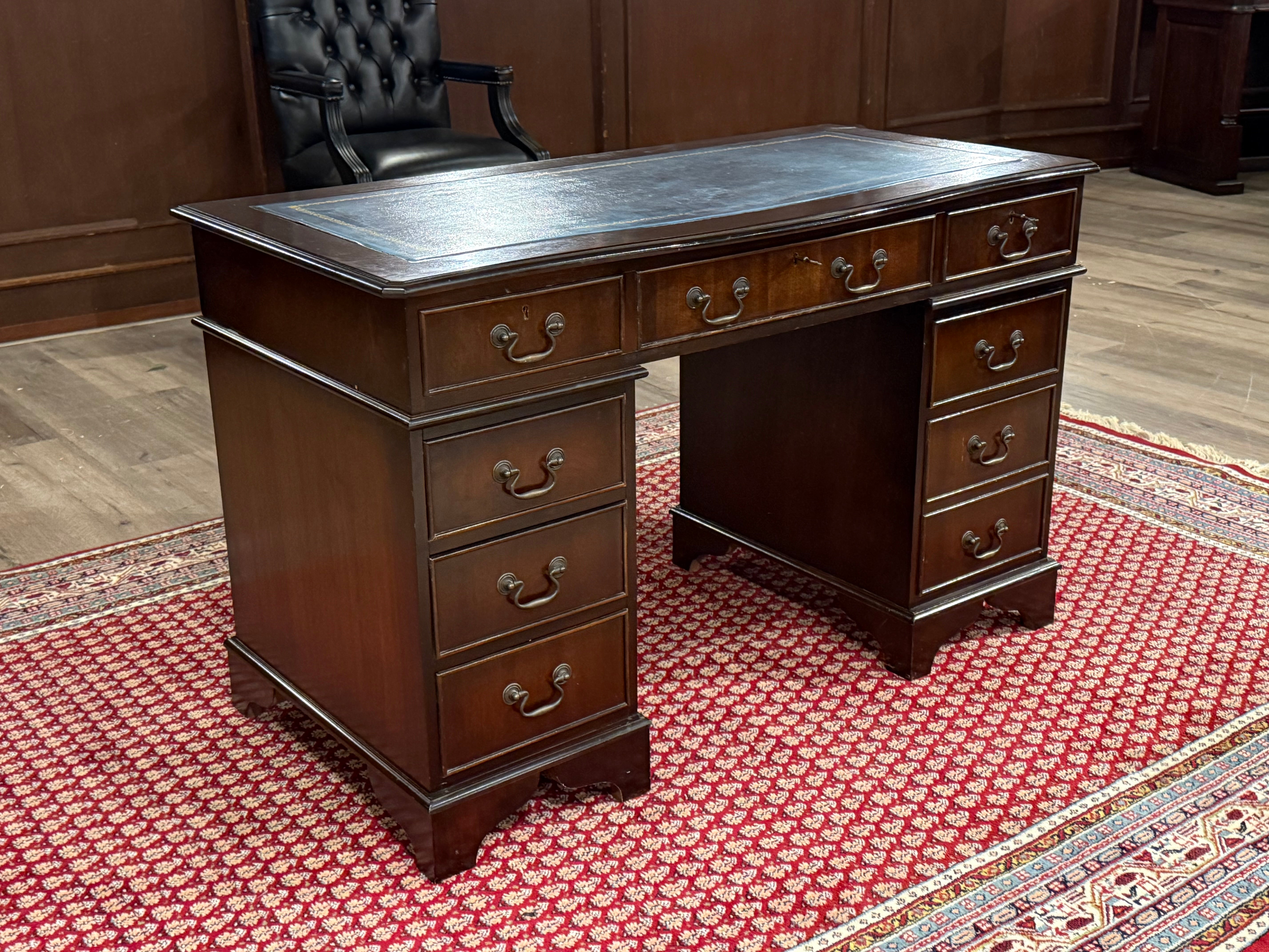 Vintage bureau, klassiek Engels bureau, mahoniehout, blauw leer, 548