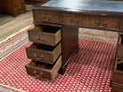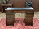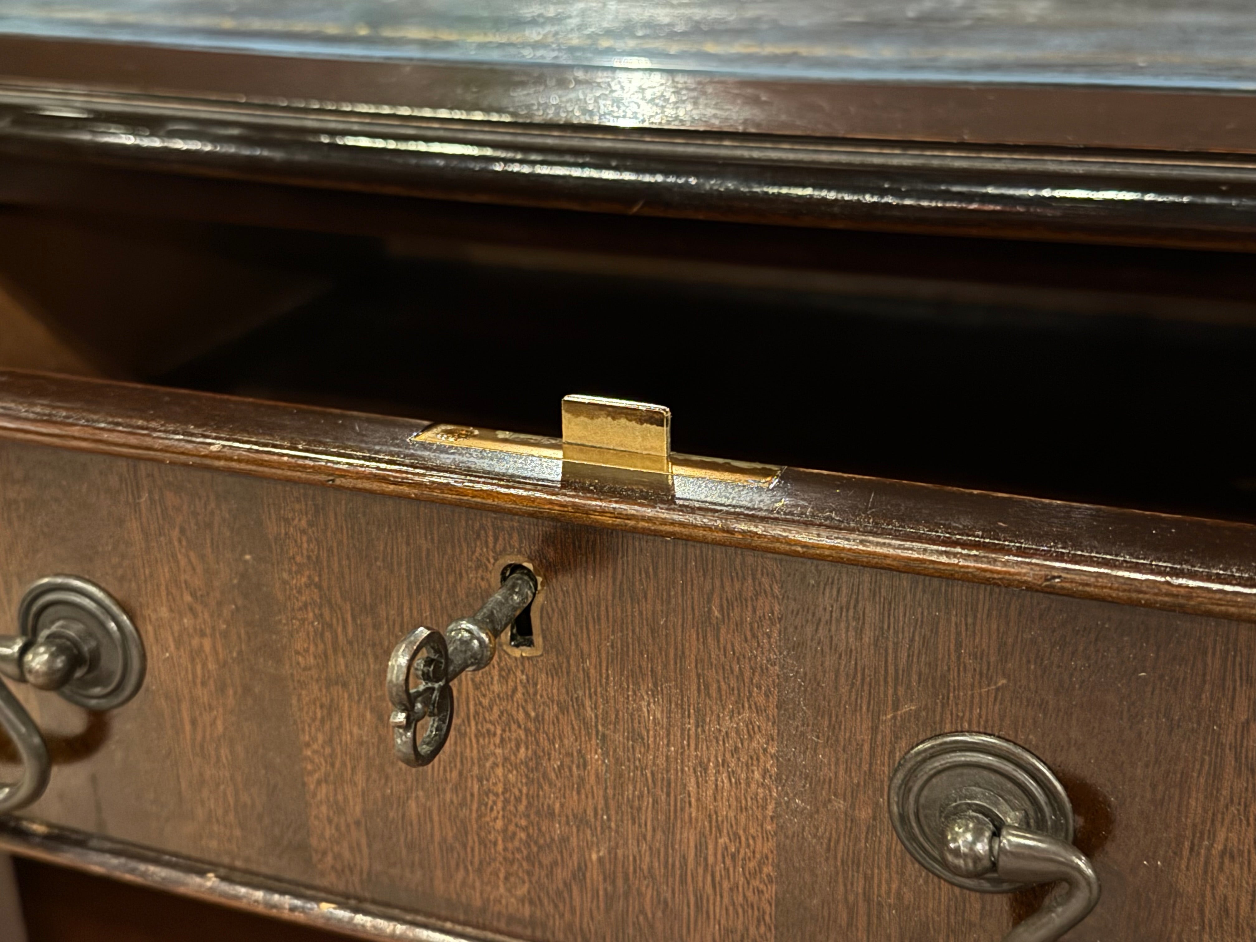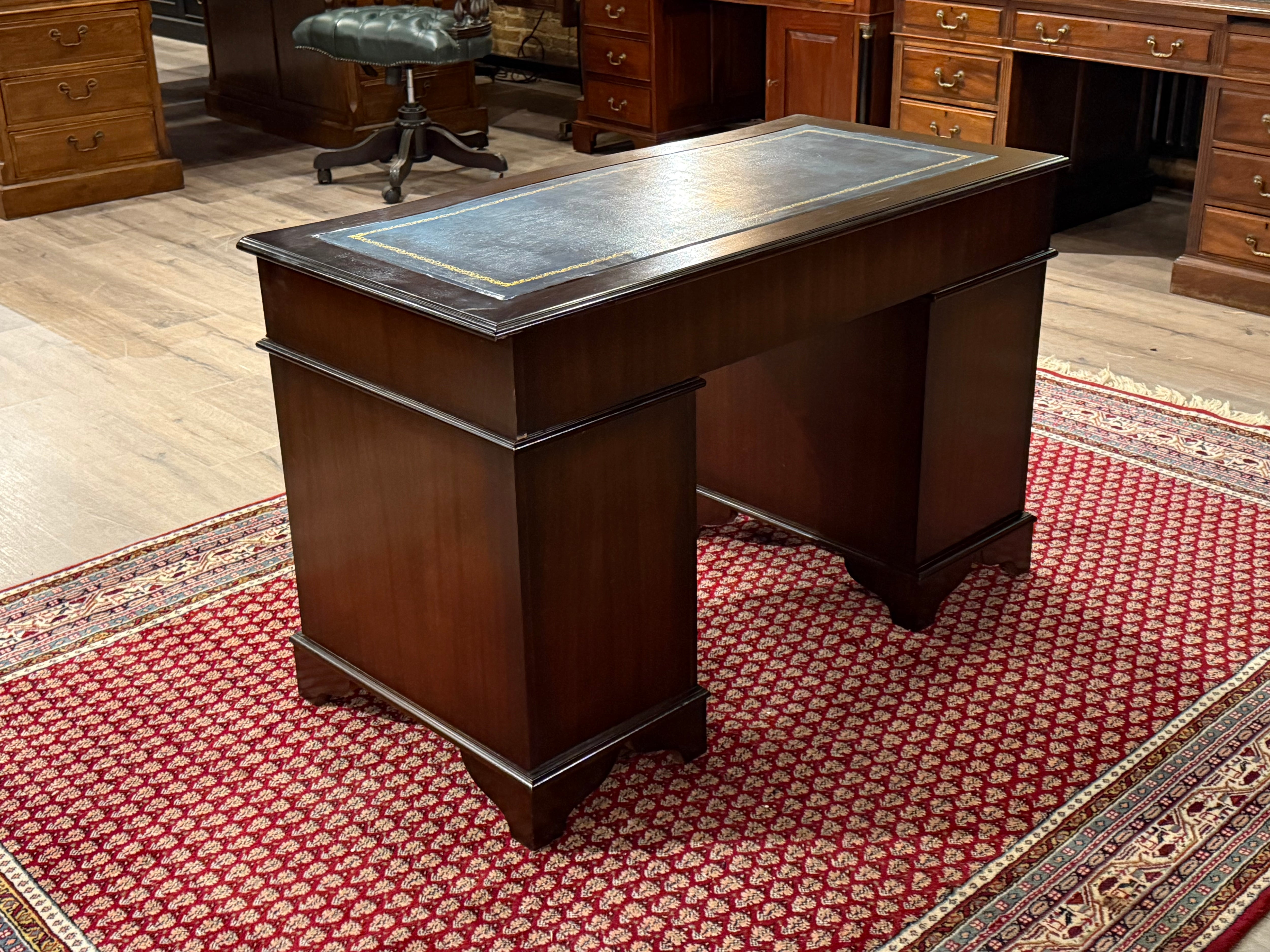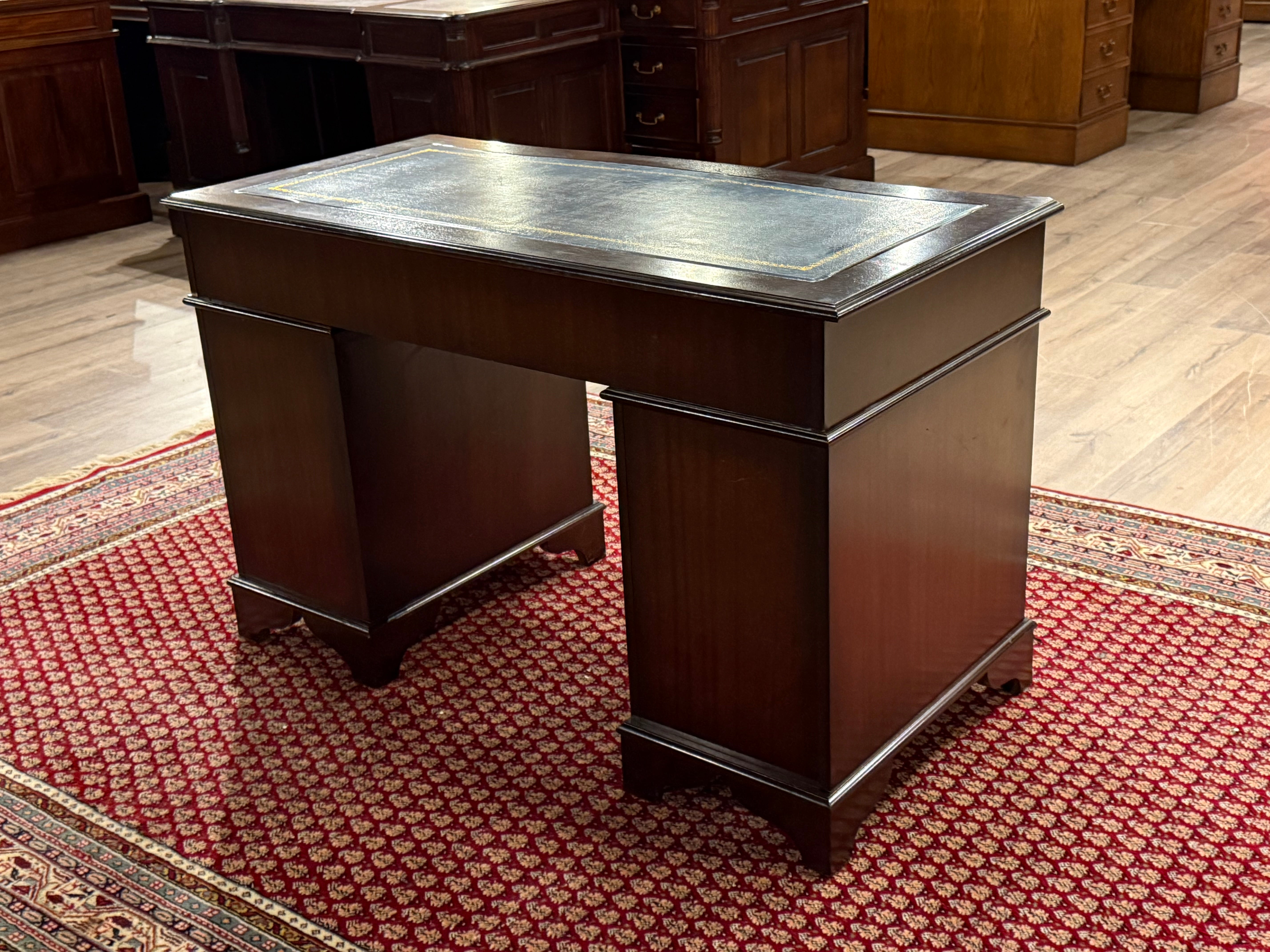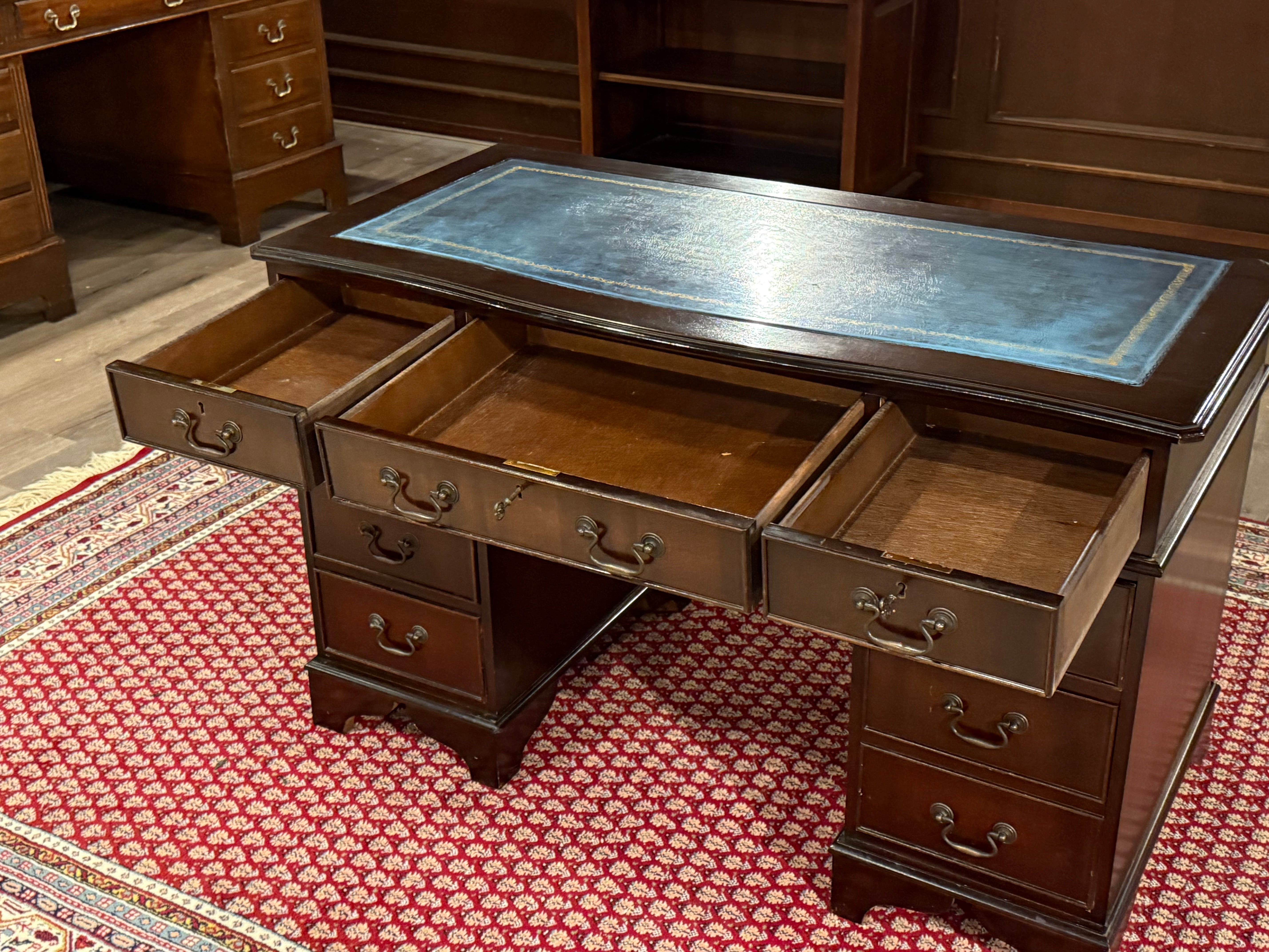 Vintage bureau, klassiek Engels bureau, mahoniehout, blauw leer, 548