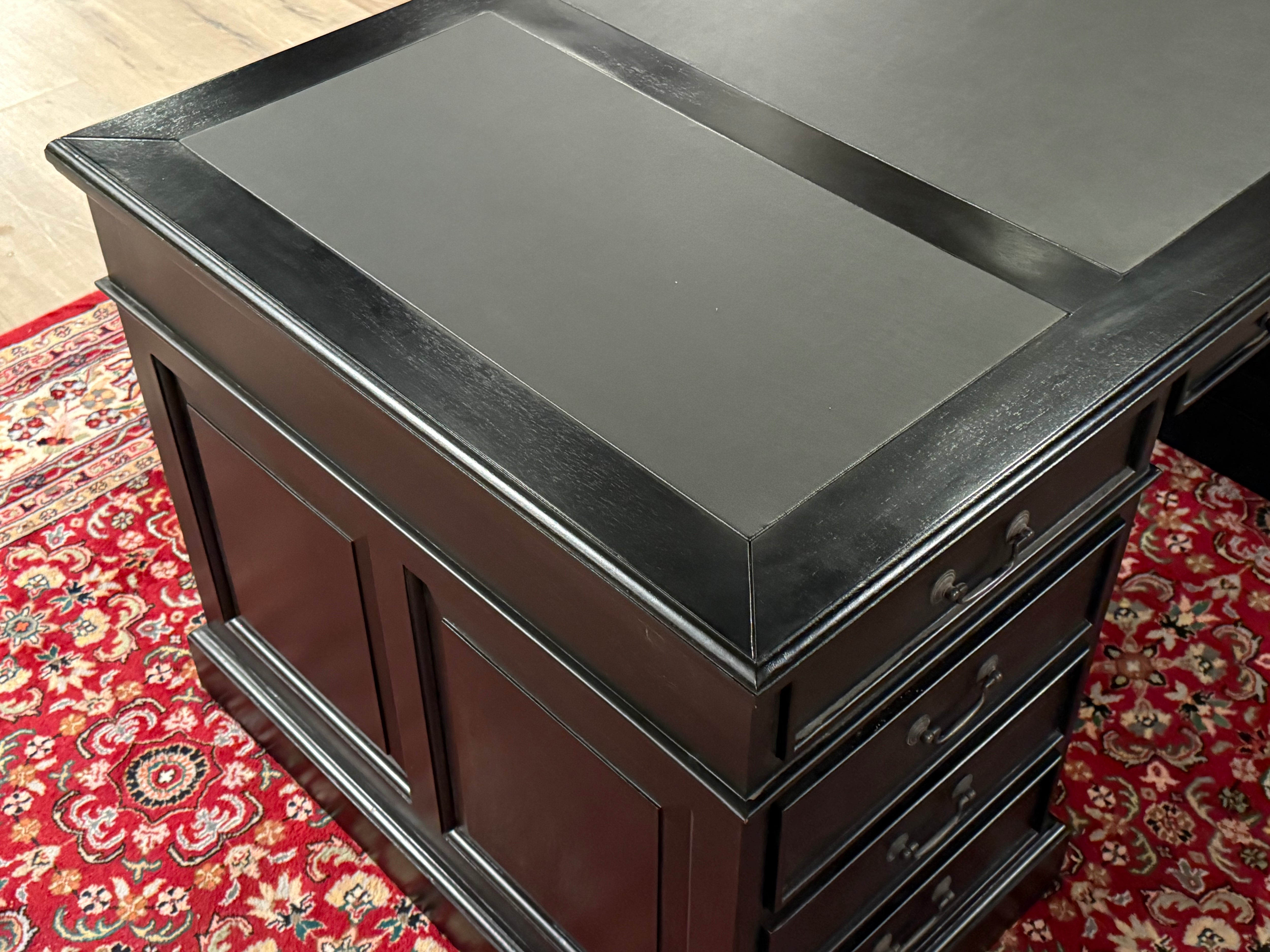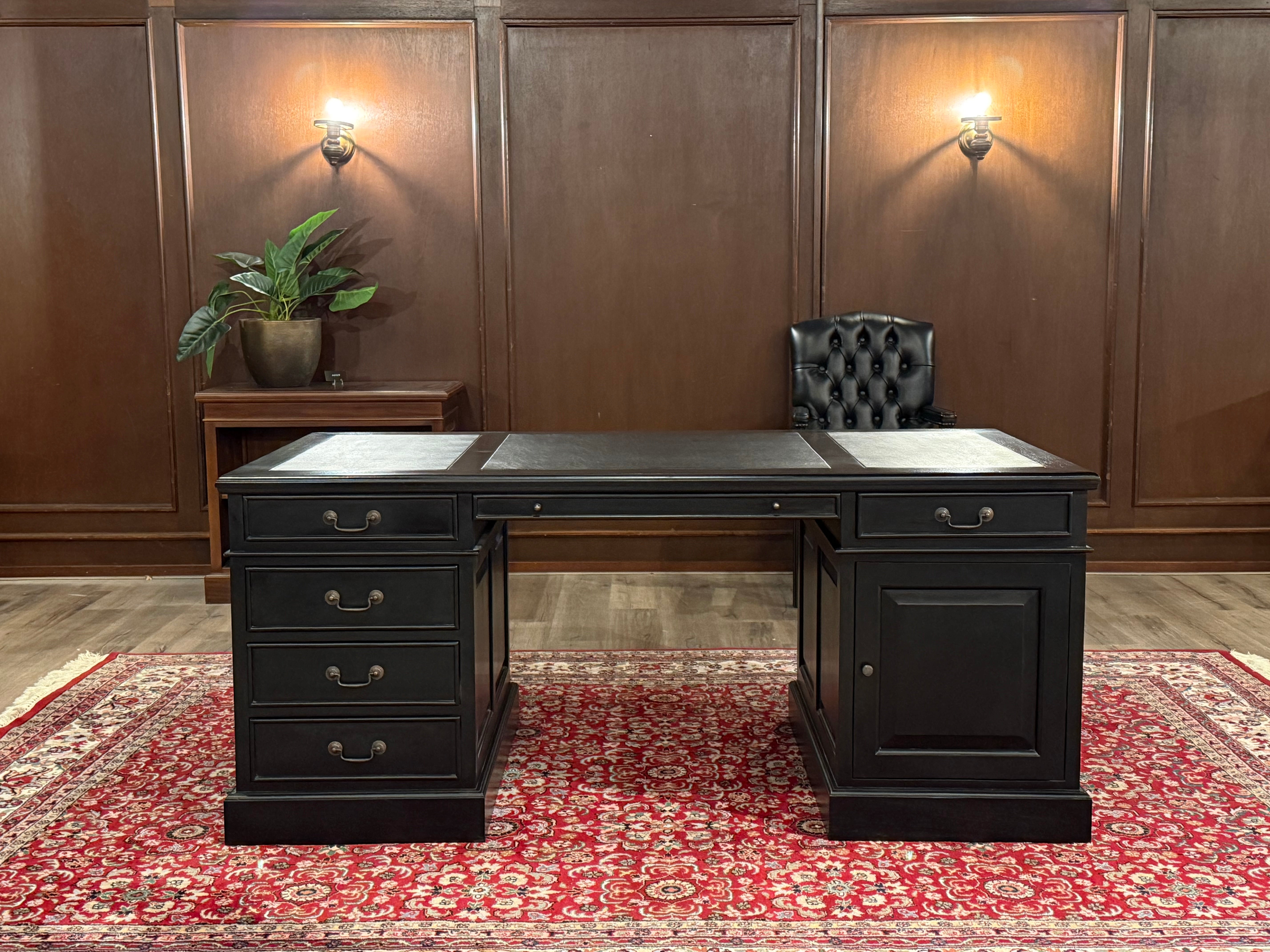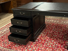 Vintage bureau, zwart, klassiek Engels bureau, mahoniehout, zwart leer, 588