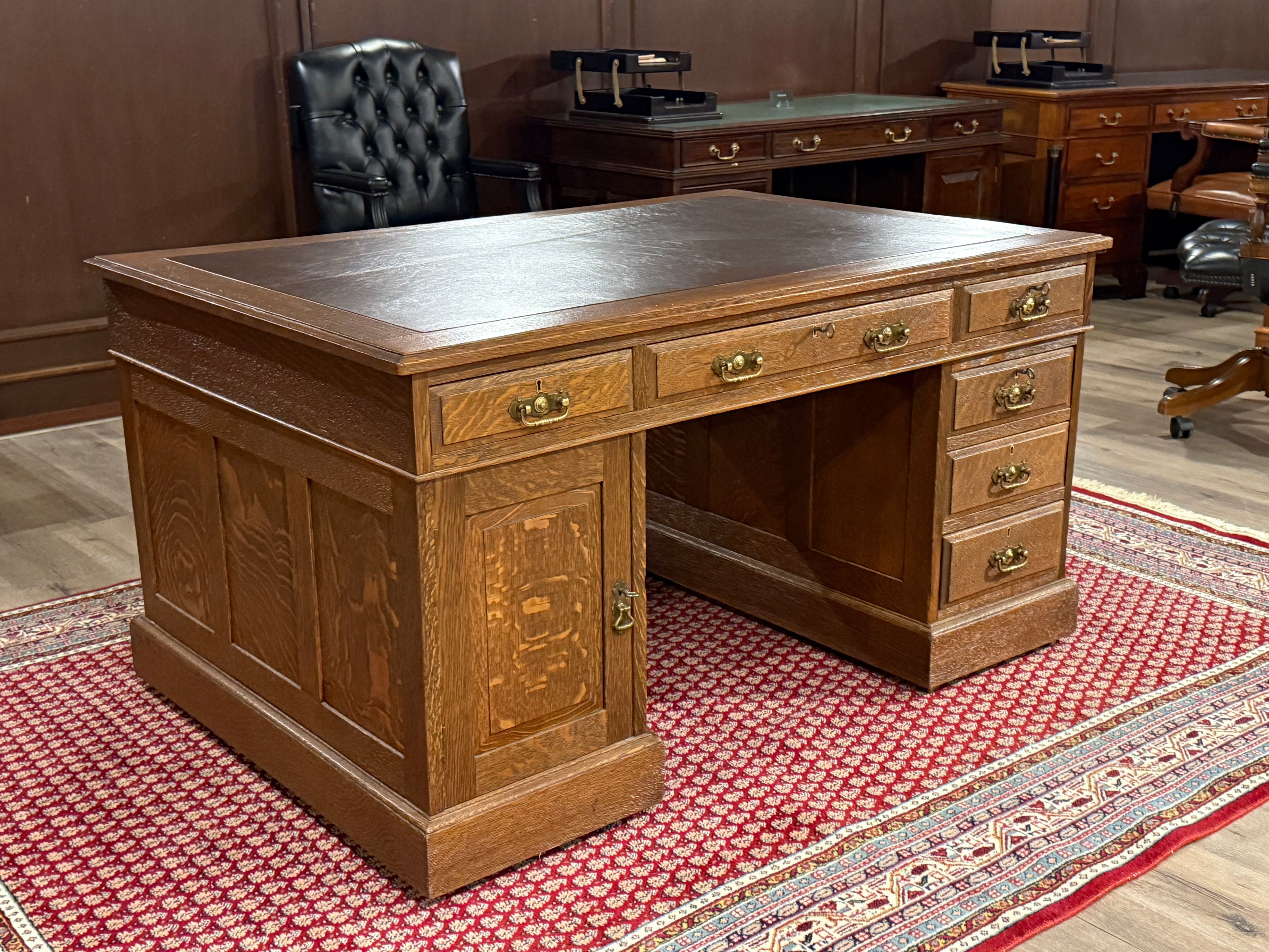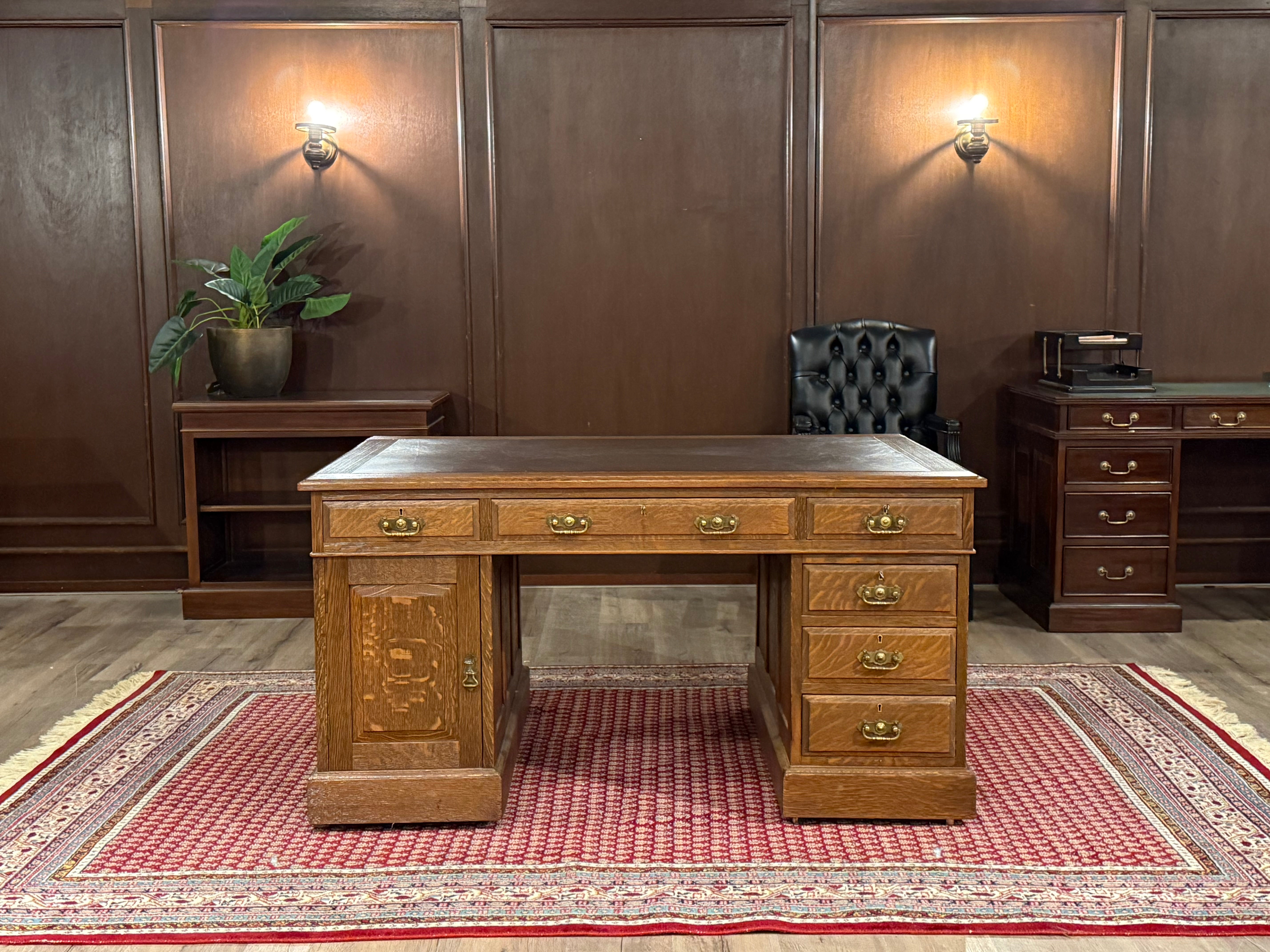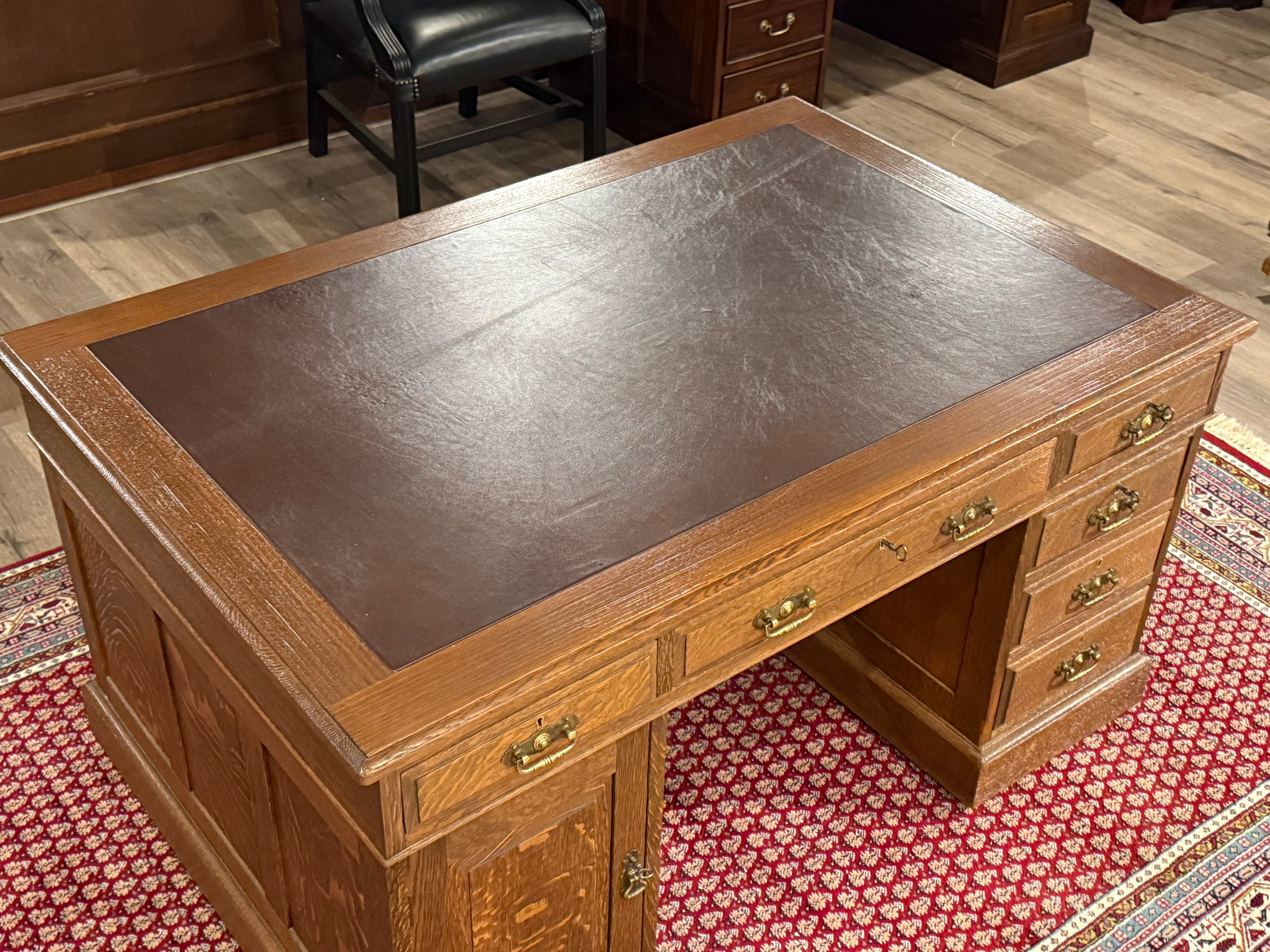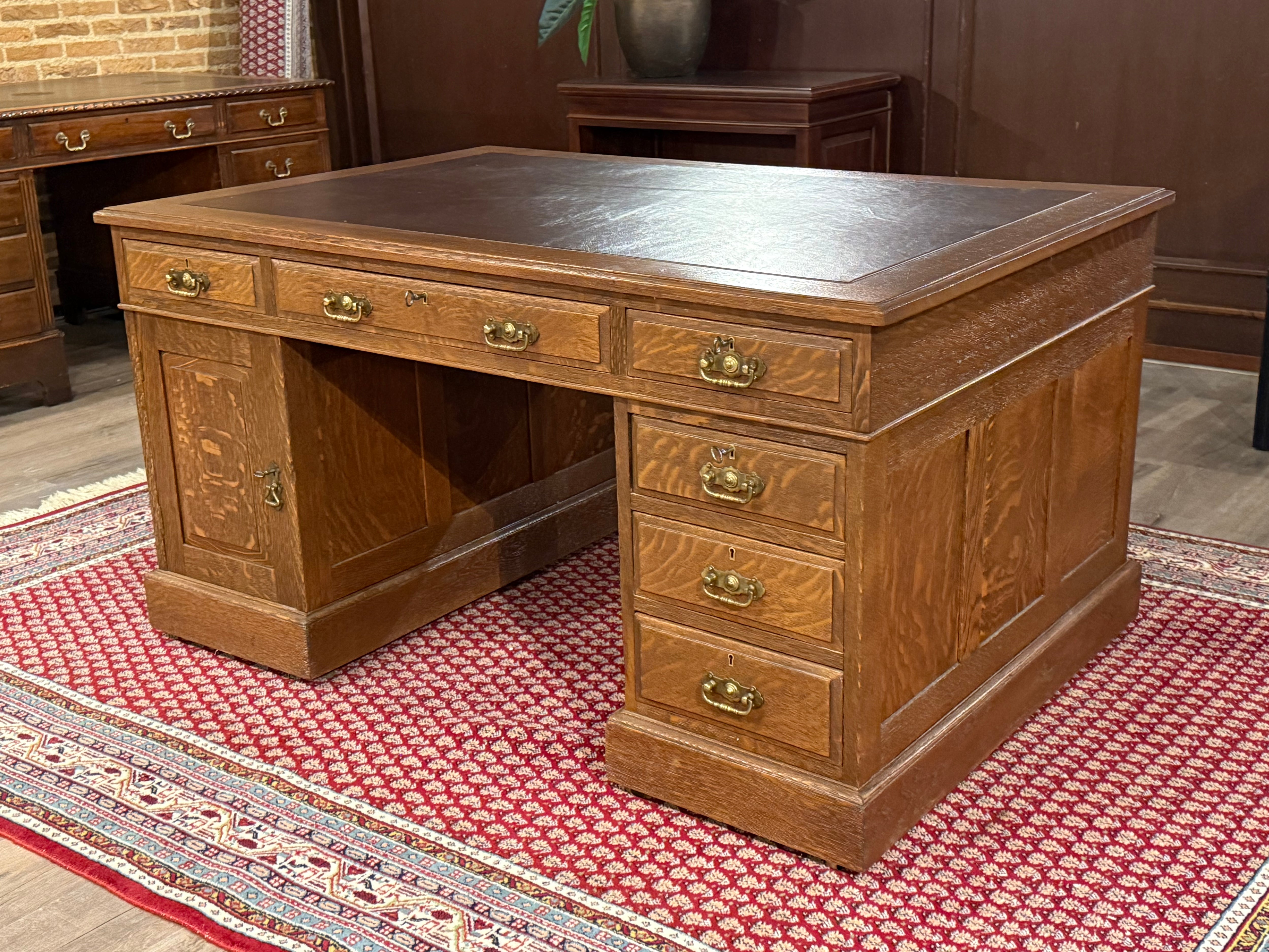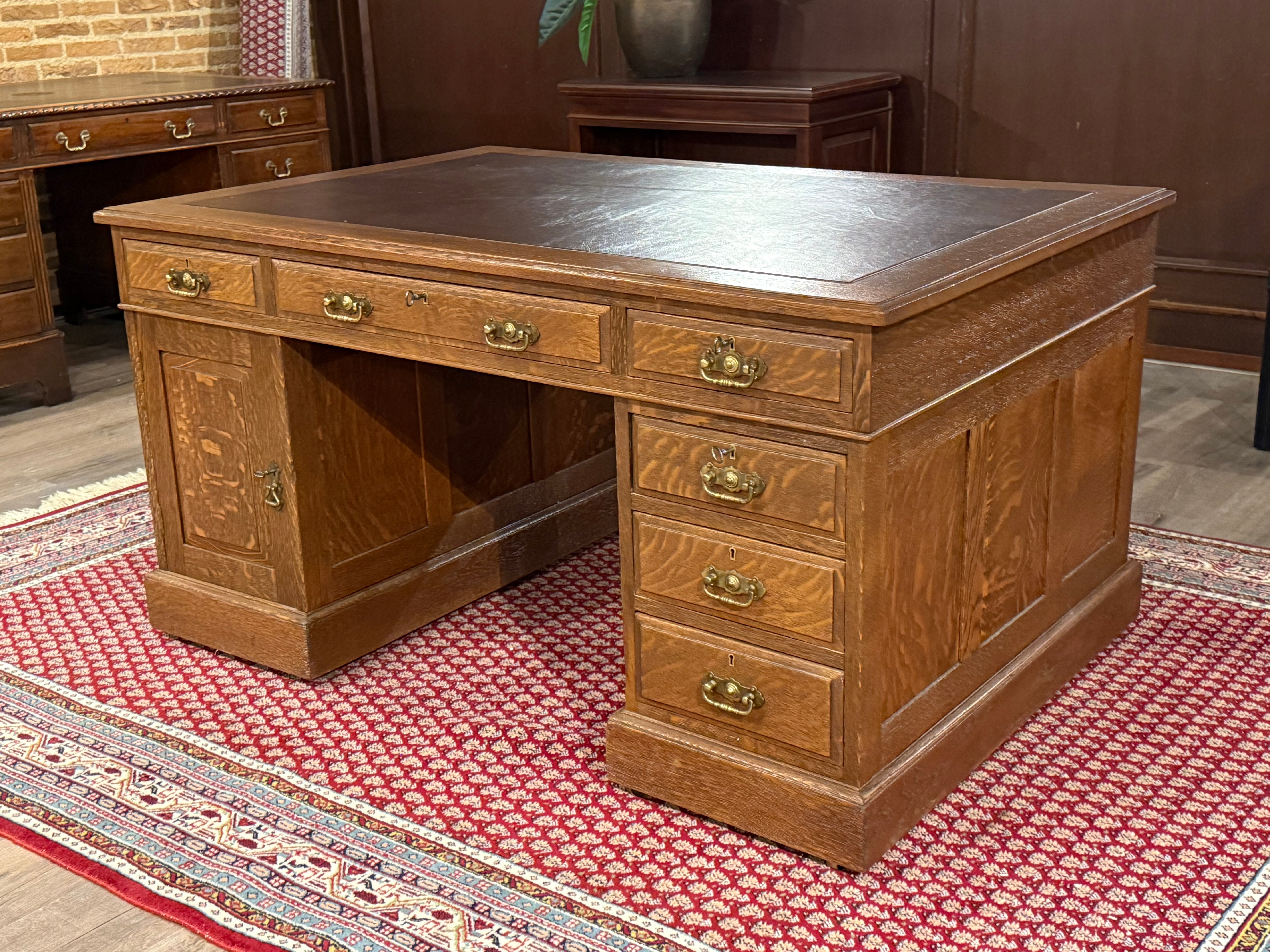 Vintage bureau, antiek bureau, eikenhout, bruin leer, 529