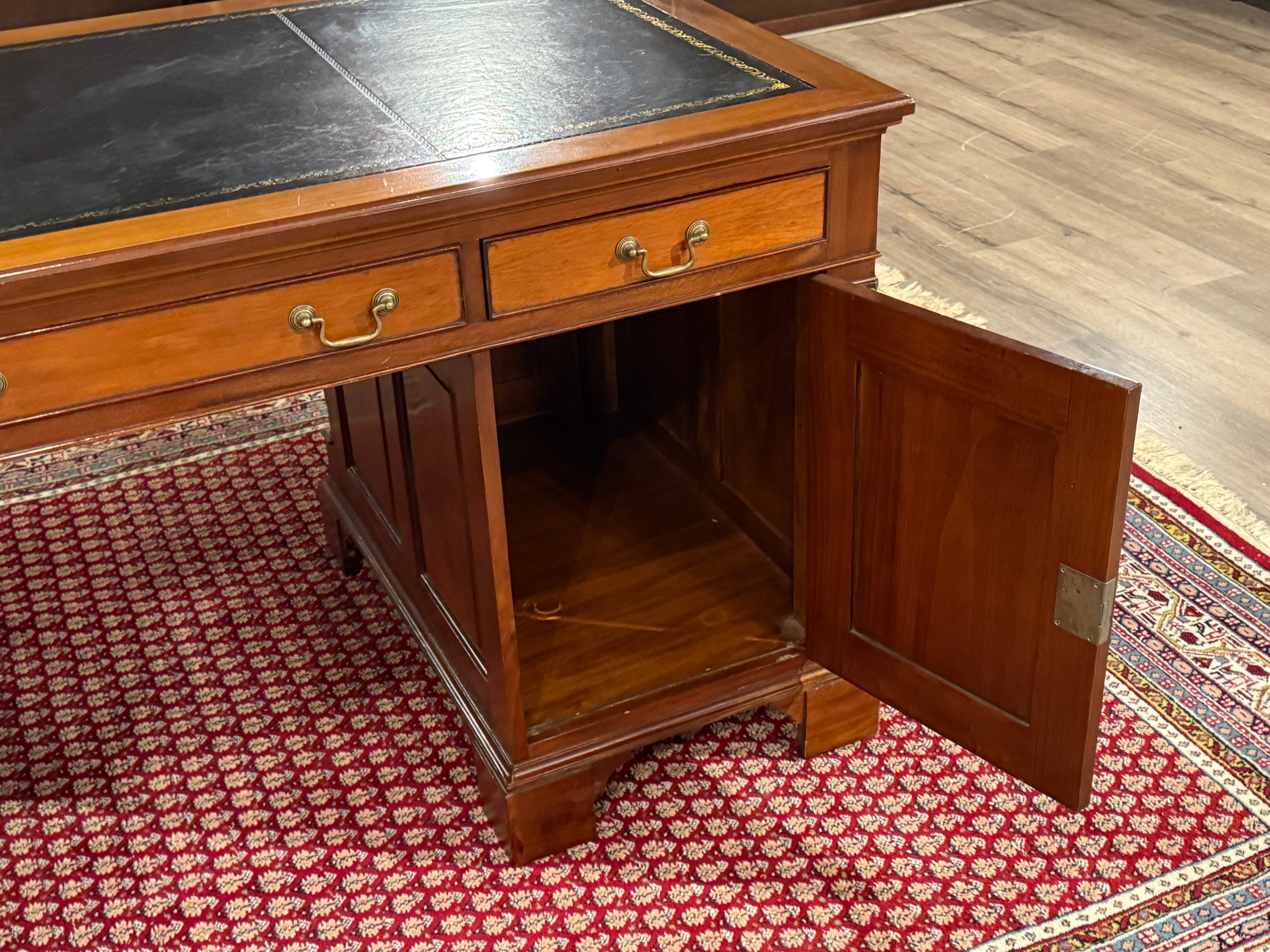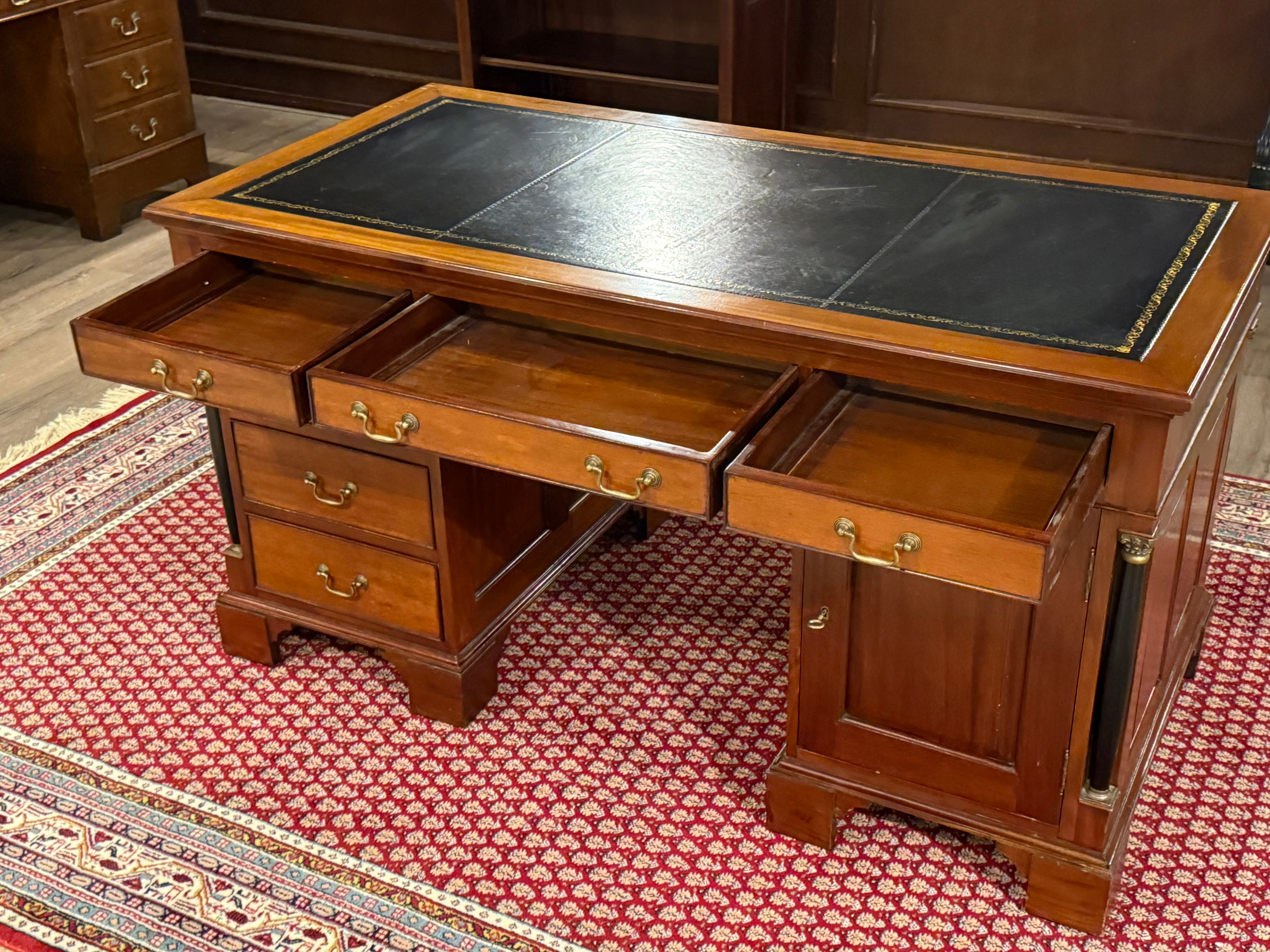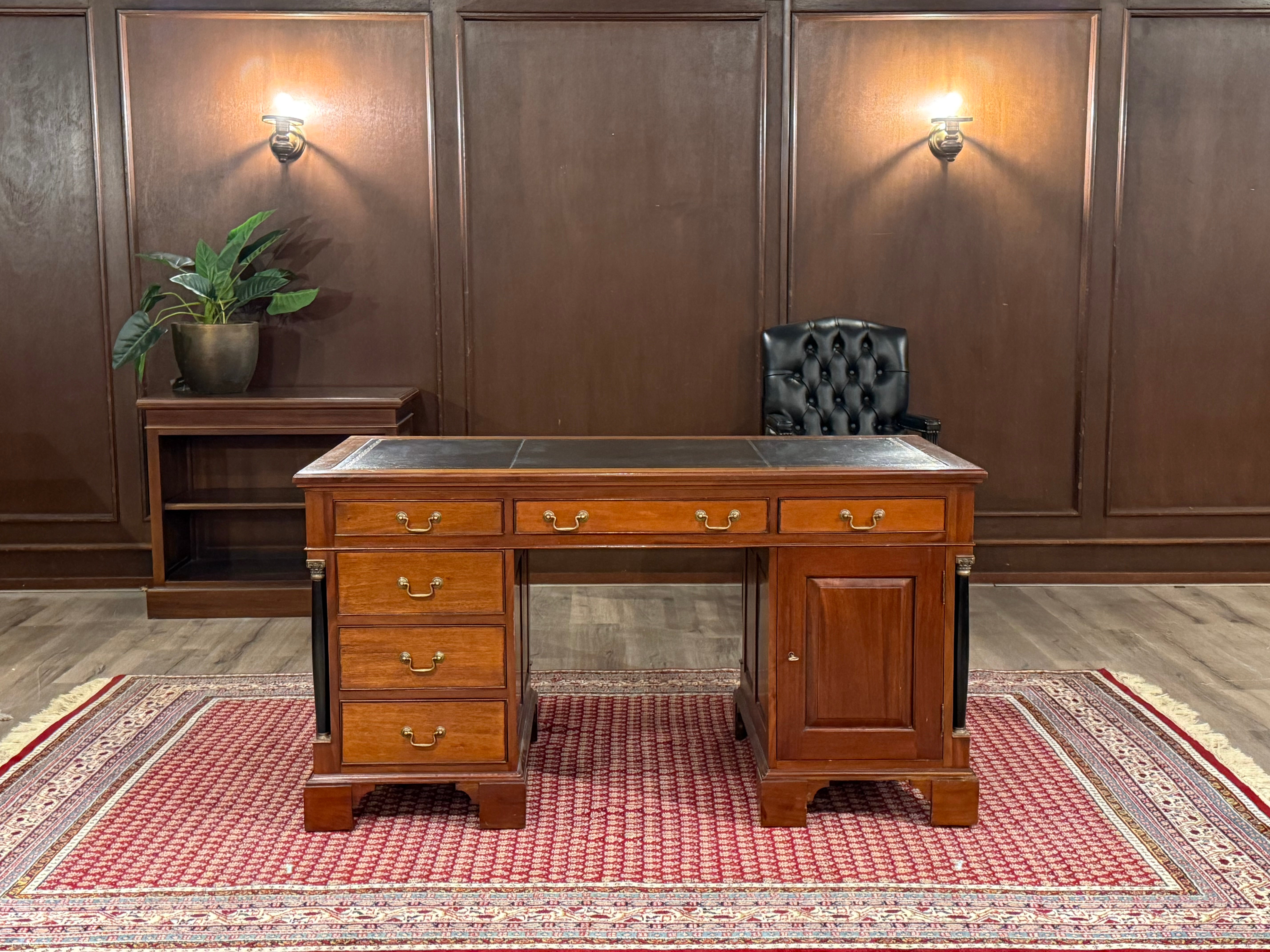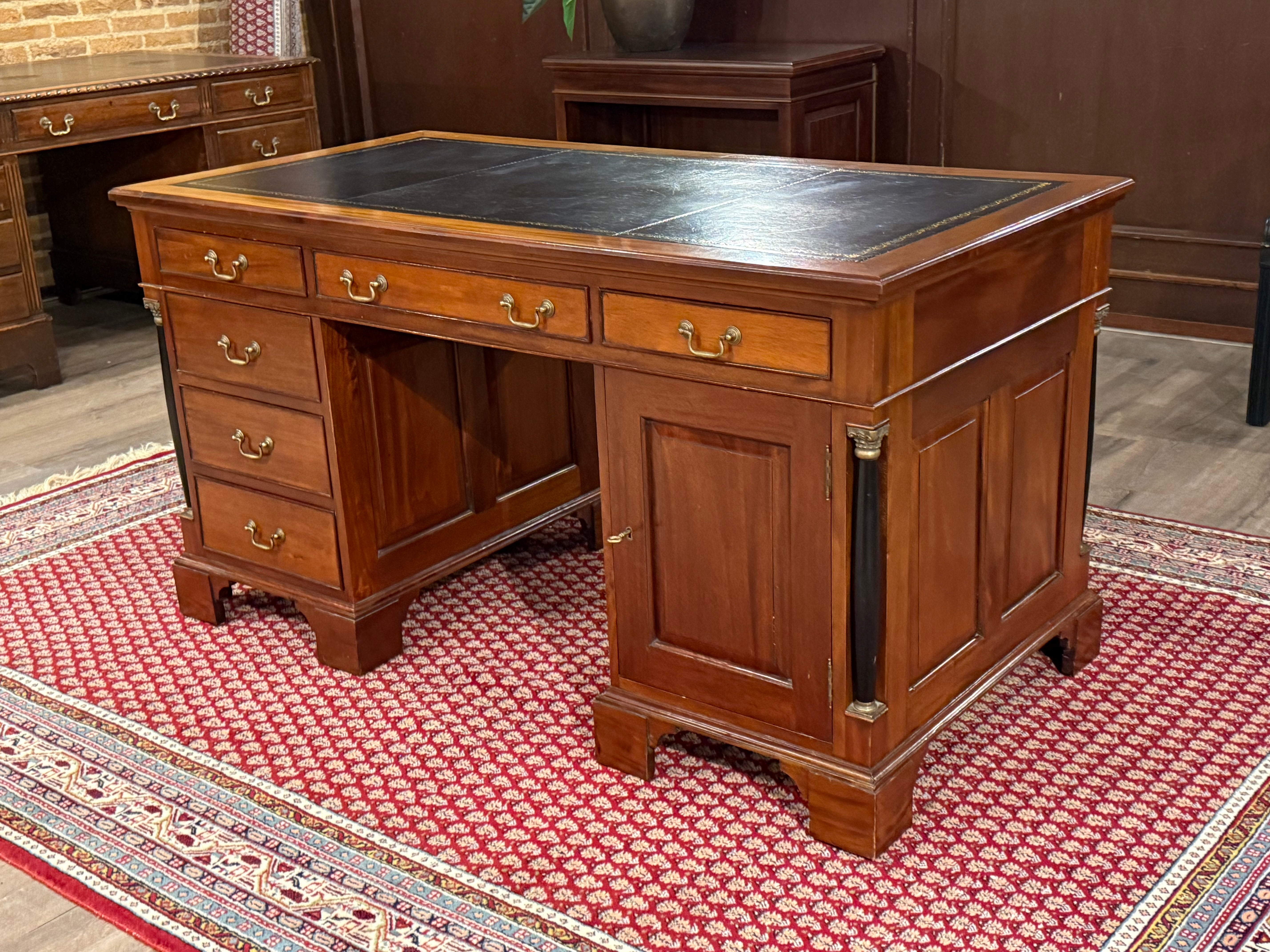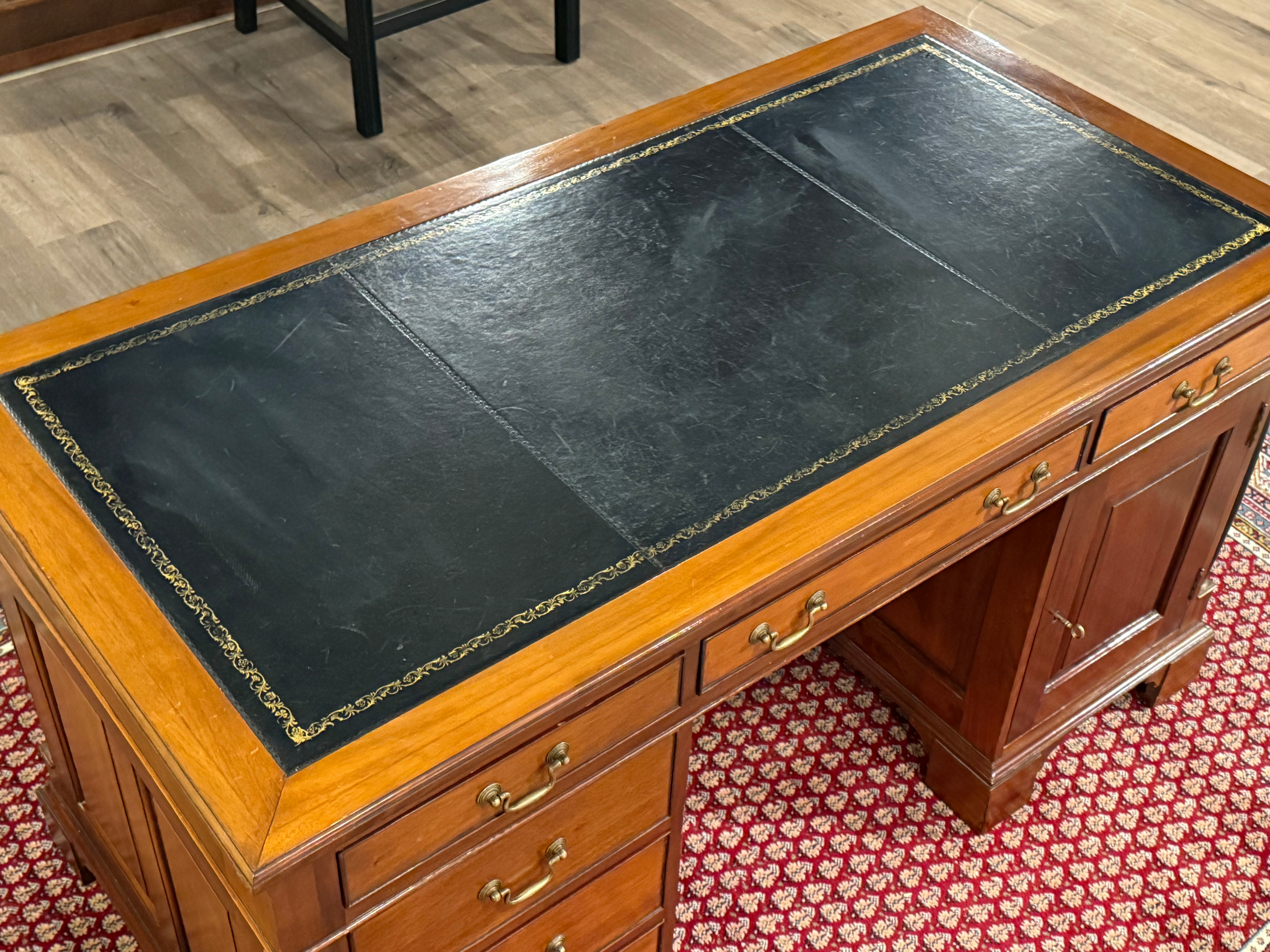 Vintage bureau, klassiek Engels bureau, mahoniehout, donkerblauw leer, 533