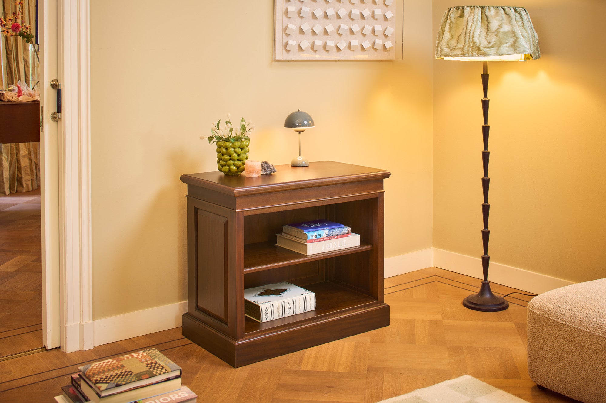 Deze stijlvolle sidetable combineert tijdloze charme met praktische functionaliteit. Het open ontwerp met een middelste schap biedt volop ruimte voor decoratieve items of handige opbergruimte. Gemaakt van massief hout en afgewerkt met oog voor detail, voegt dit meubel een vleugje elegantie toe aan elk interieur.
