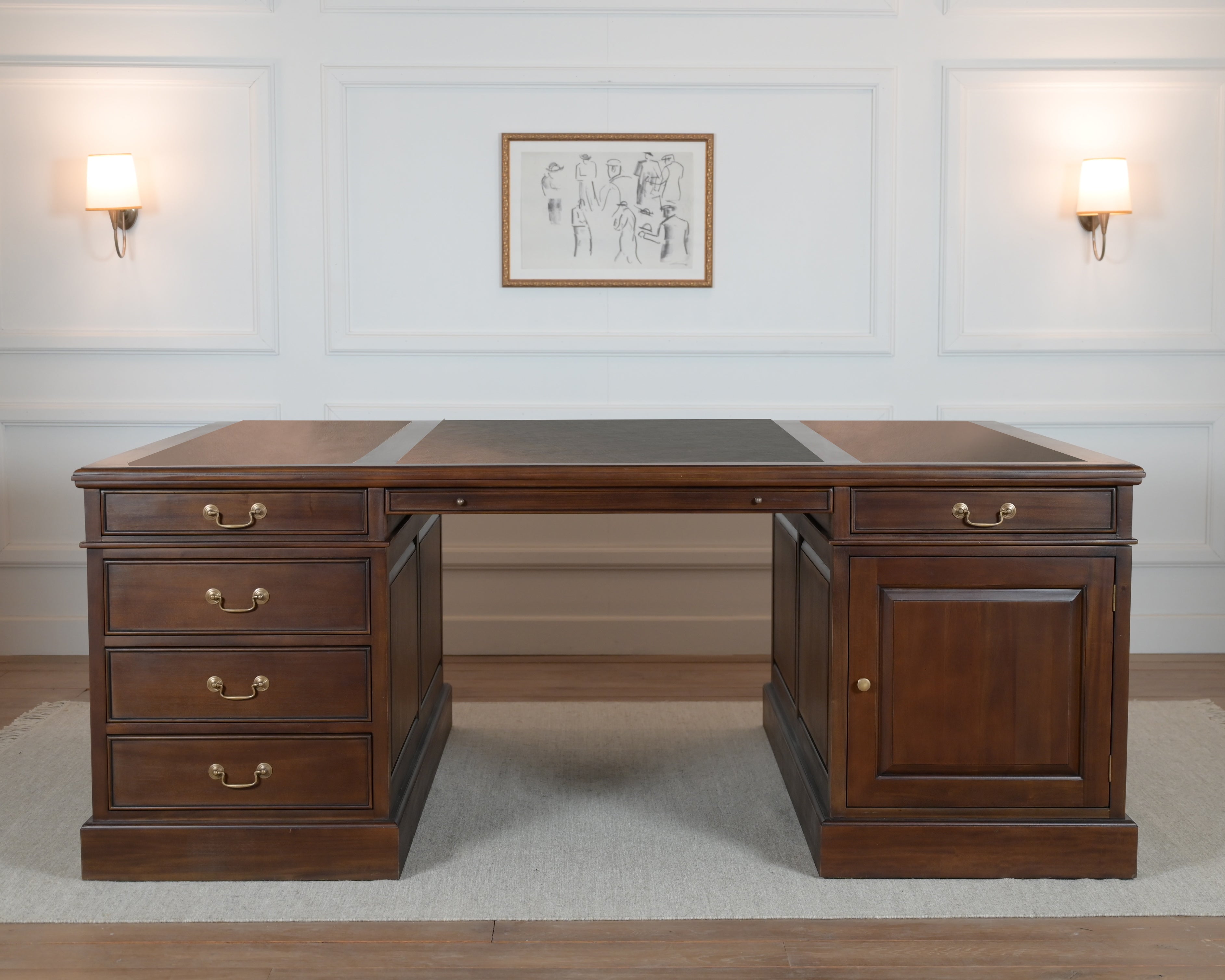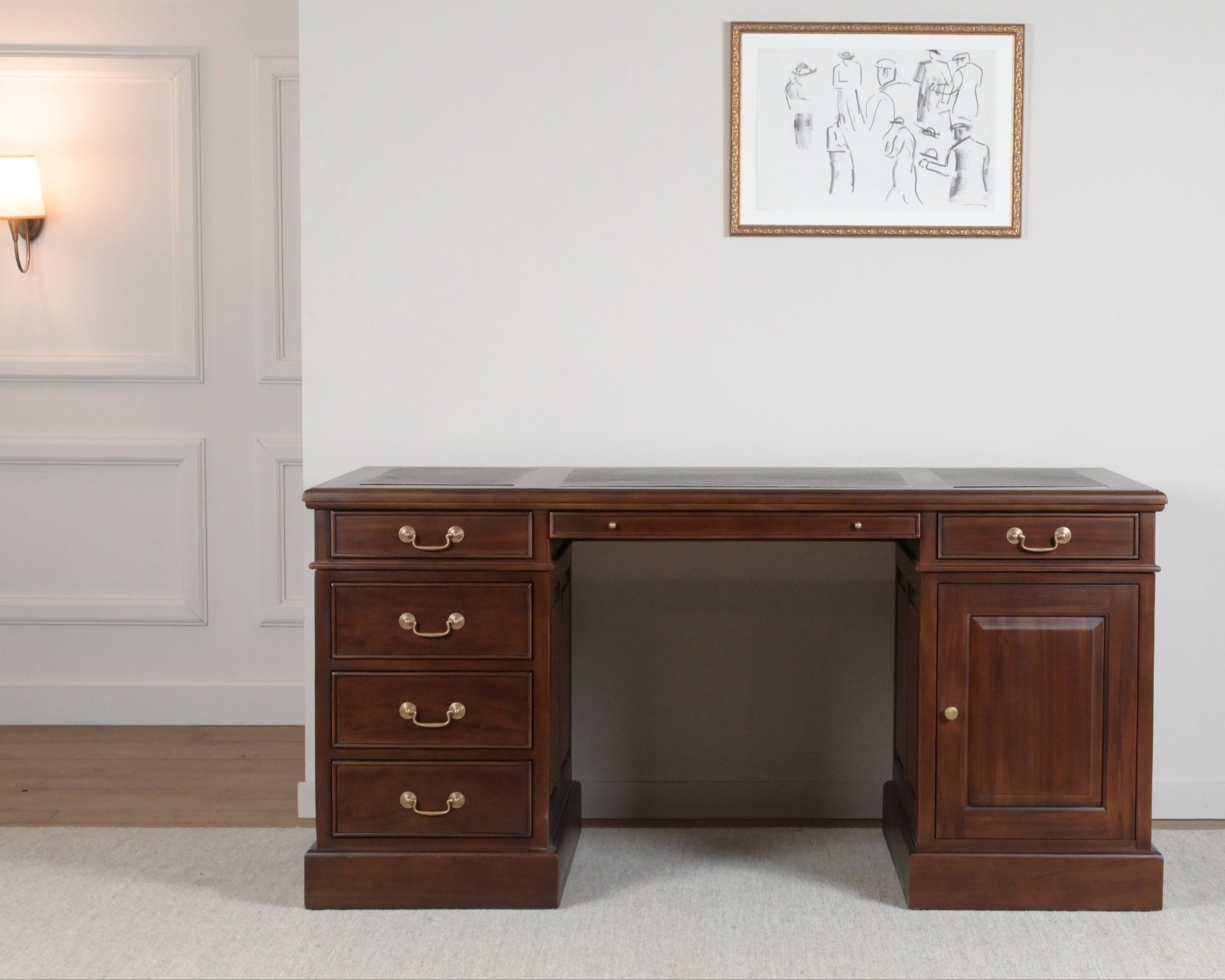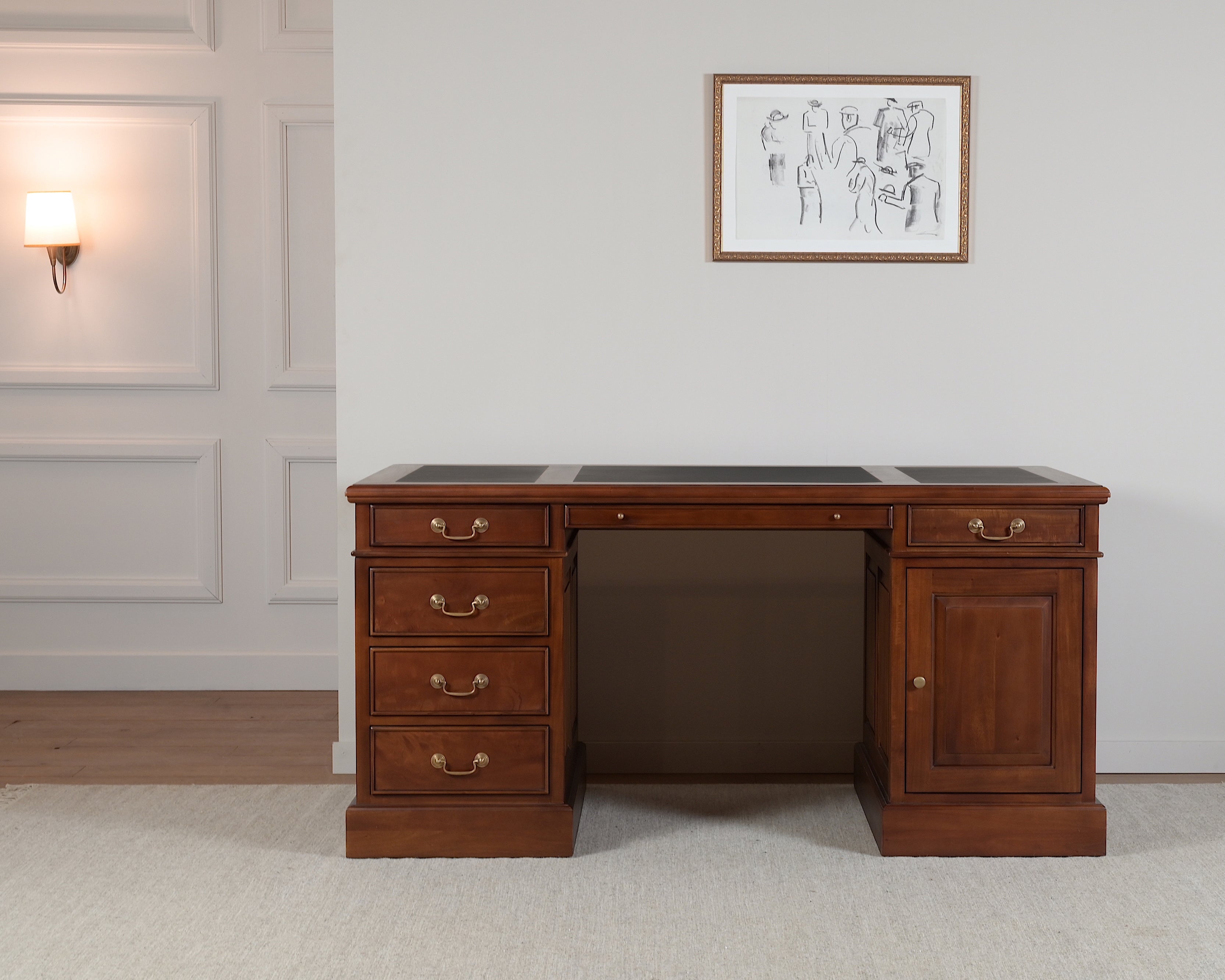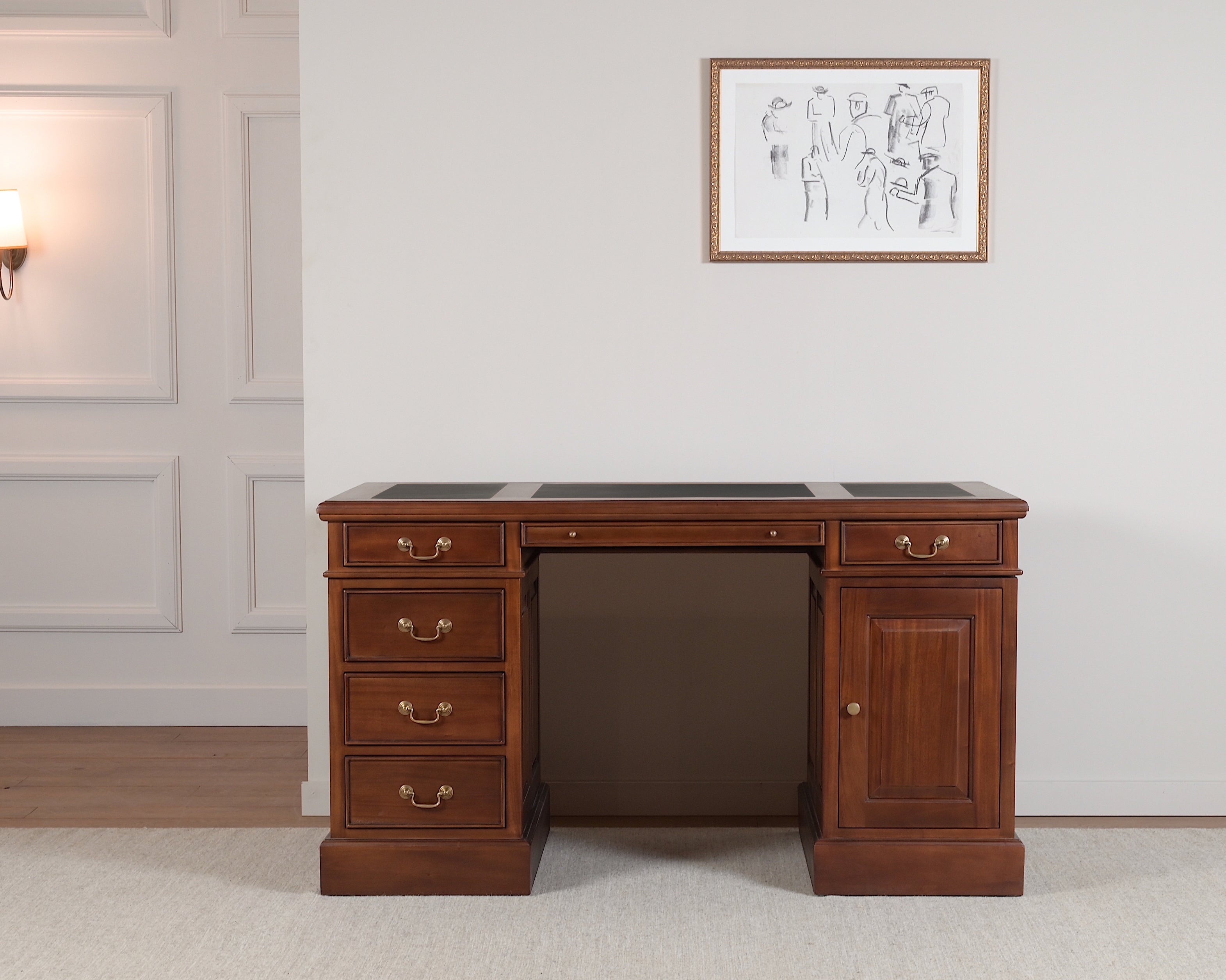 Het bureau is voorzien van een blad dat met zorg is ingelegd met echt kalfleer, verdeeld over drie vakken. Deze fijne ondergrond biedt optimaal comfort tijdens het schrijven.