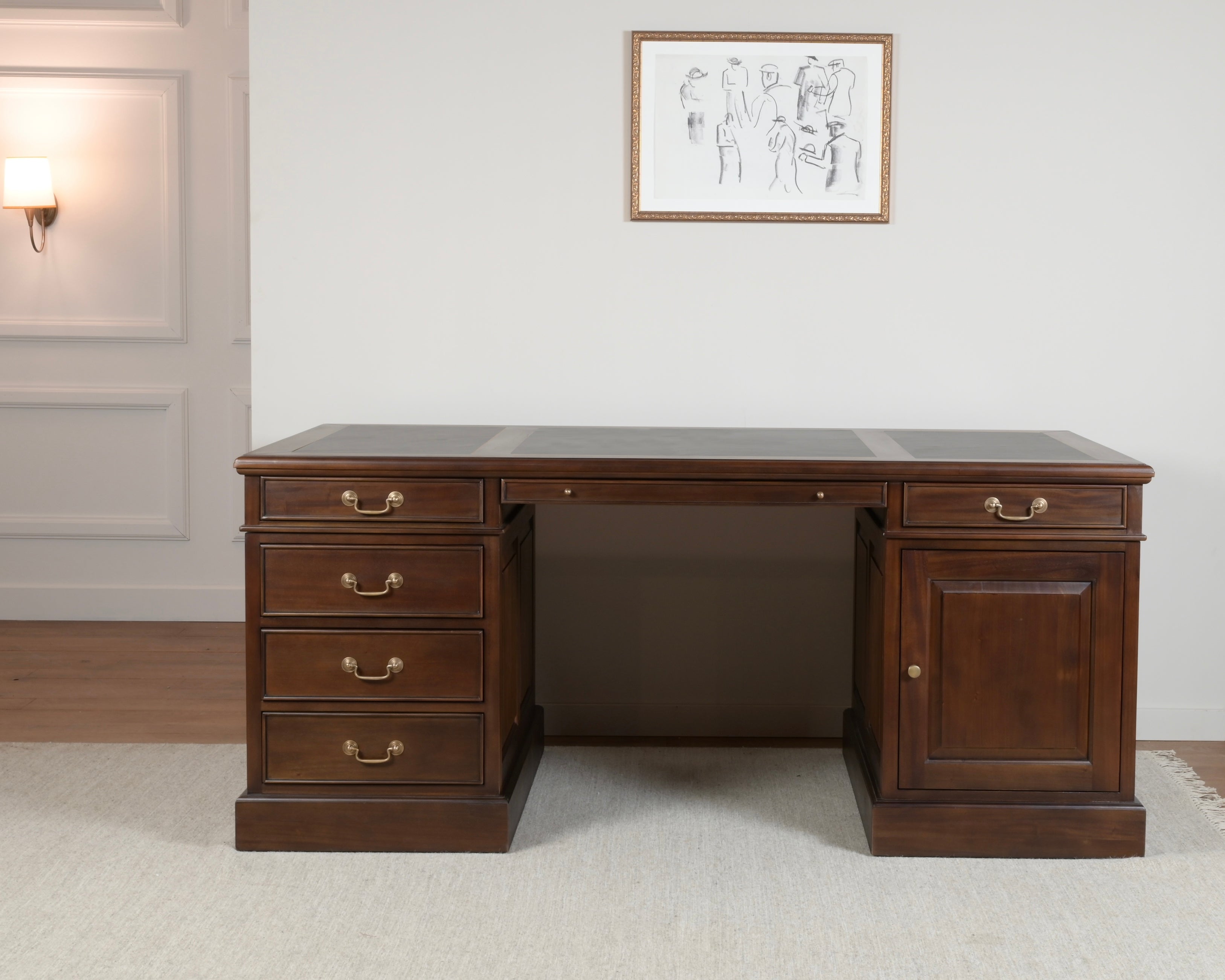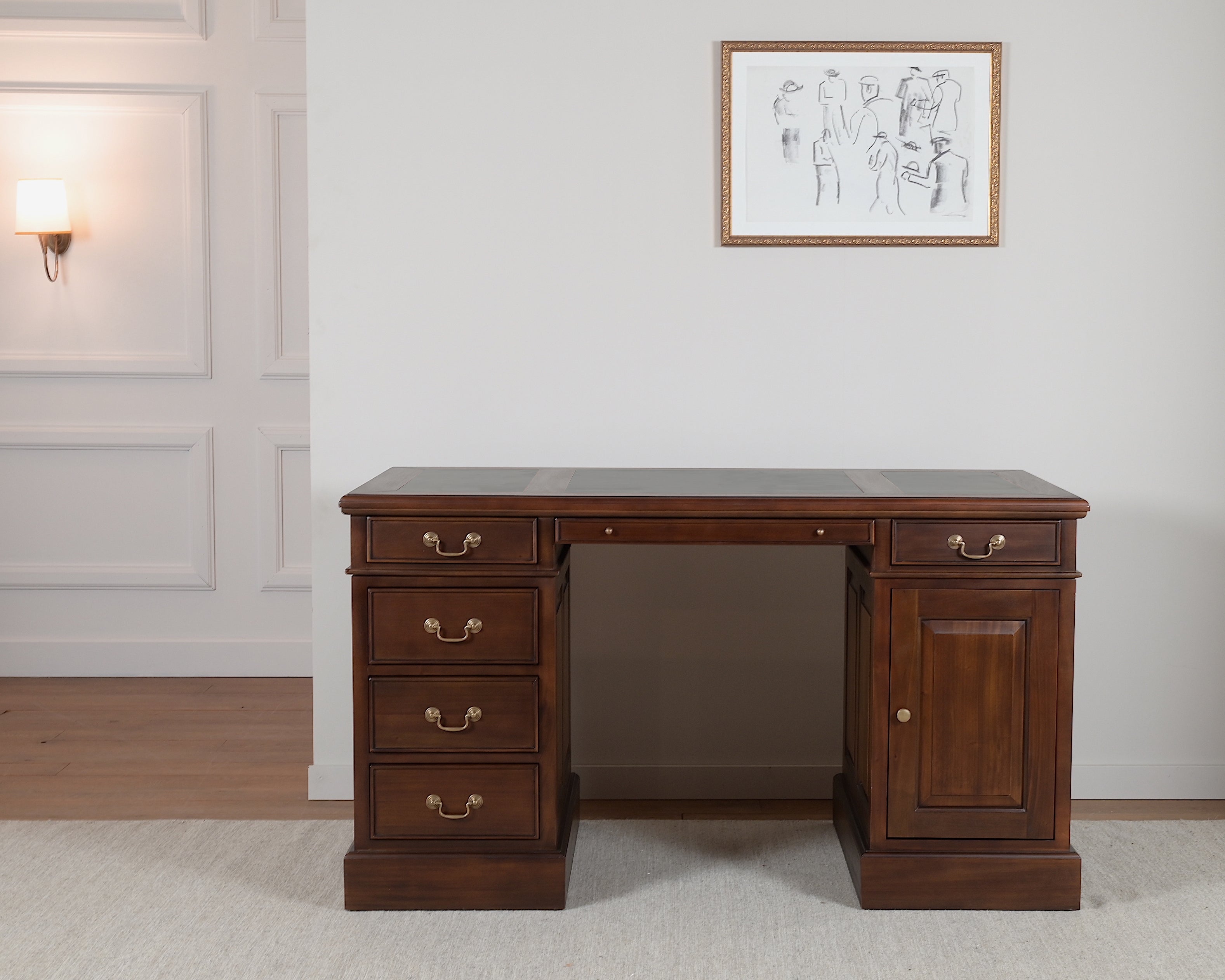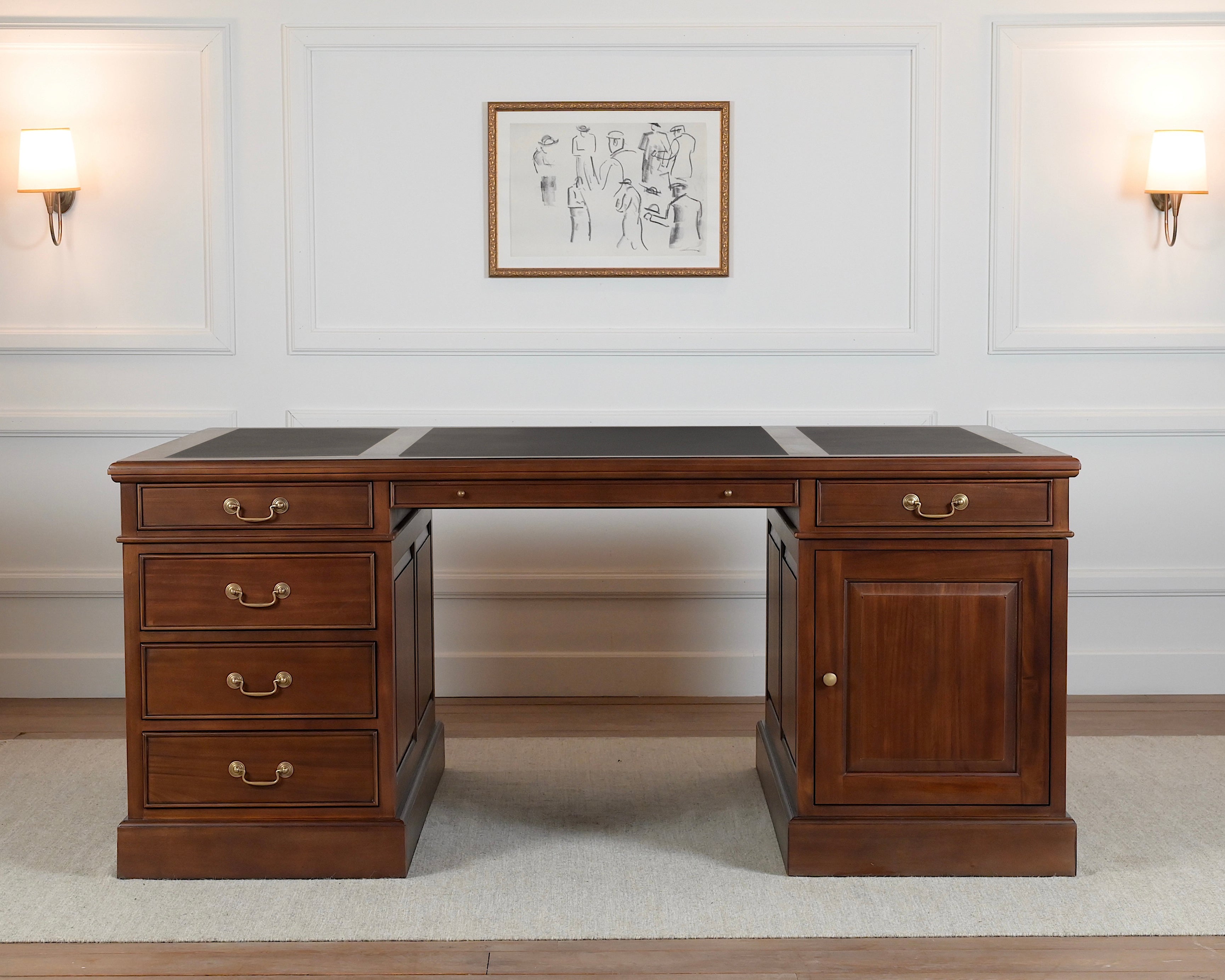 Voor de inleg van het blad van dit bureau wordt kalfsleer uit Engeland gebruikt. Het zorgt voor een fijne ondergrond tijdens het schrijven en draagt bij aan een verfijnde, klassieke esthetiek.