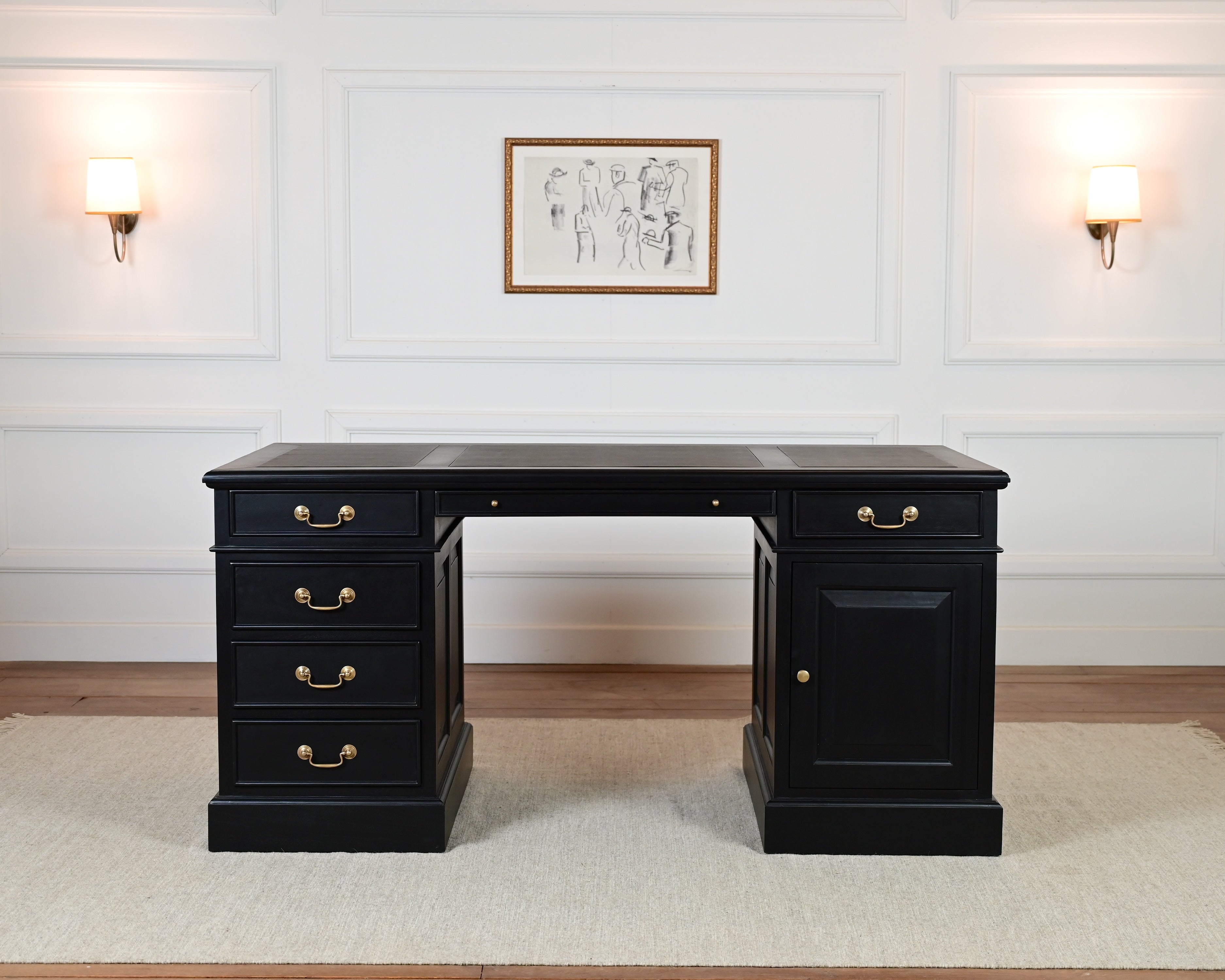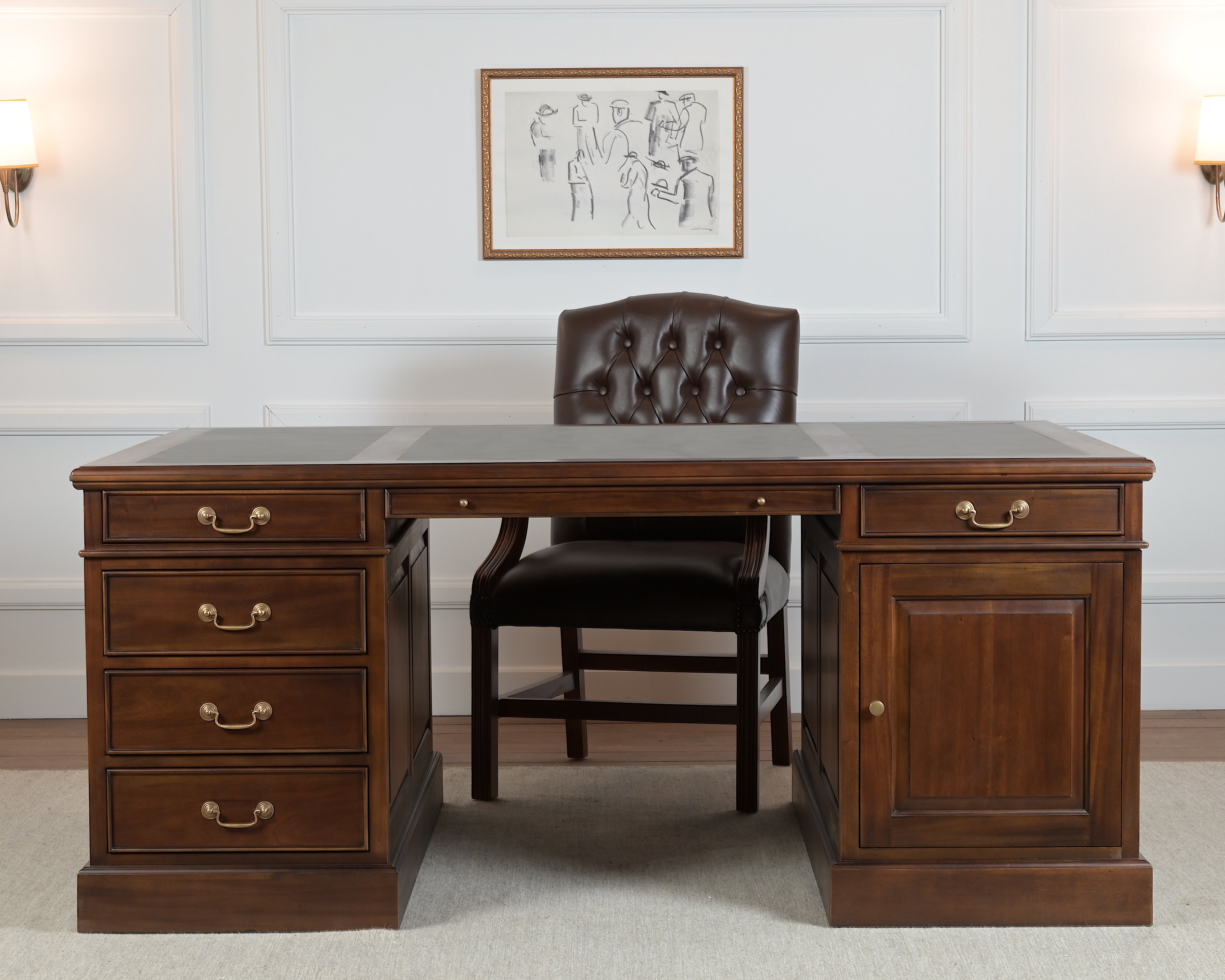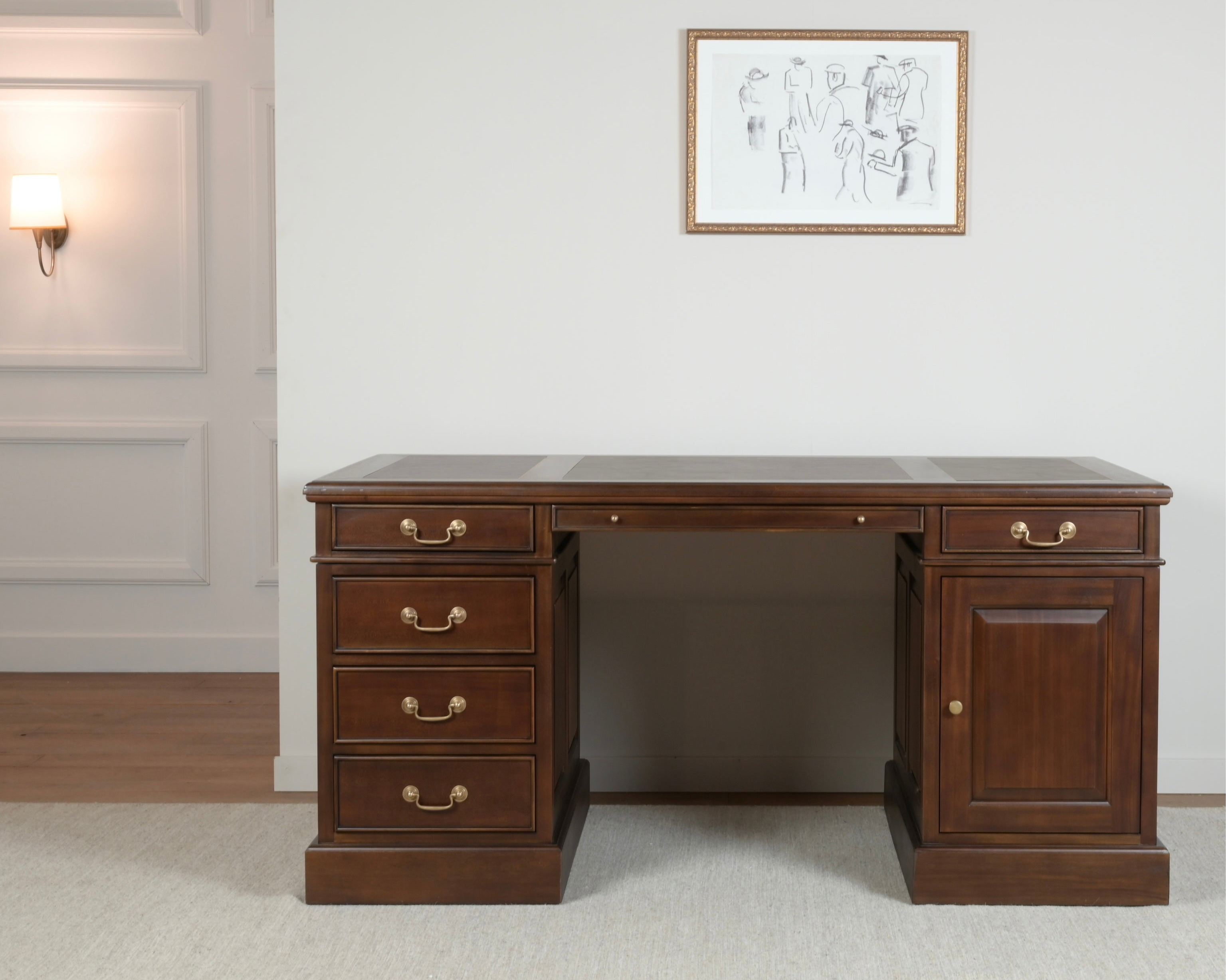 Voor de inleg van het blad van dit bureau wordt kalfsleer uit Engeland gebruikt. Het zorgt voor een fijne ondergrond tijdens het schrijven en draagt bij aan een verfijnde, klassieke esthetiek.