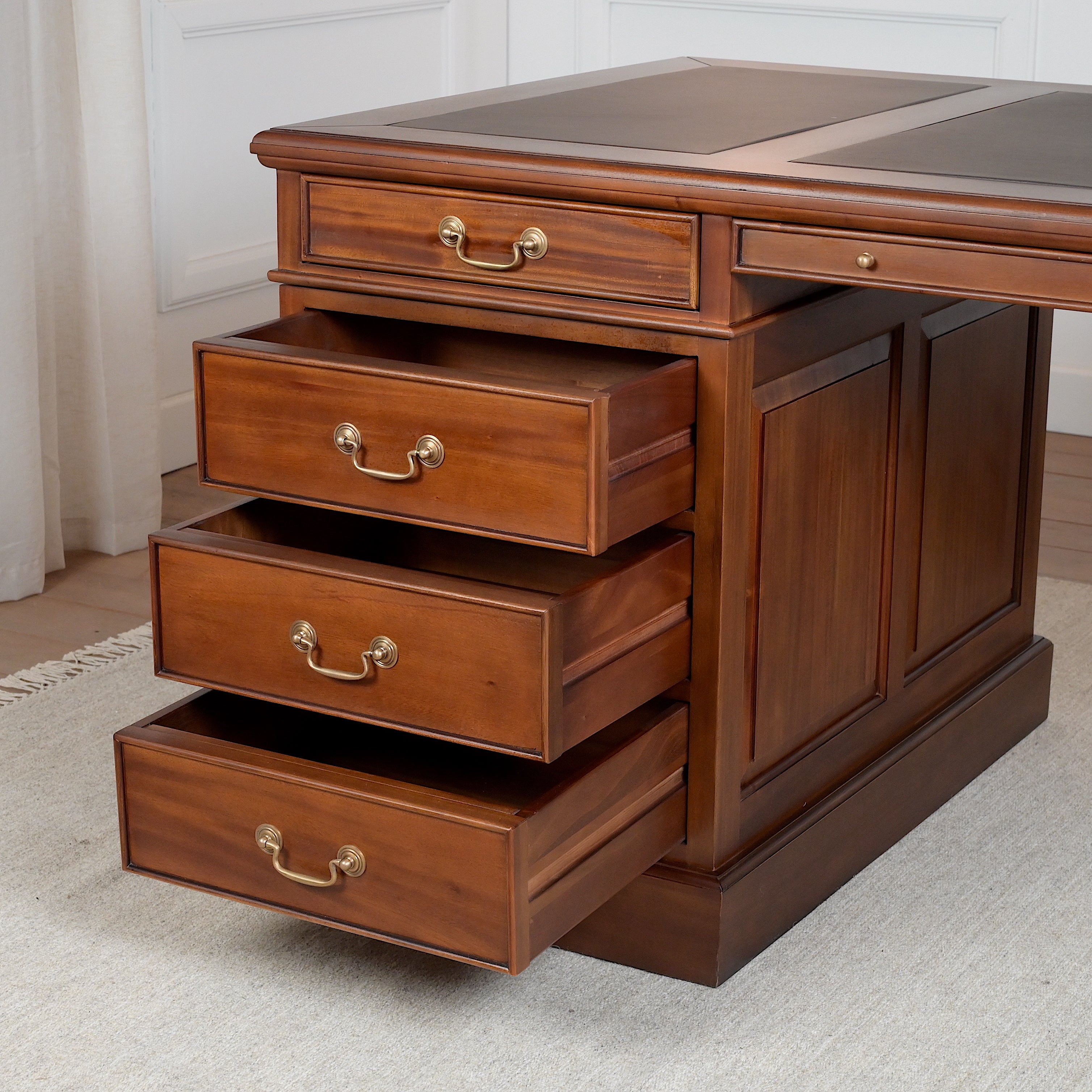 De Regent desk is gemaakt van hoogwaardig mahoniehout. De warme kleur en fijne nerf geven het bureau een klassieke uitstraling, waardoor het perfect past in tijdloze interieurs. Mahoniehout wordt al eeuwenlang gebruikt voor kwaliteitsmeubels en draagt bij aan de elegante en solide vormgeving van dit bureau.