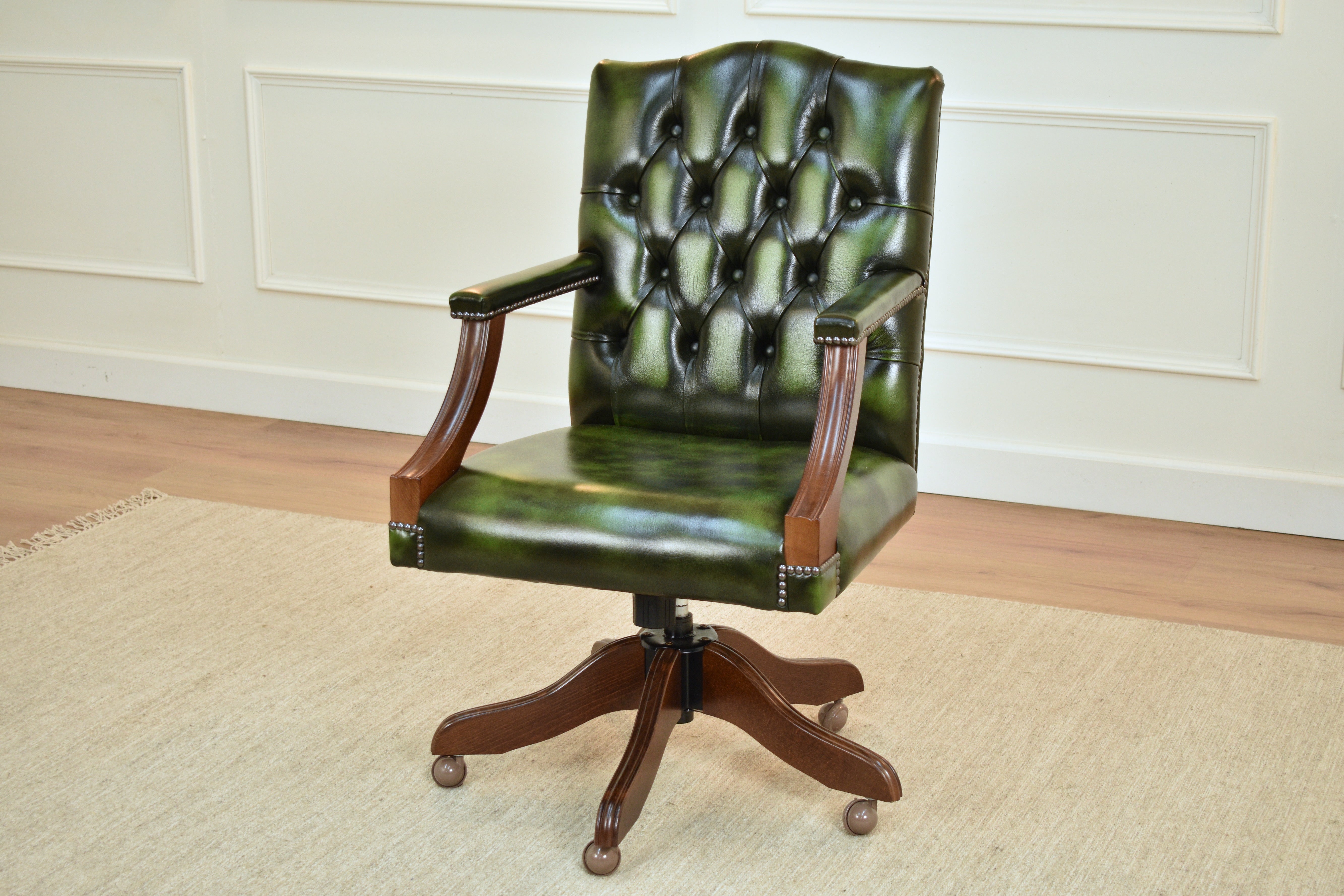 Deze Chesterfield bureaustoel met zwart leer combineert klassieke elegantie met moderne functionaliteit. De diepe capitonnage en zwarte lederen bekleding stralen tijdloze charme uit, terwijl verstelbare zithoogte en wieltjes zorgen voor comfort en praktisch gebruik. Een stijlvol pronkstuk voor elke werkomgeving.