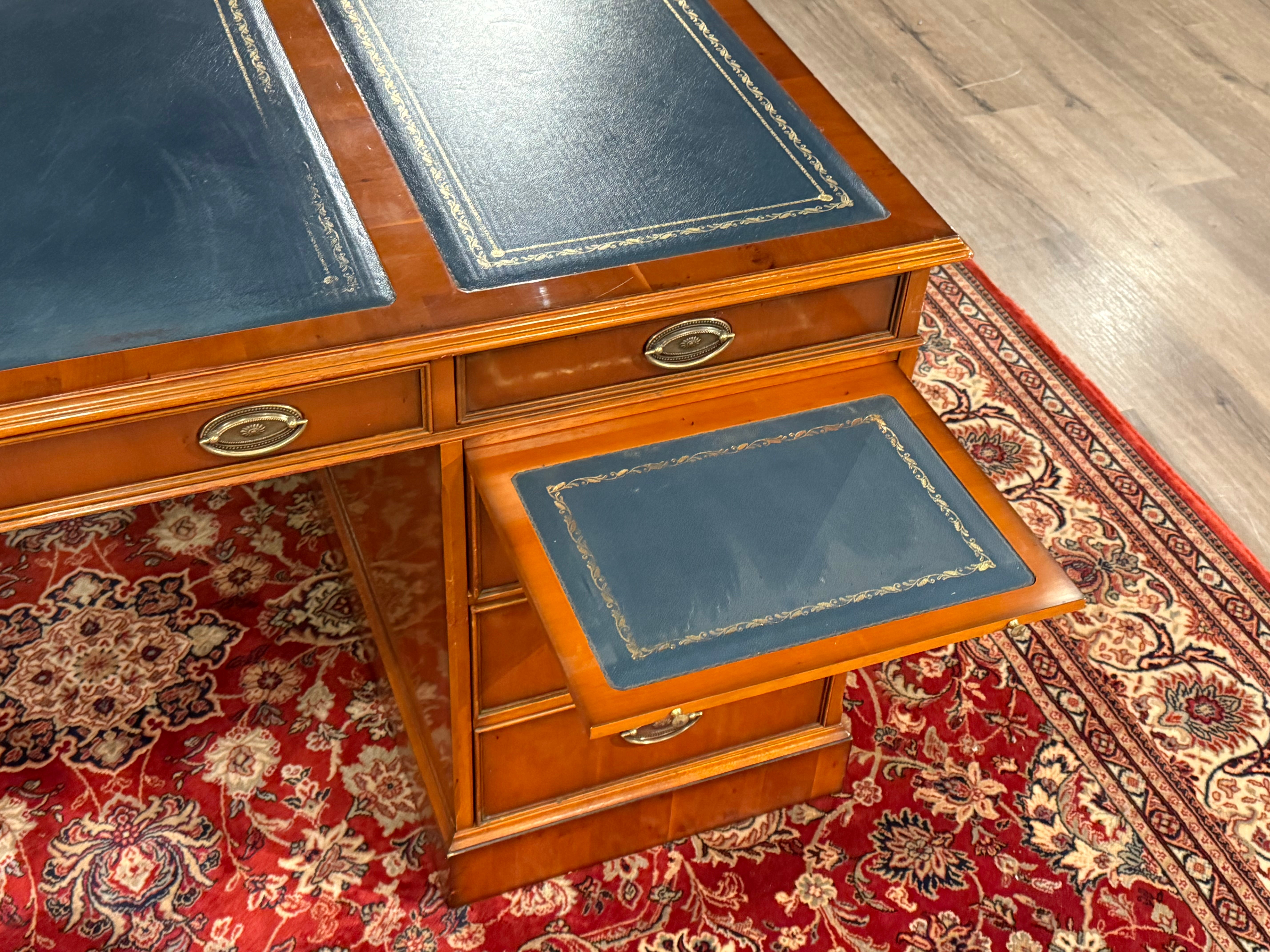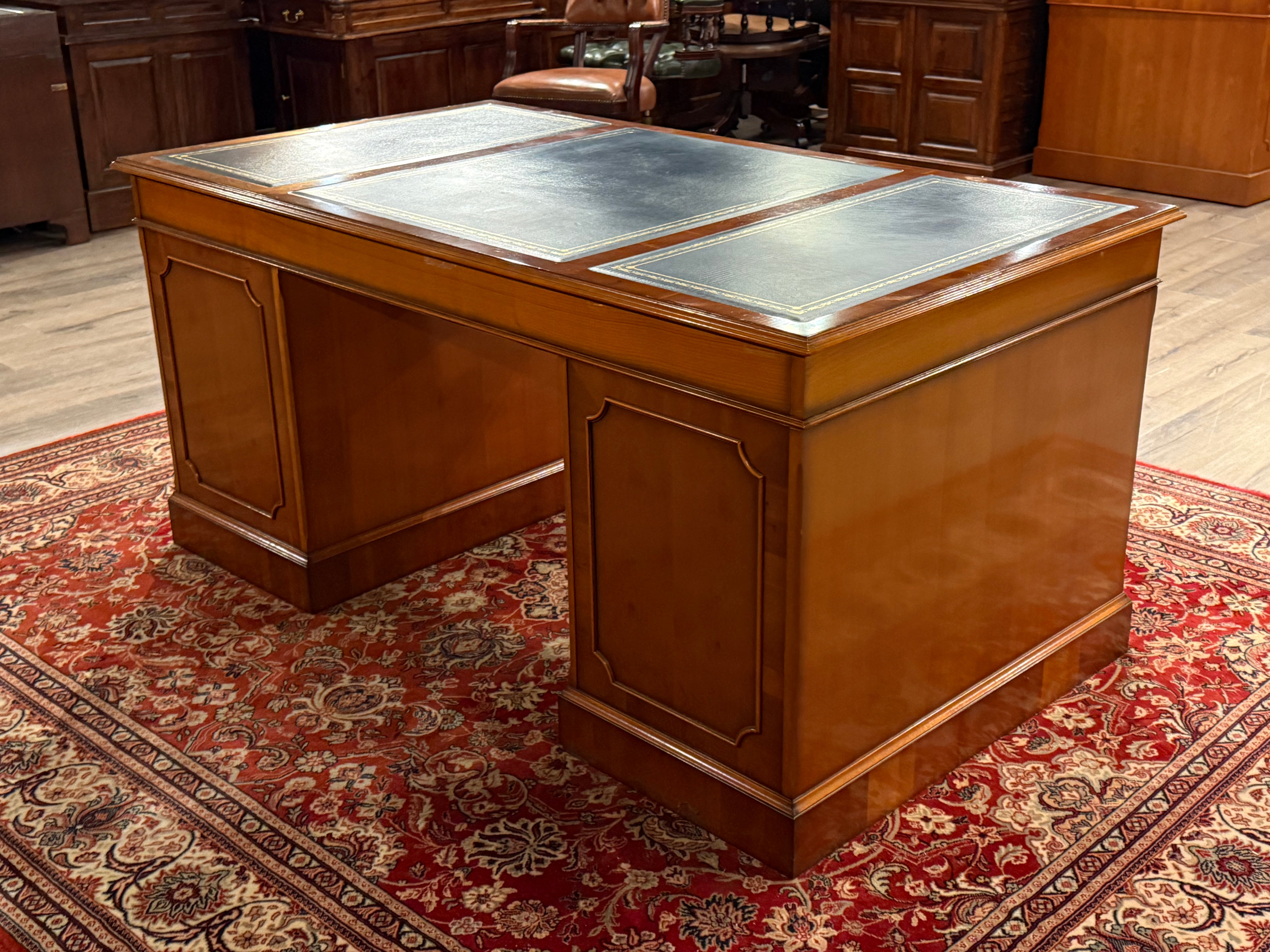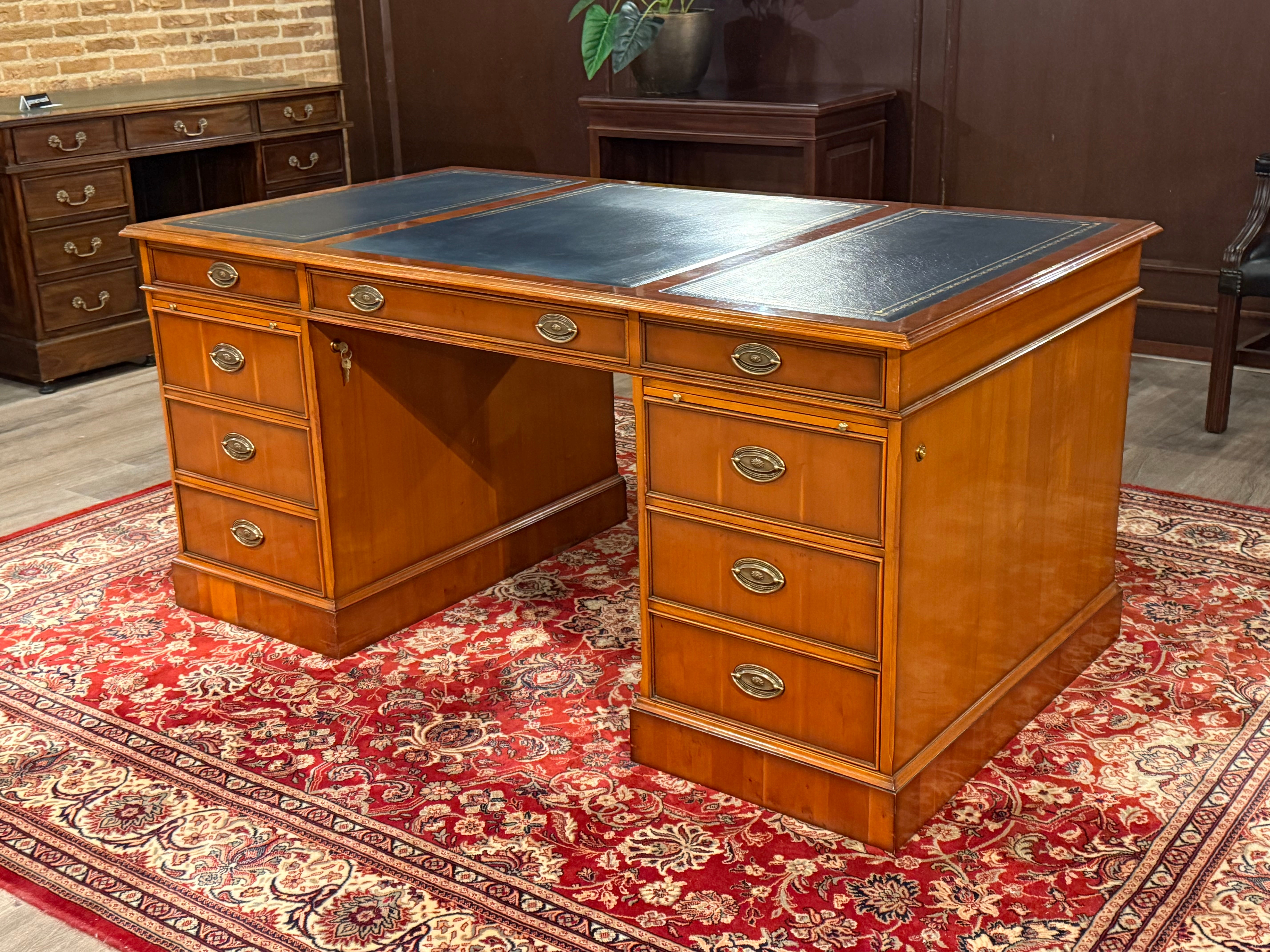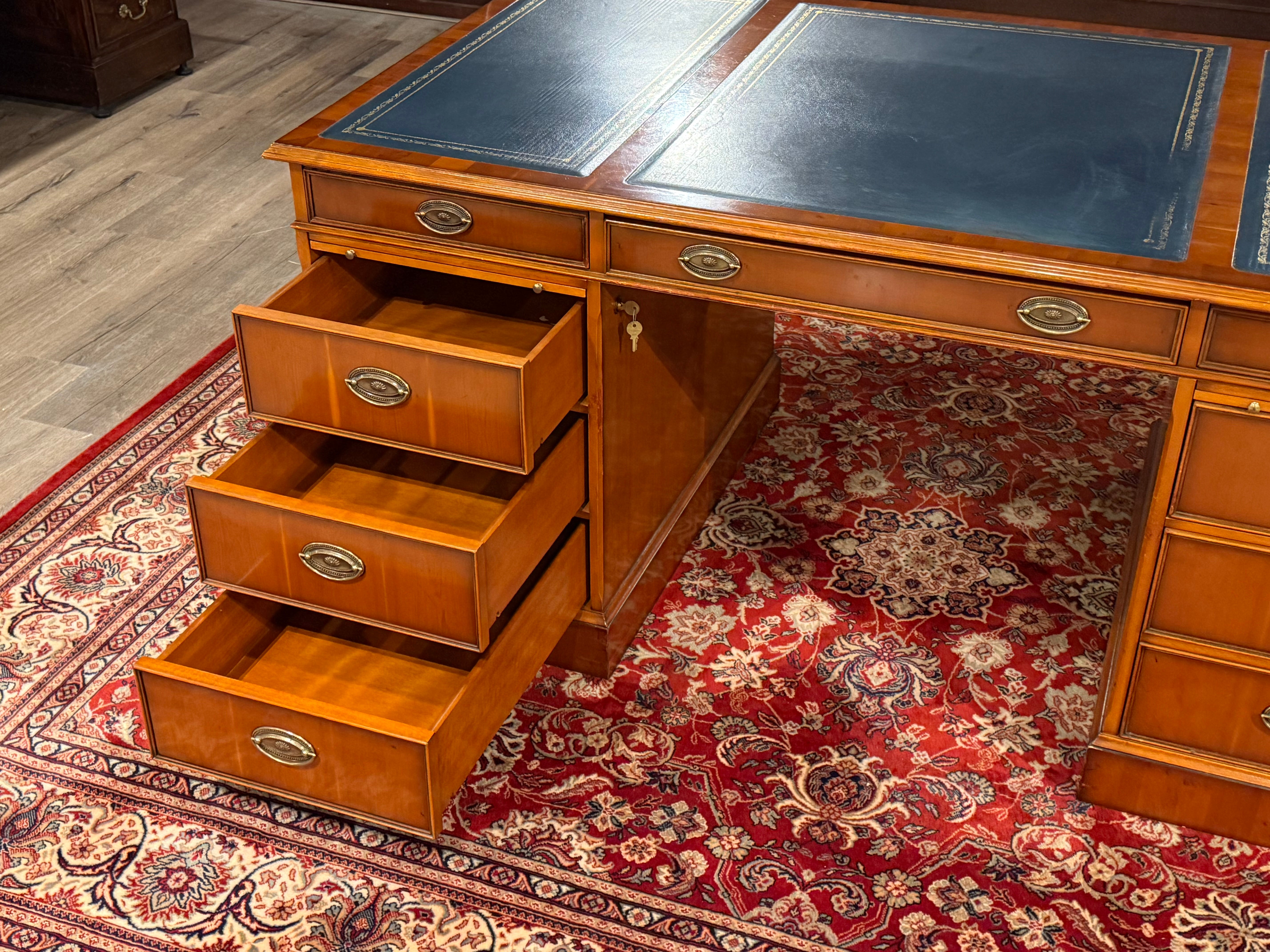 Vintage Bureau 455 - Klassiek Engels bureau, Blauw leer, Messing grepen, licht kersen hout, Heldense