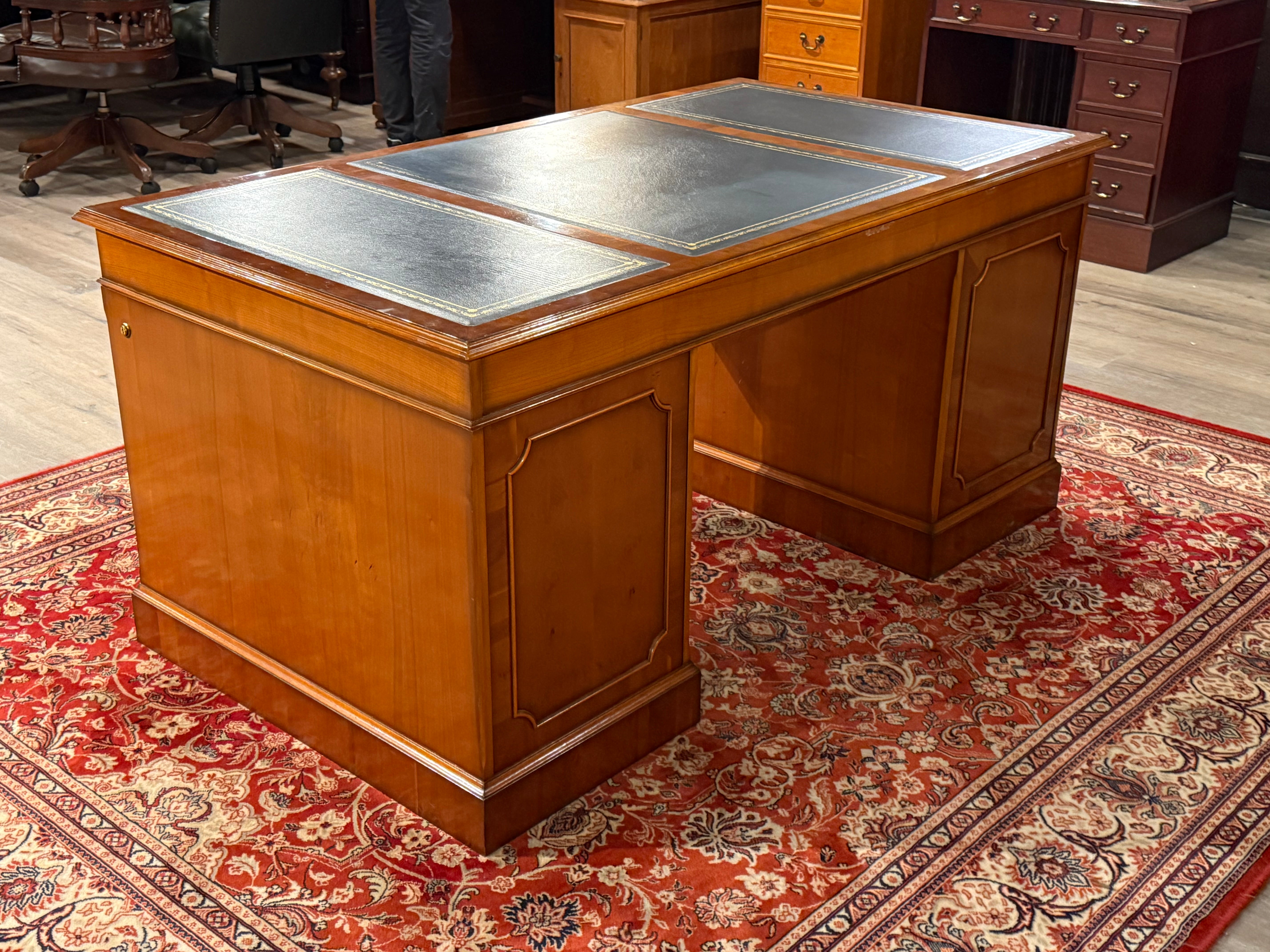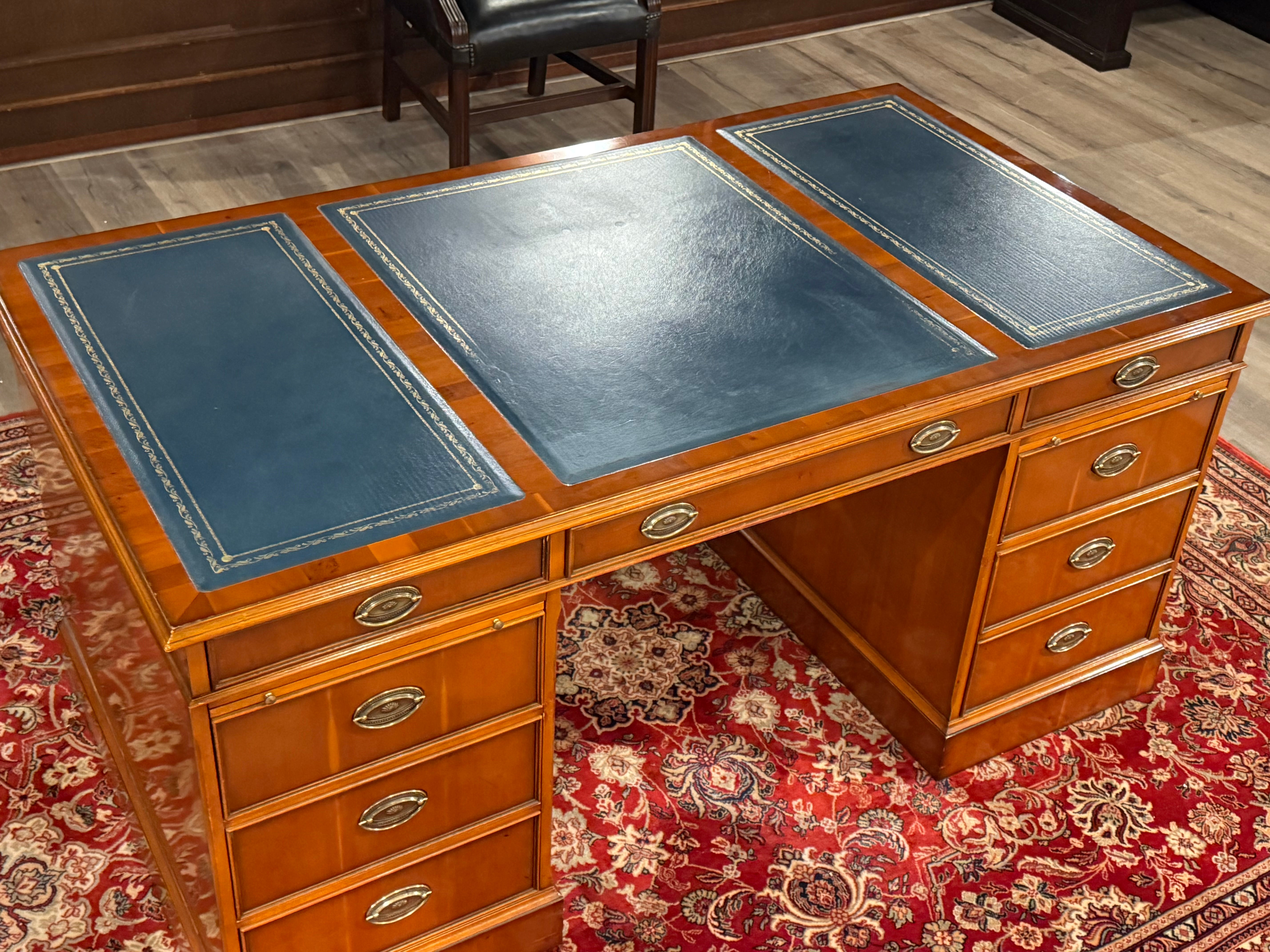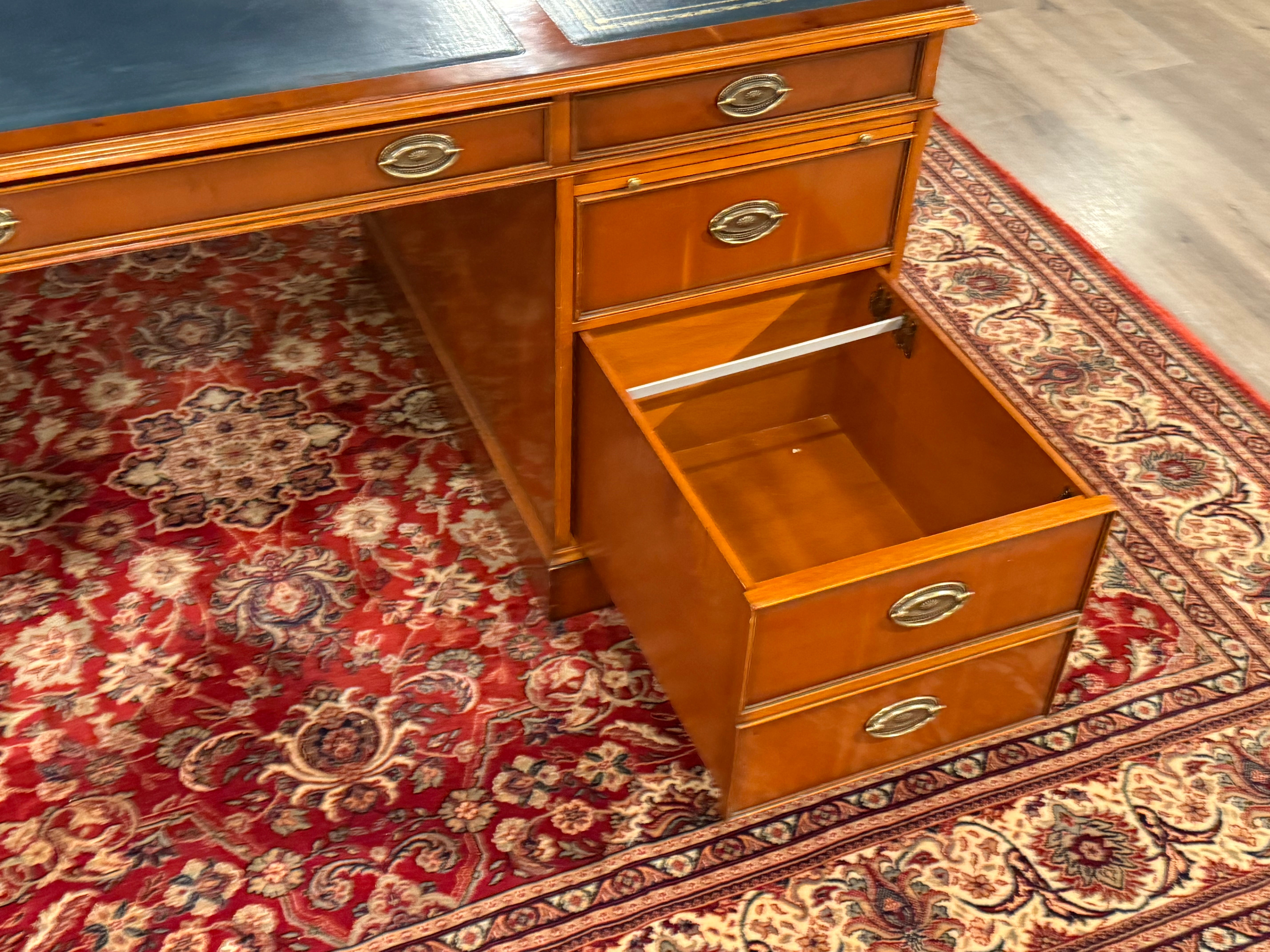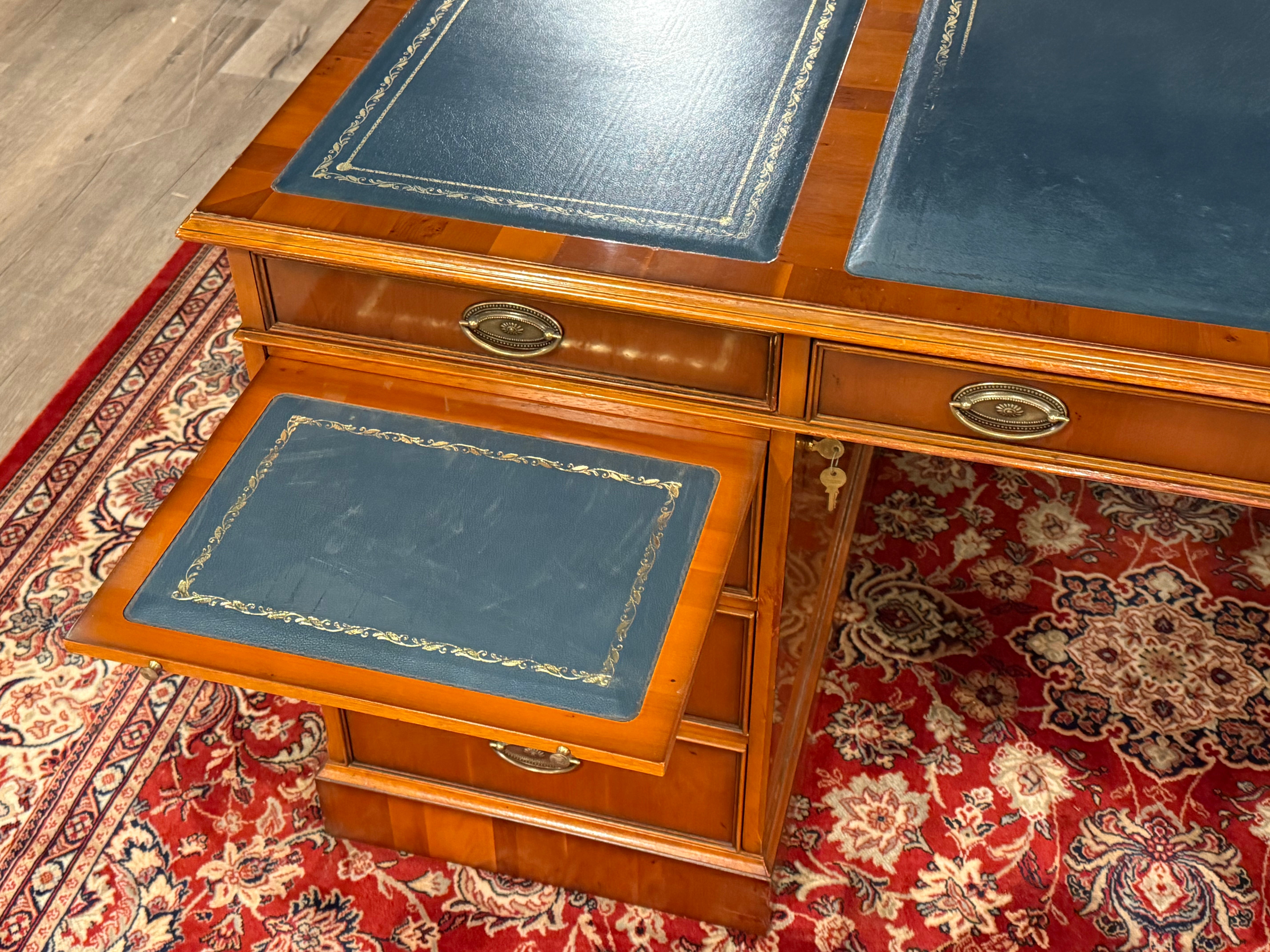 Vintage Bureau 455 - Klassiek Engels bureau, Blauw leer, Messing grepen, licht kersen hout, Heldense