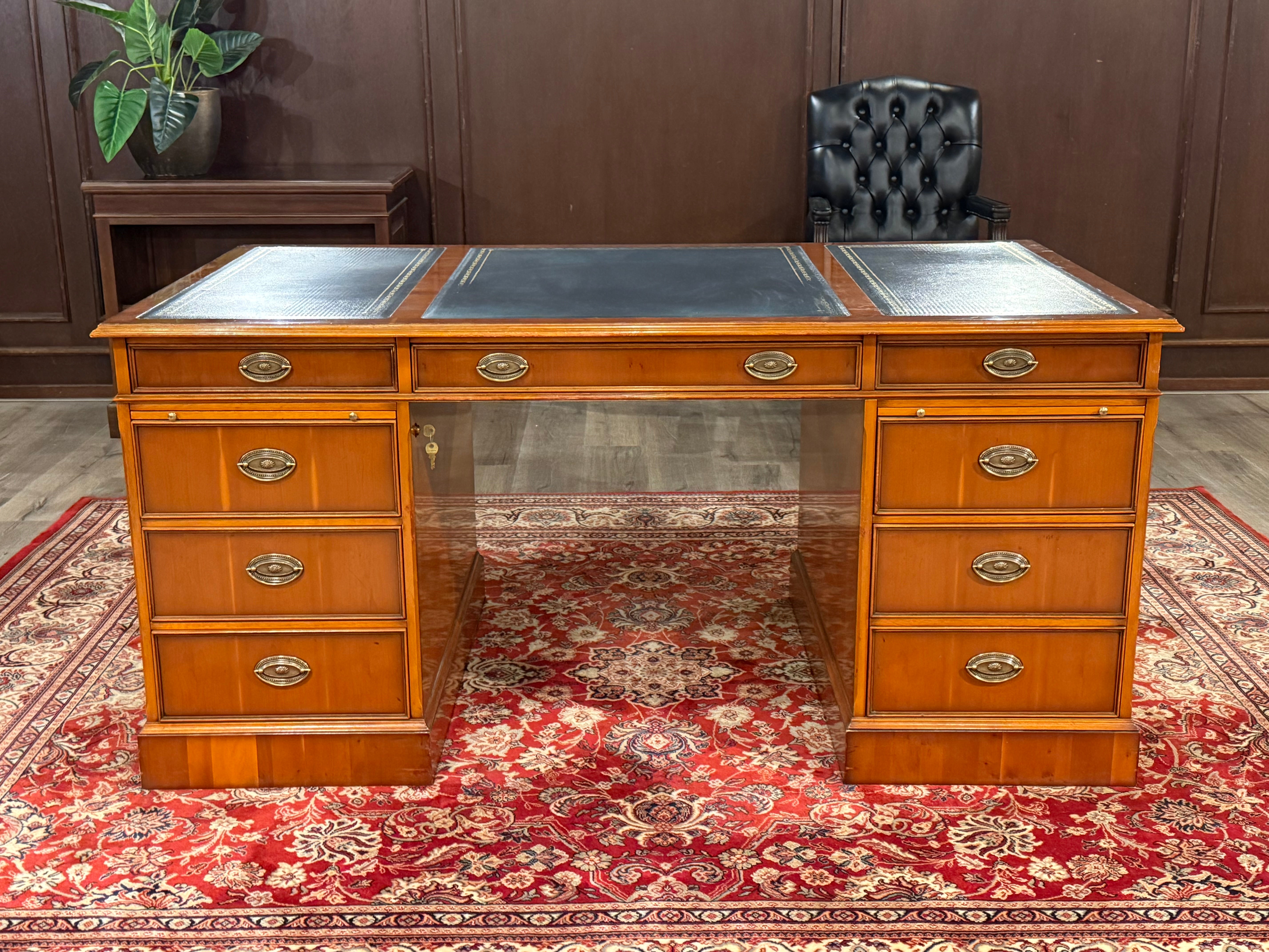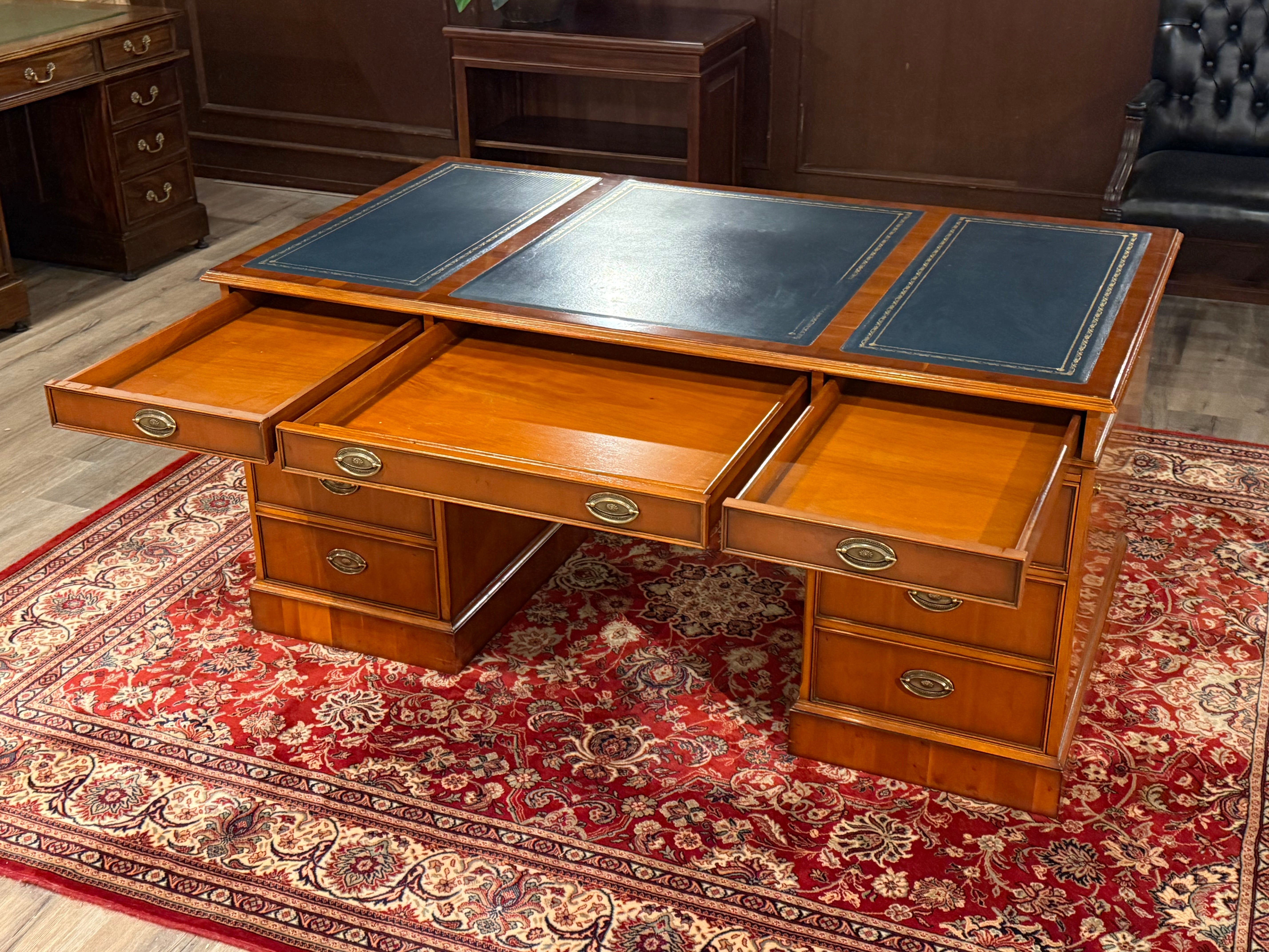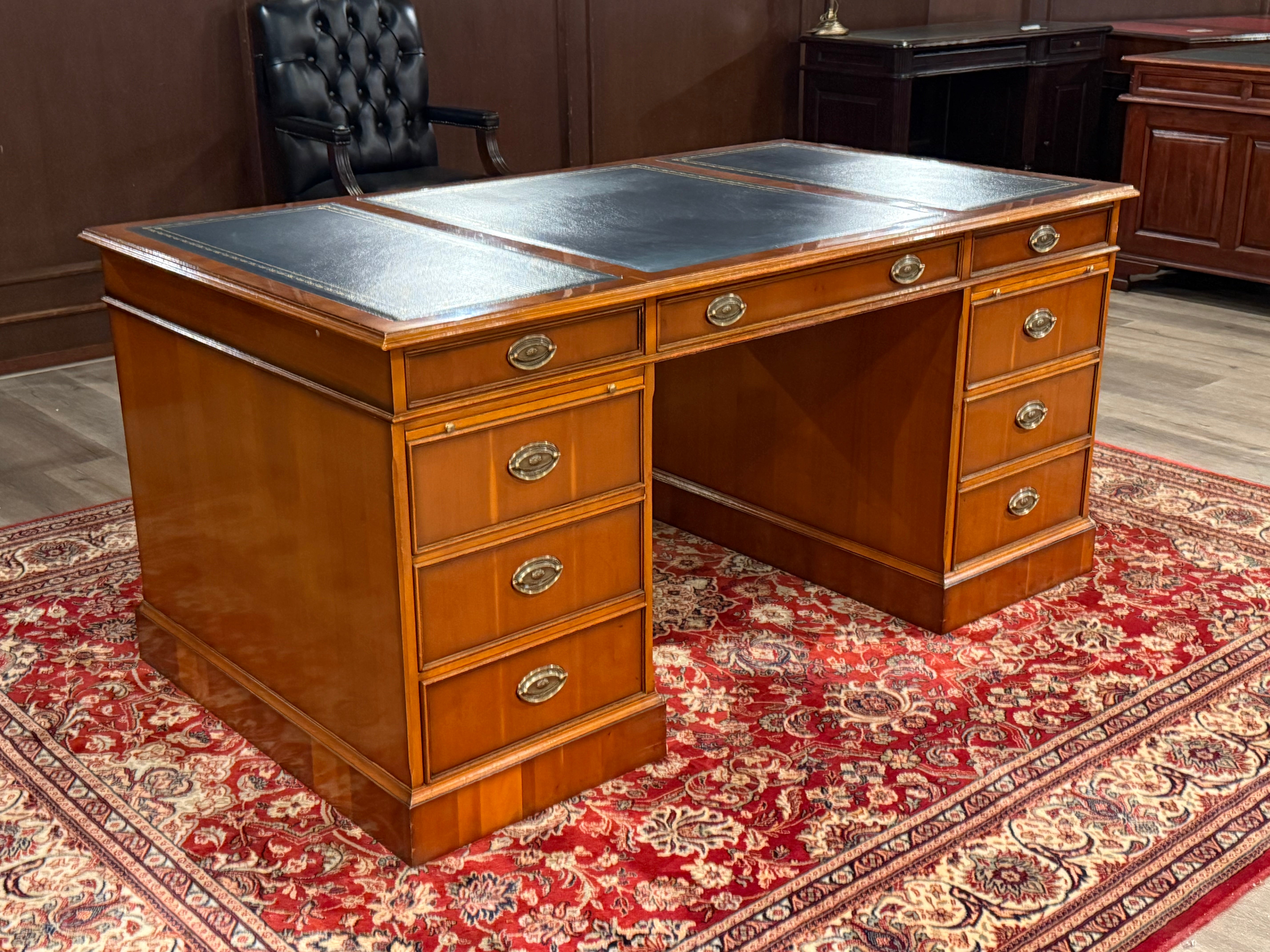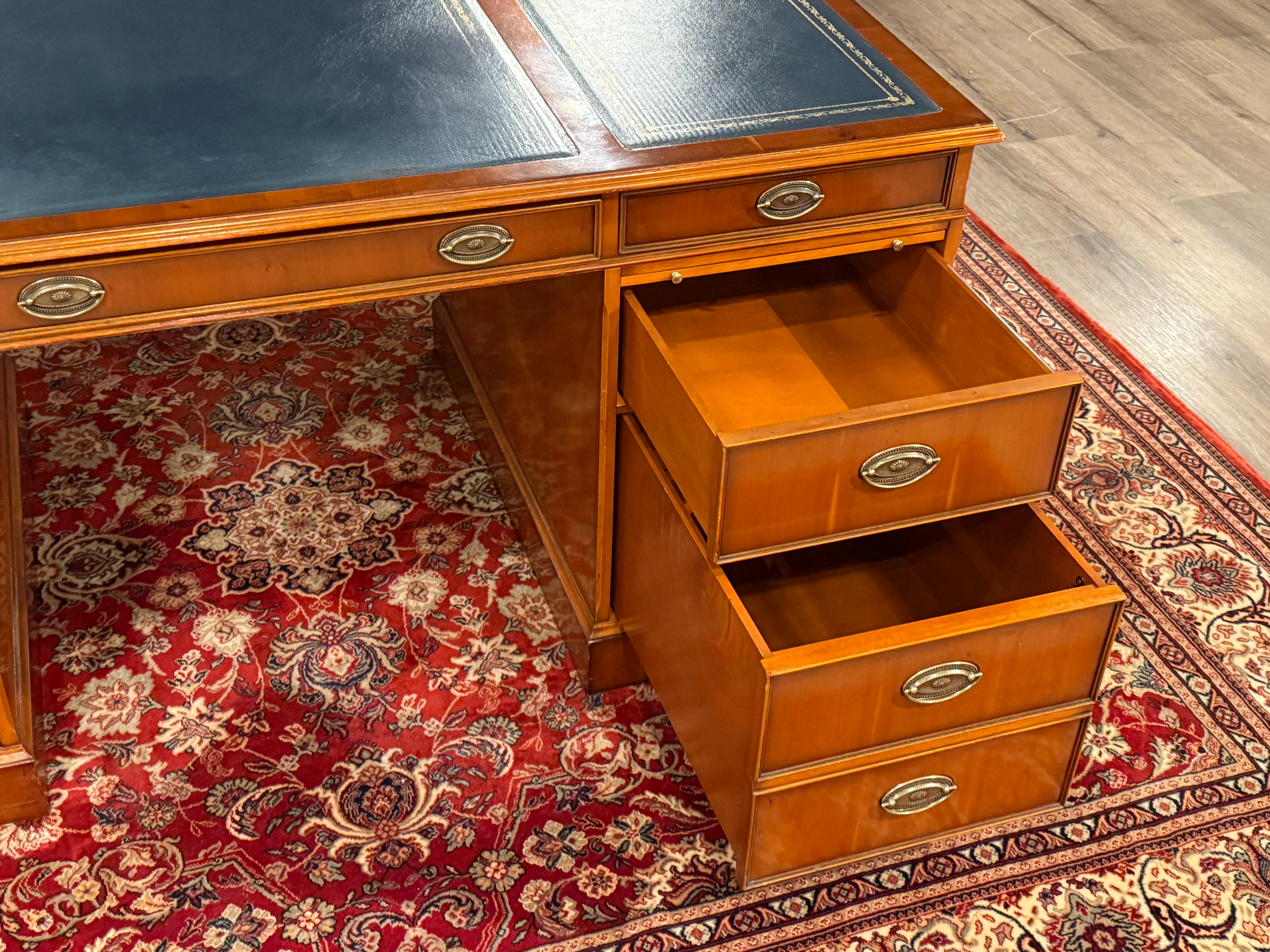 Vintage Bureau 455 - Klassiek Engels bureau, Blauw leer, Messing grepen, licht kersen hout, Heldense