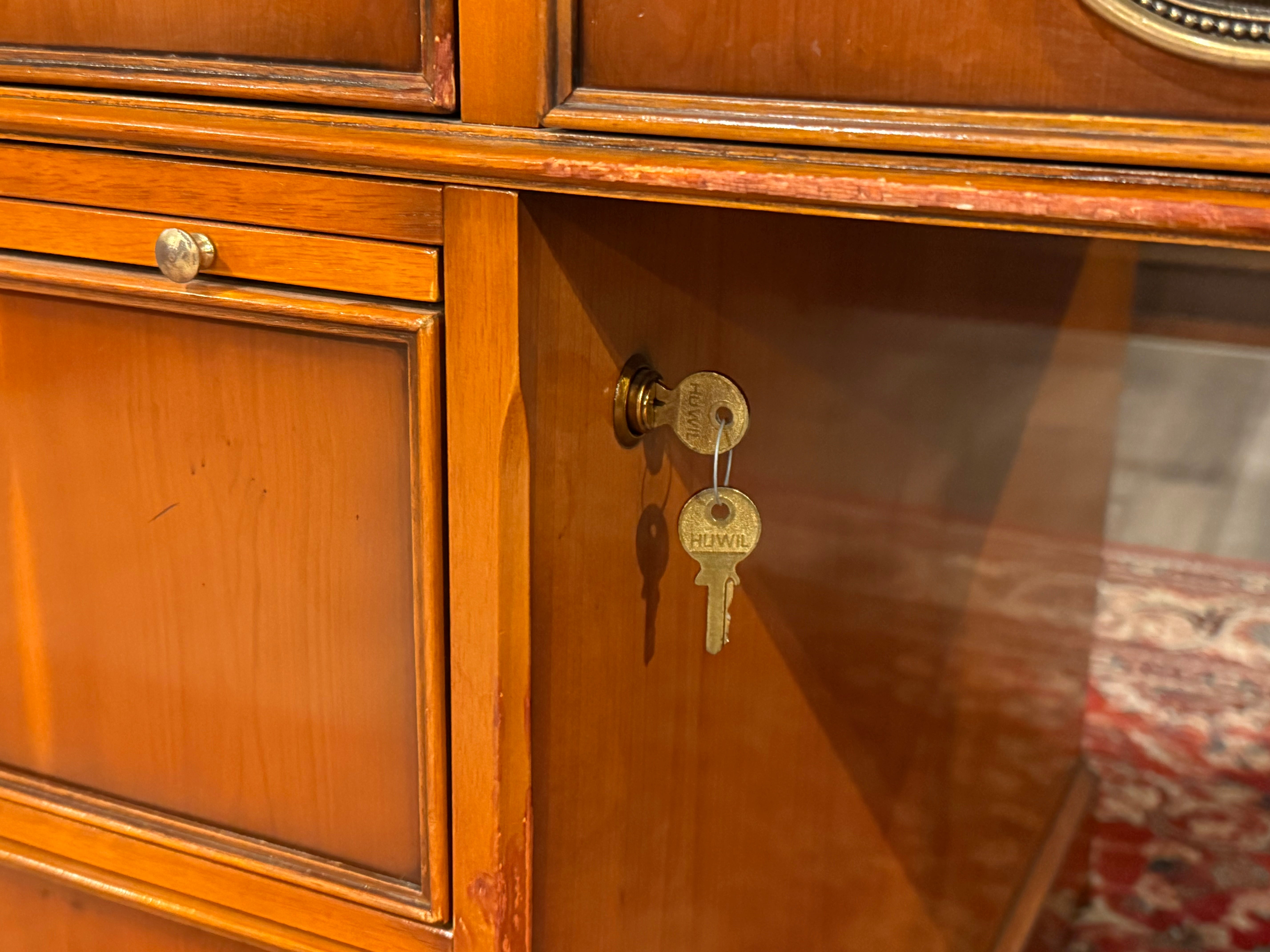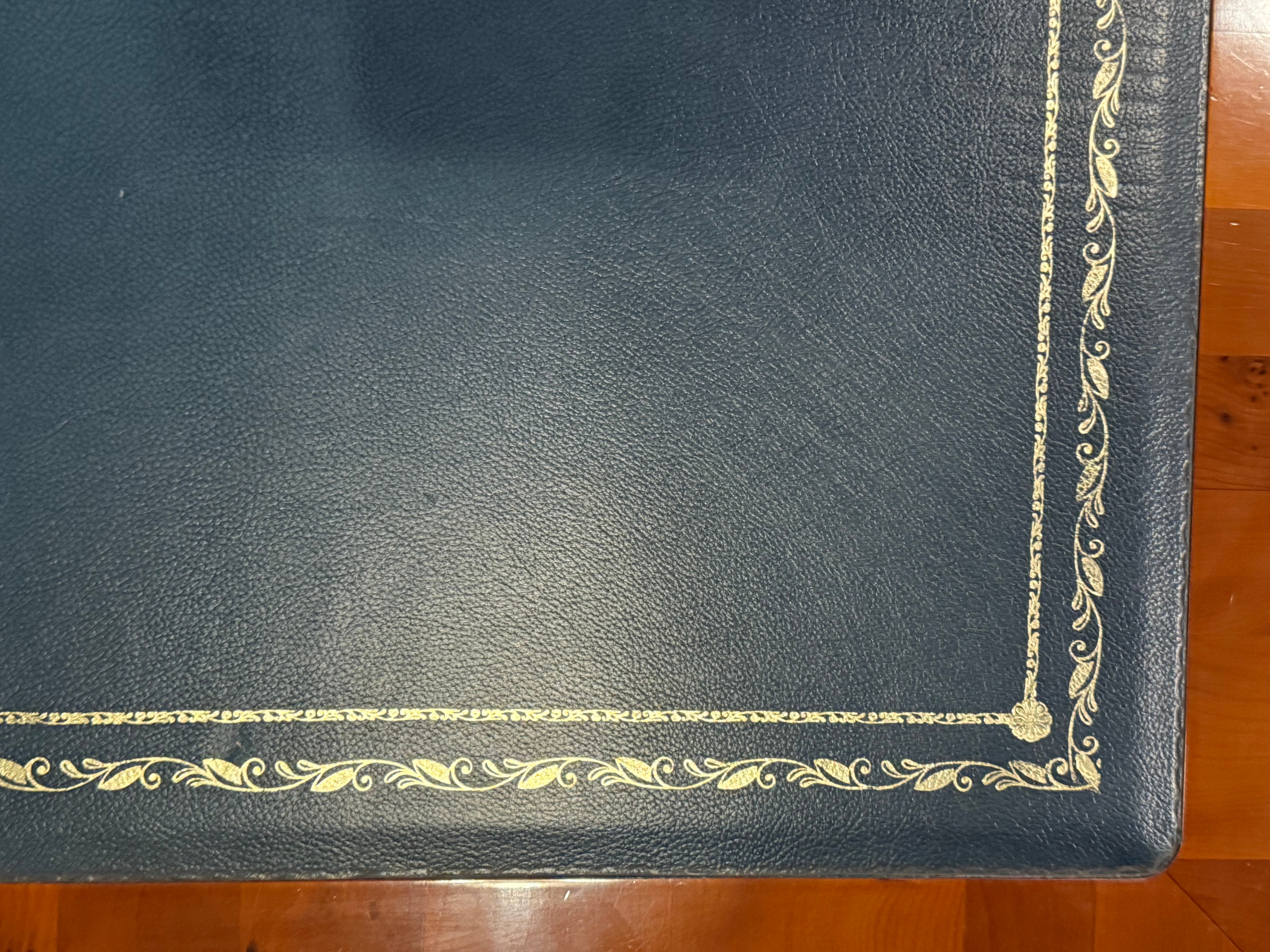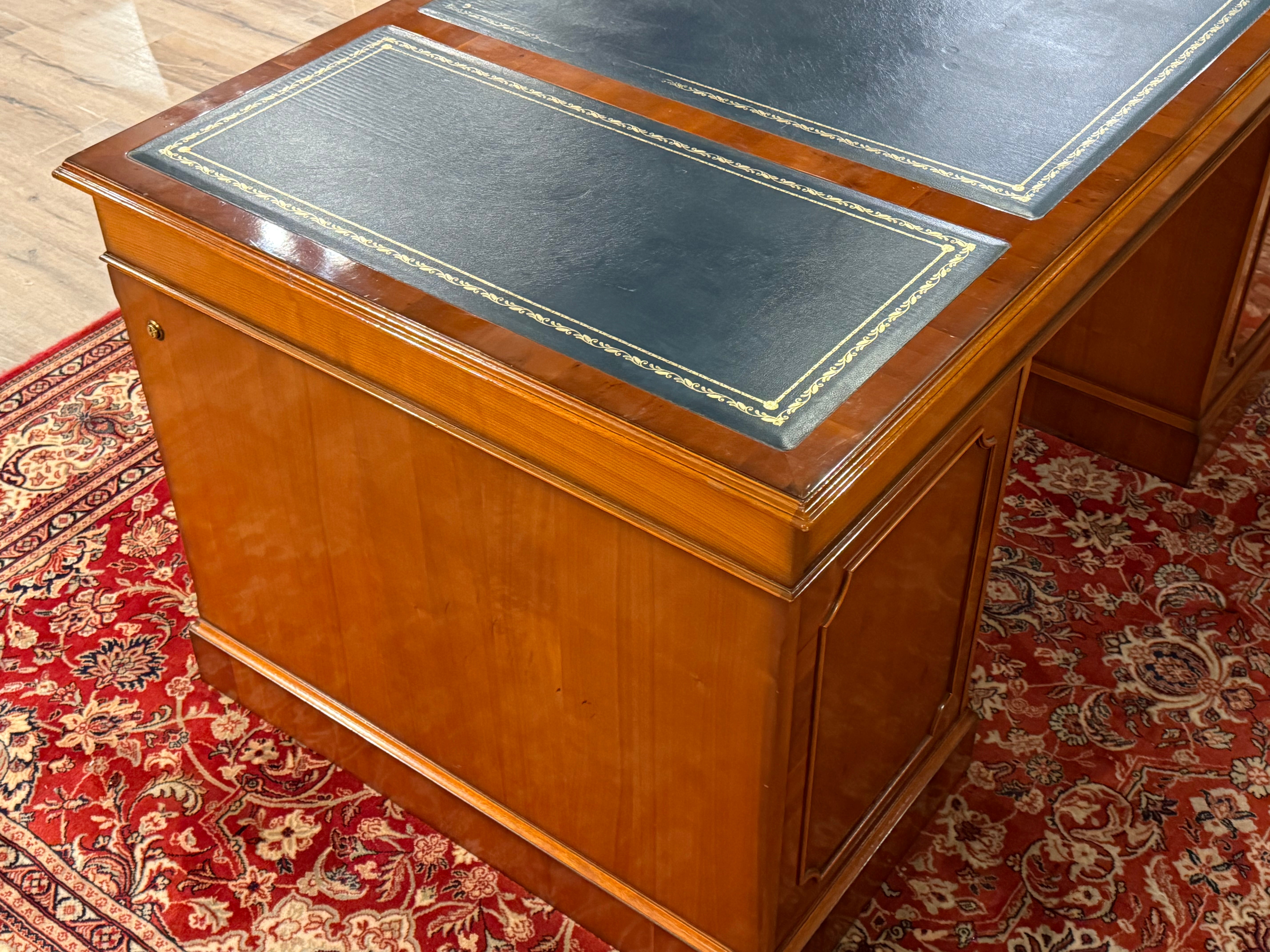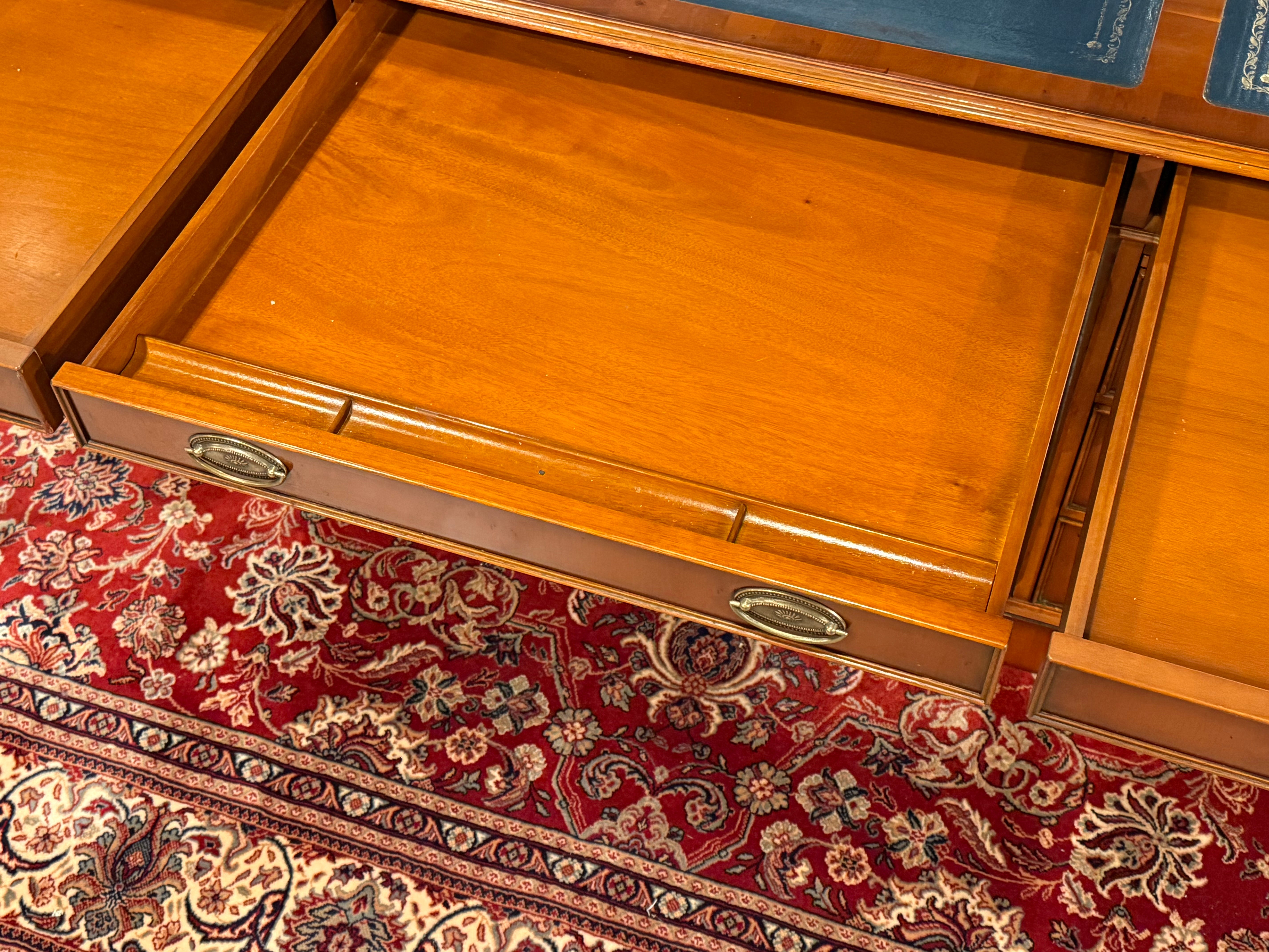 Vintage Bureau 455 - Klassiek Engels bureau, Blauw leer, Messing grepen, licht kersen hout, Heldense