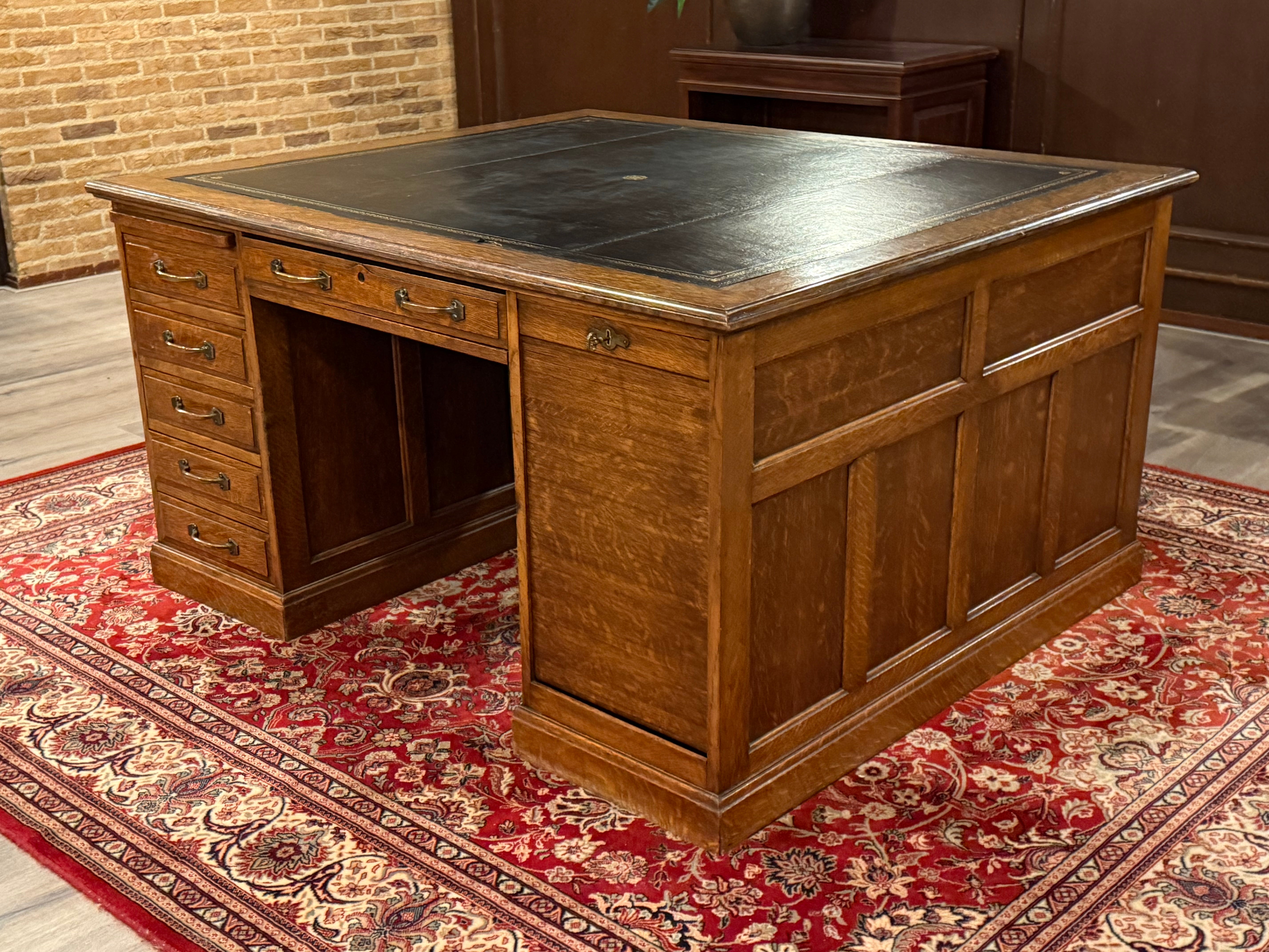 Antiek Bureau (partnerdesk) 410 - Klassiek Engels bureau, Donkerblauw leer, Messing grepen, licht eiken hout, ca. 1920