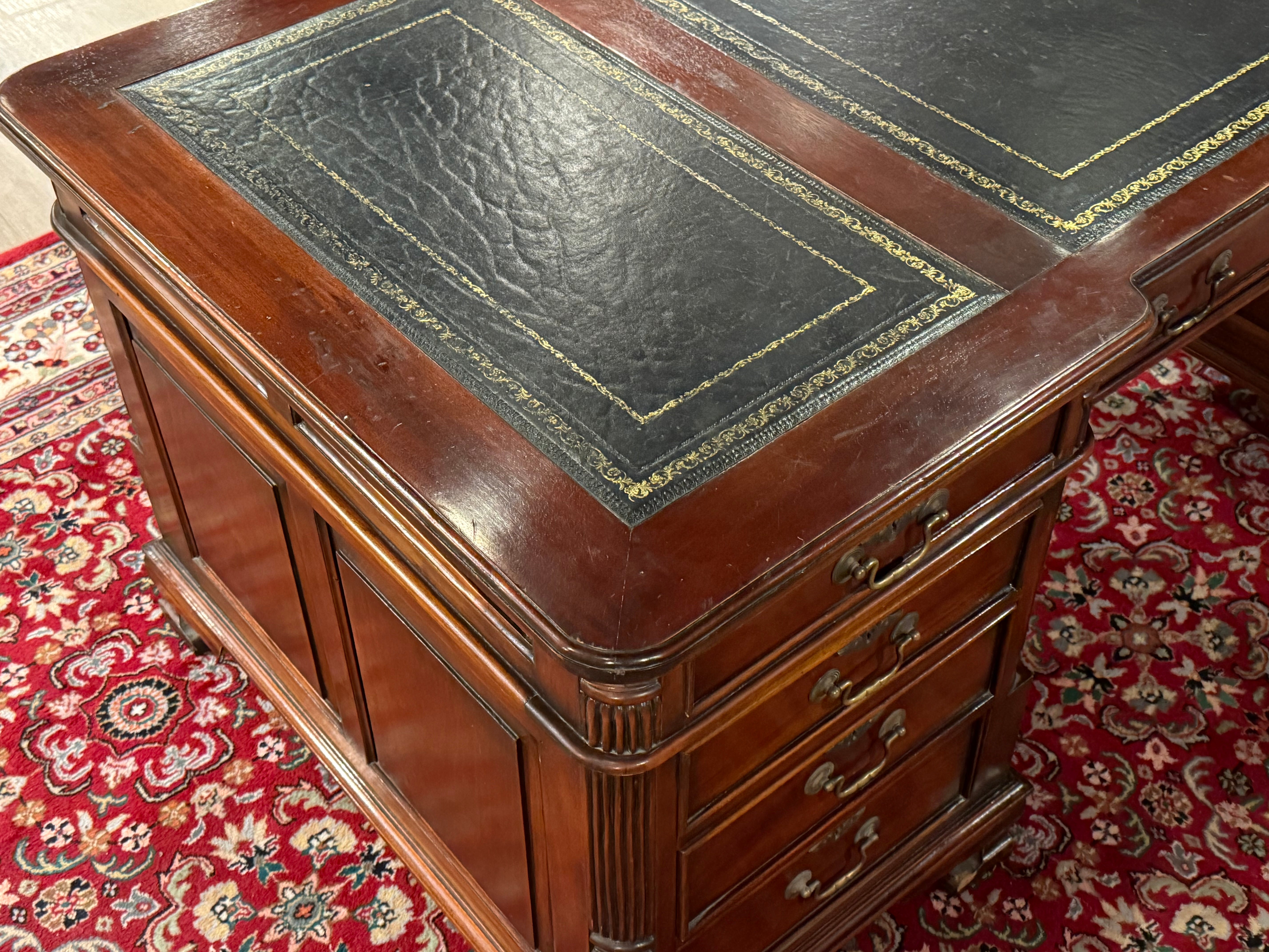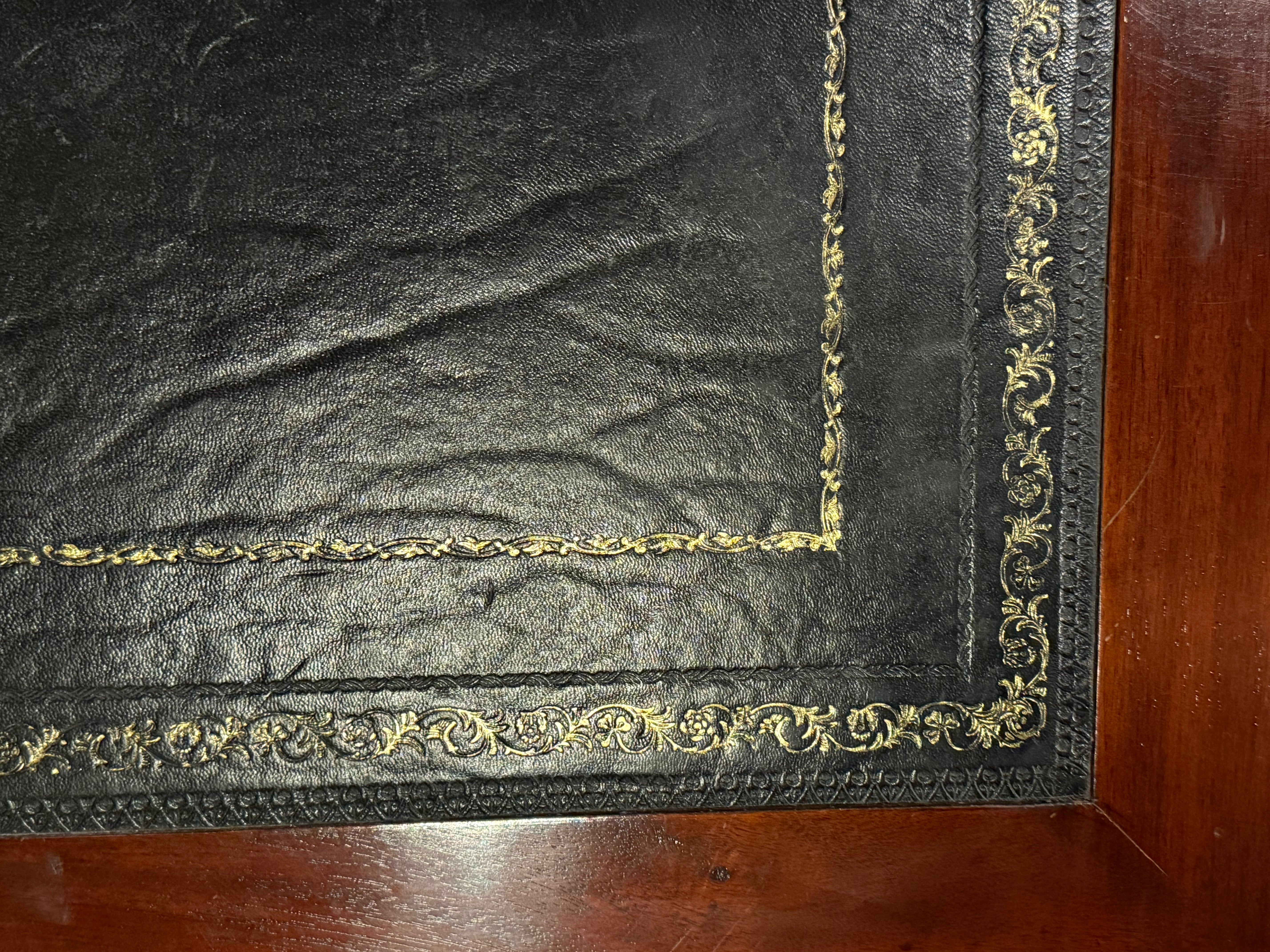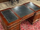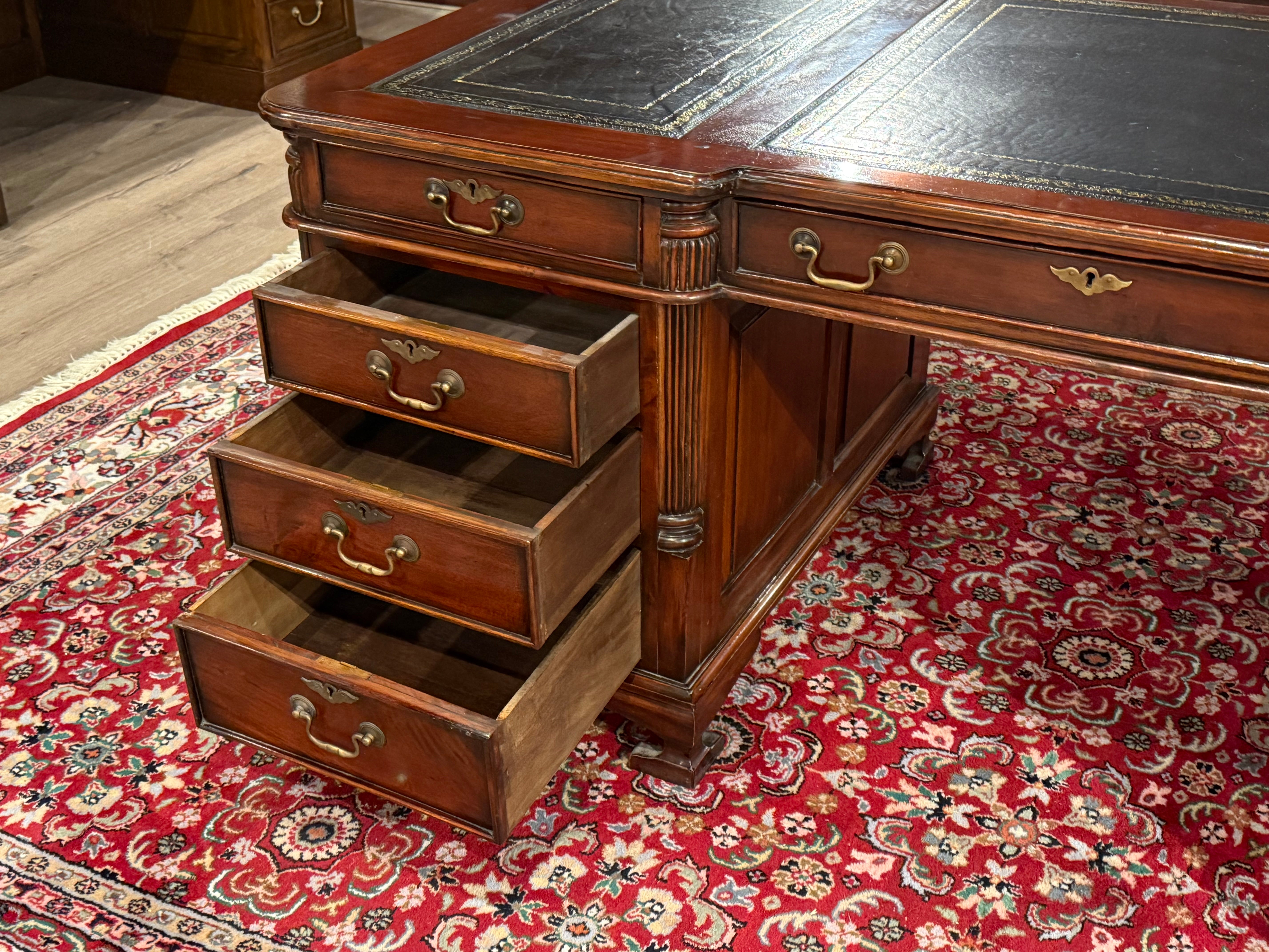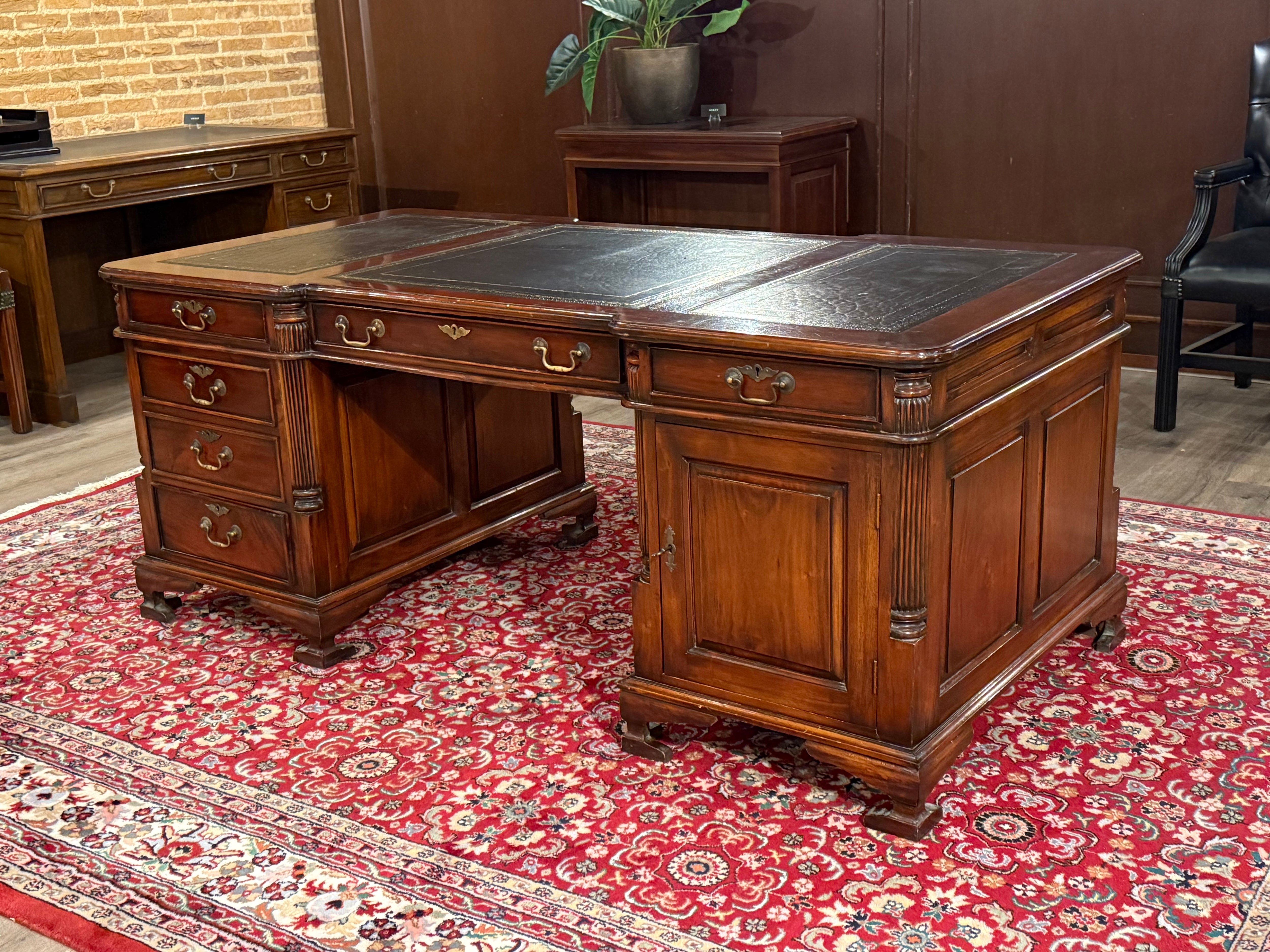 Vintage bureau, partnerdesk, klassiek Engels bureau, mahoniehout, zwart leer, 582