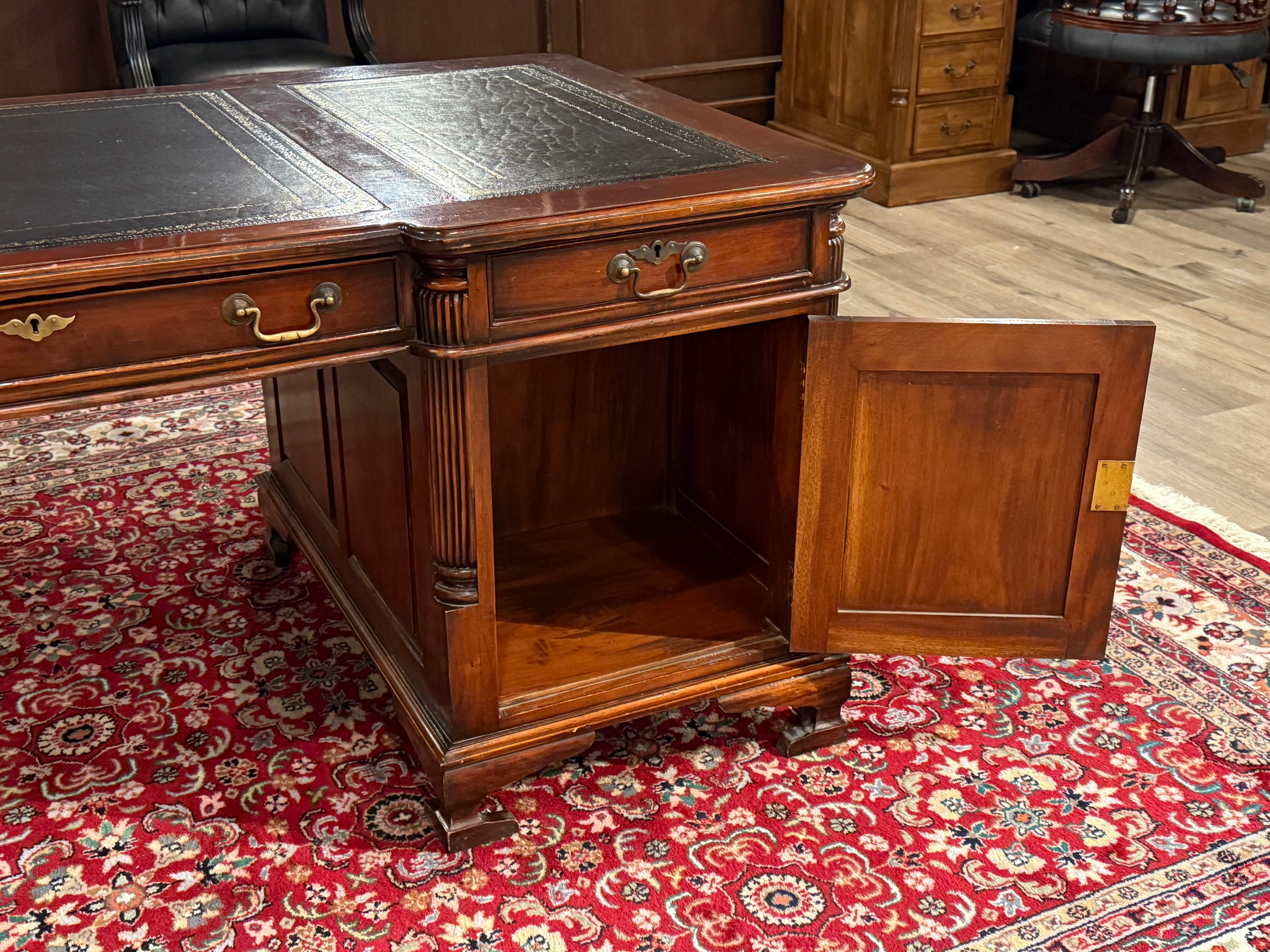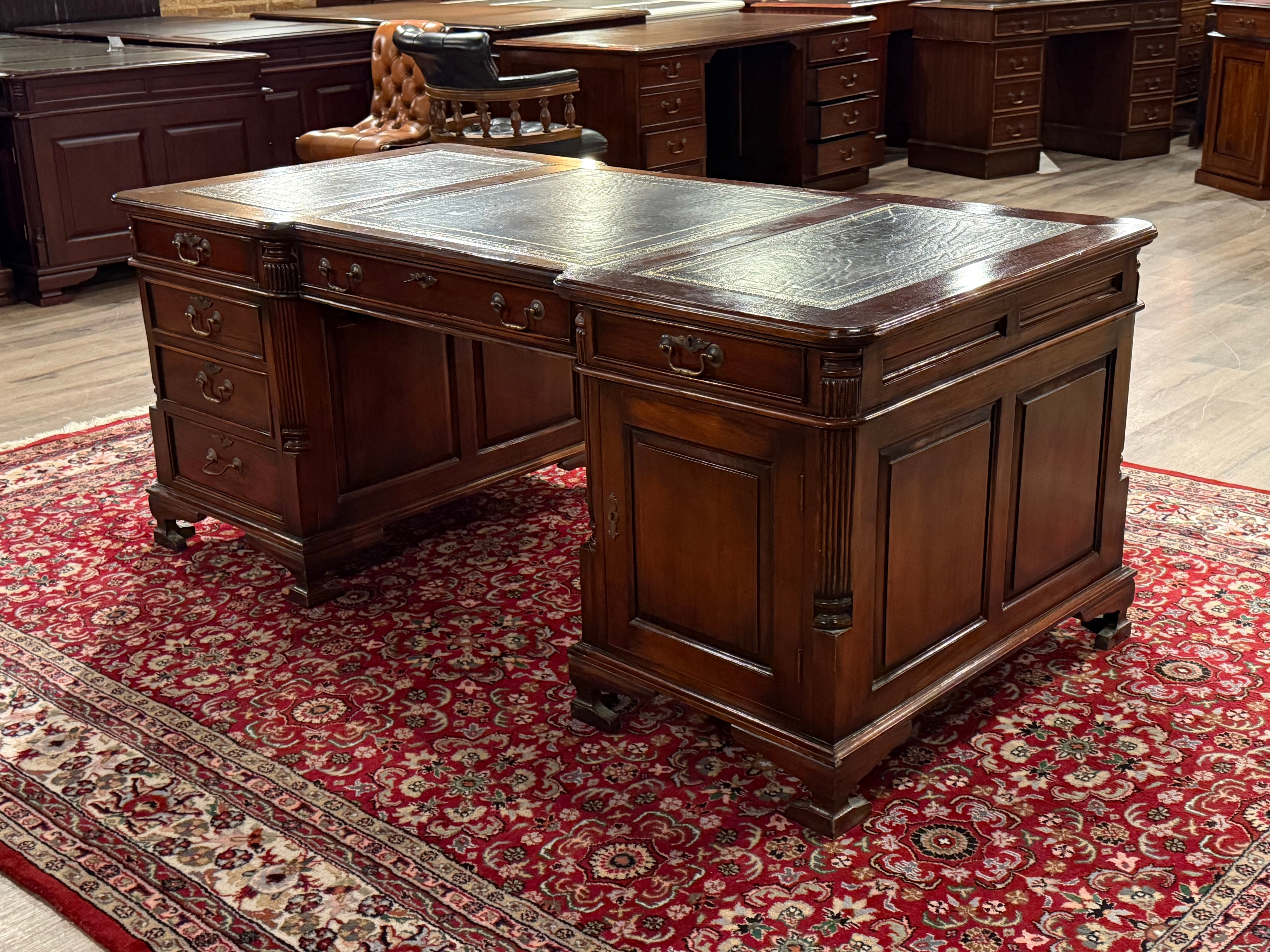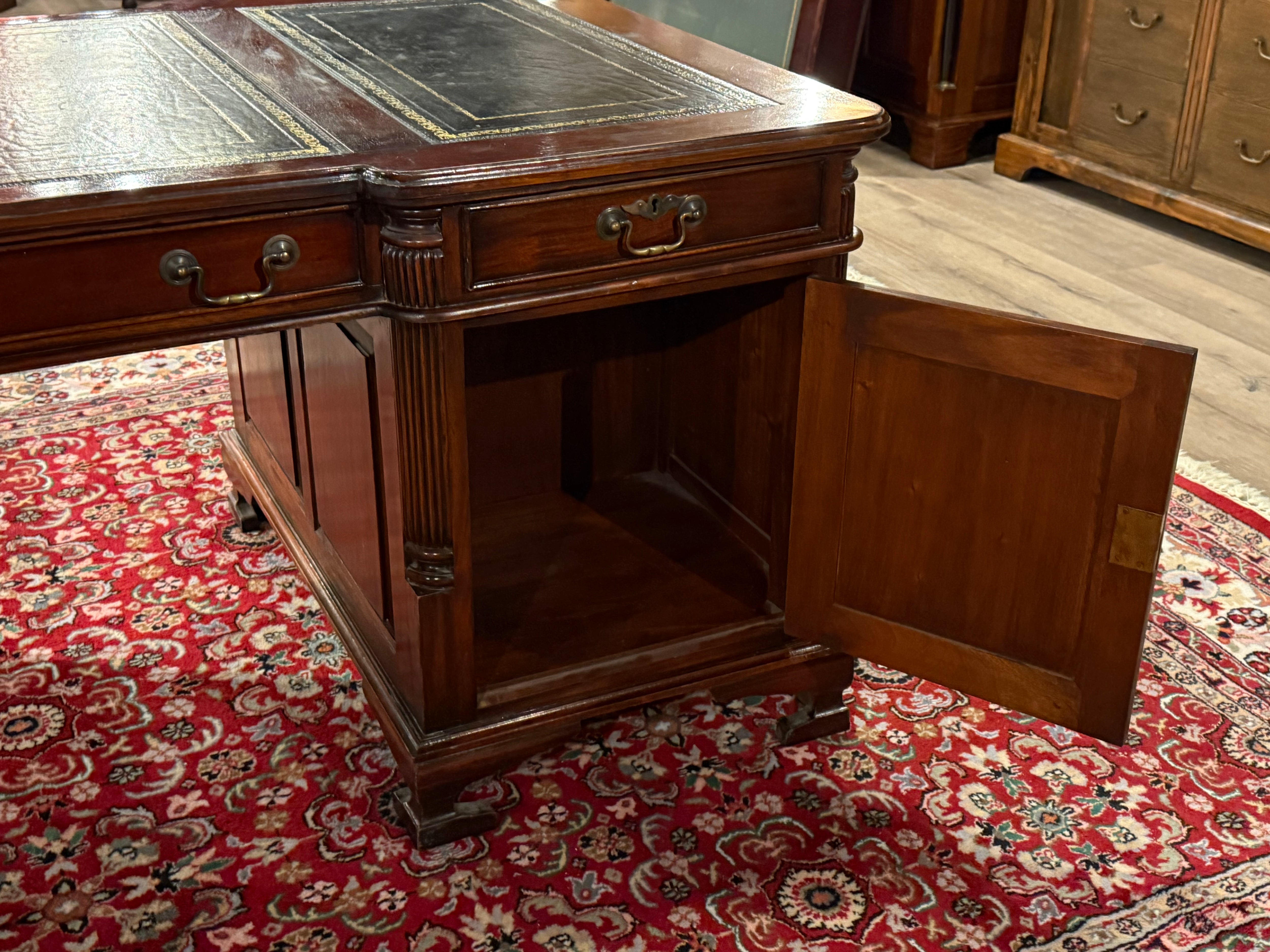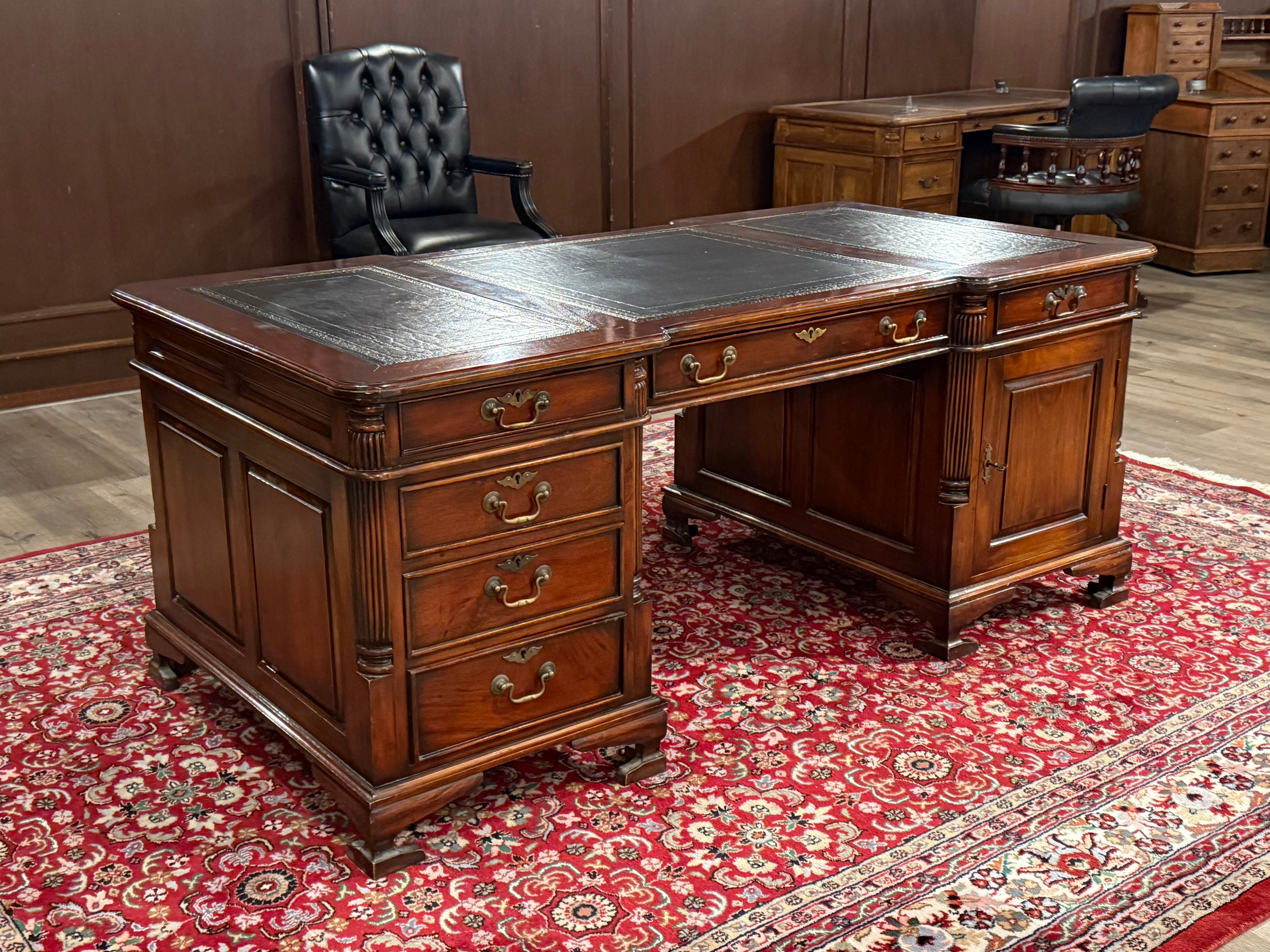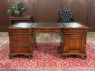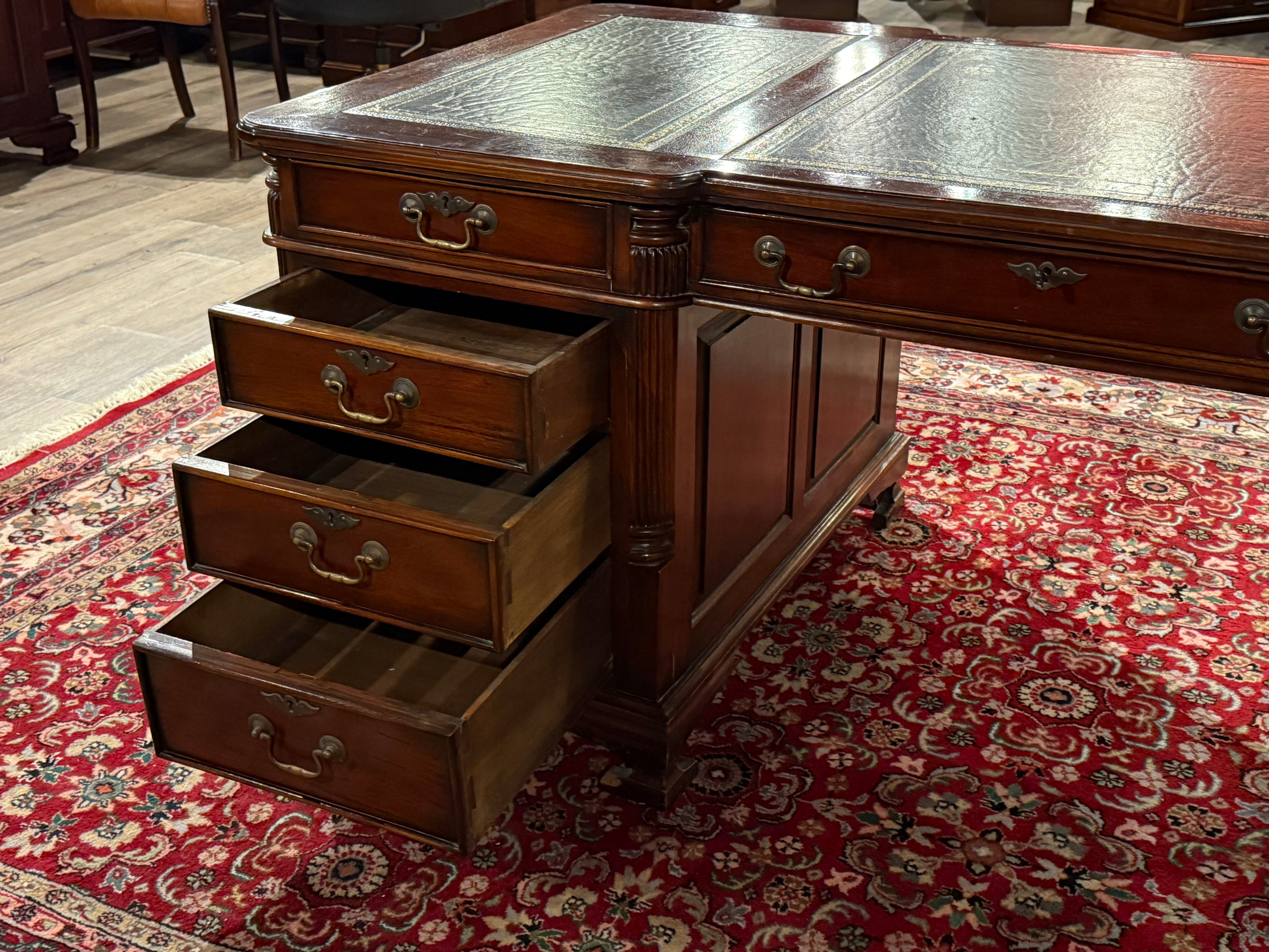Vintage bureau, partnerdesk, klassiek Engels bureau, mahoniehout, zwart leer, 582