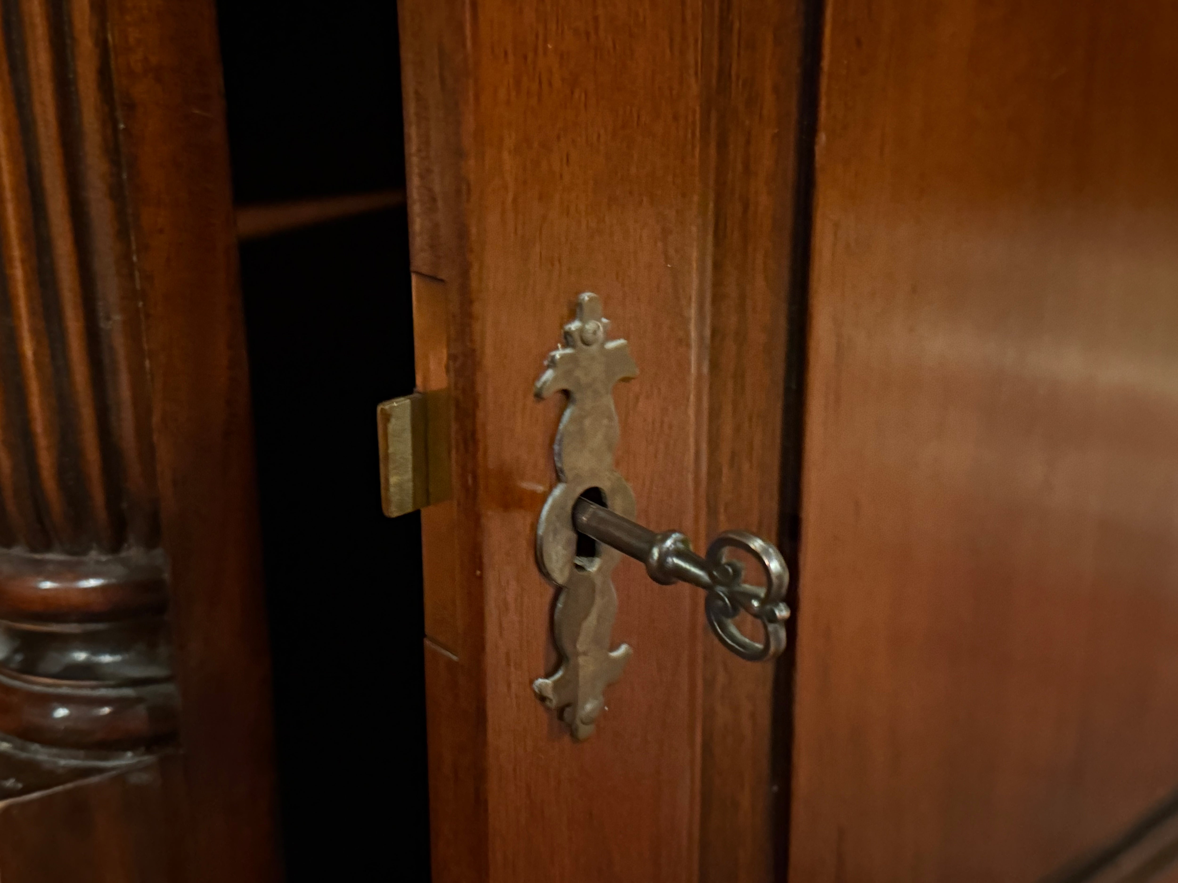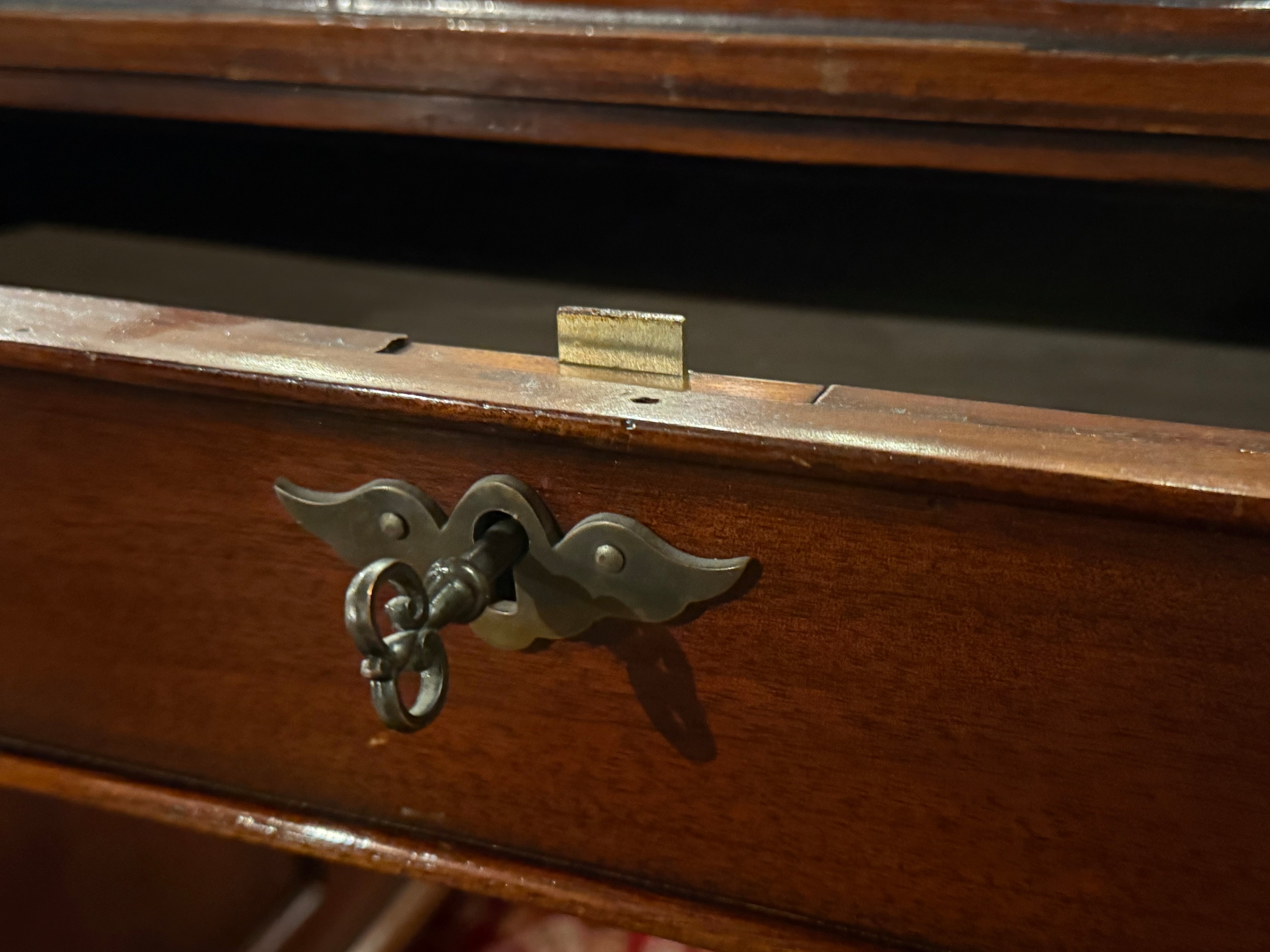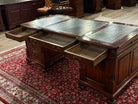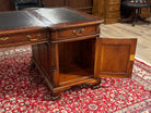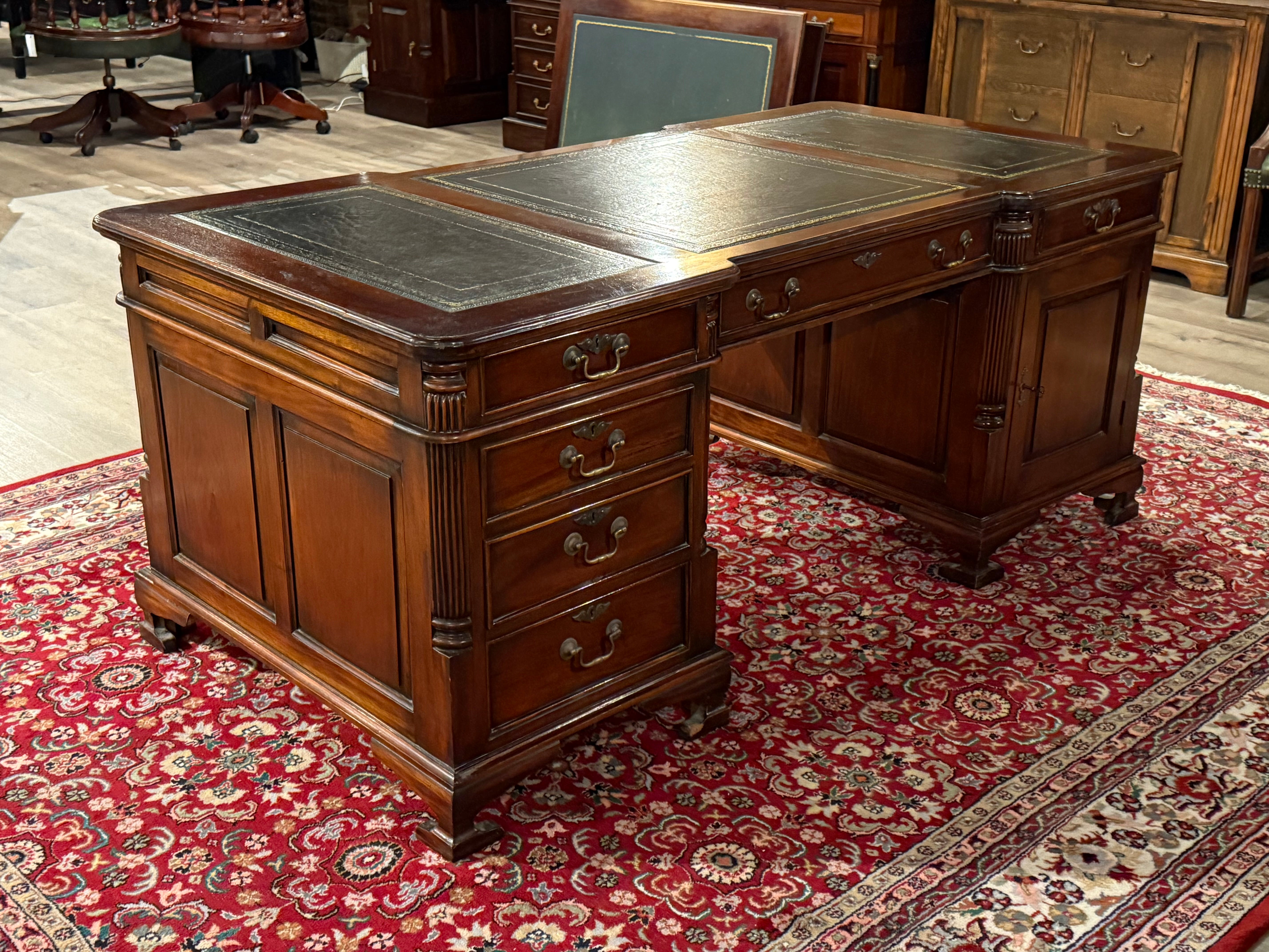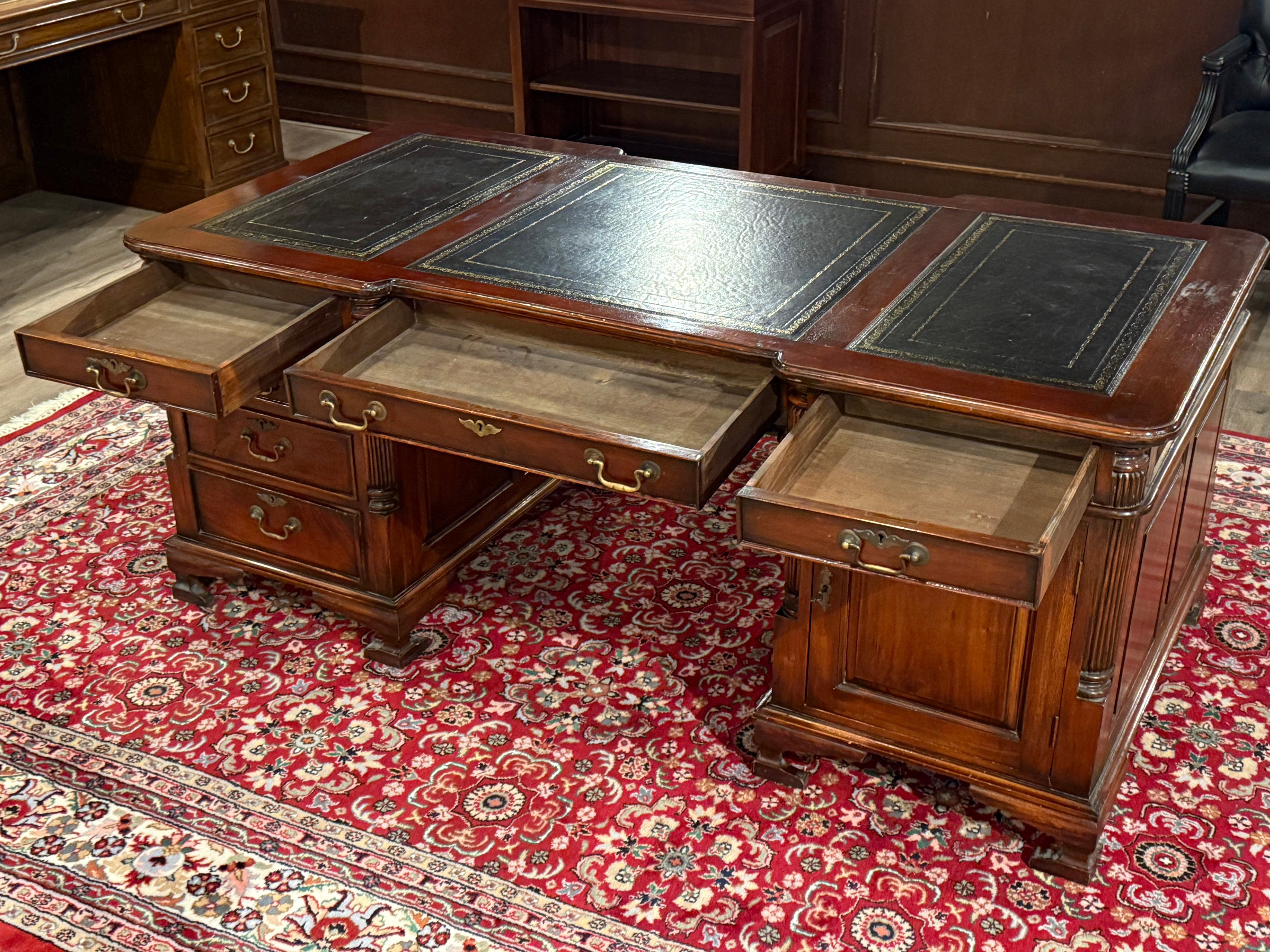 Vintage bureau, partnerdesk, klassiek Engels bureau, mahoniehout, zwart leer, 582