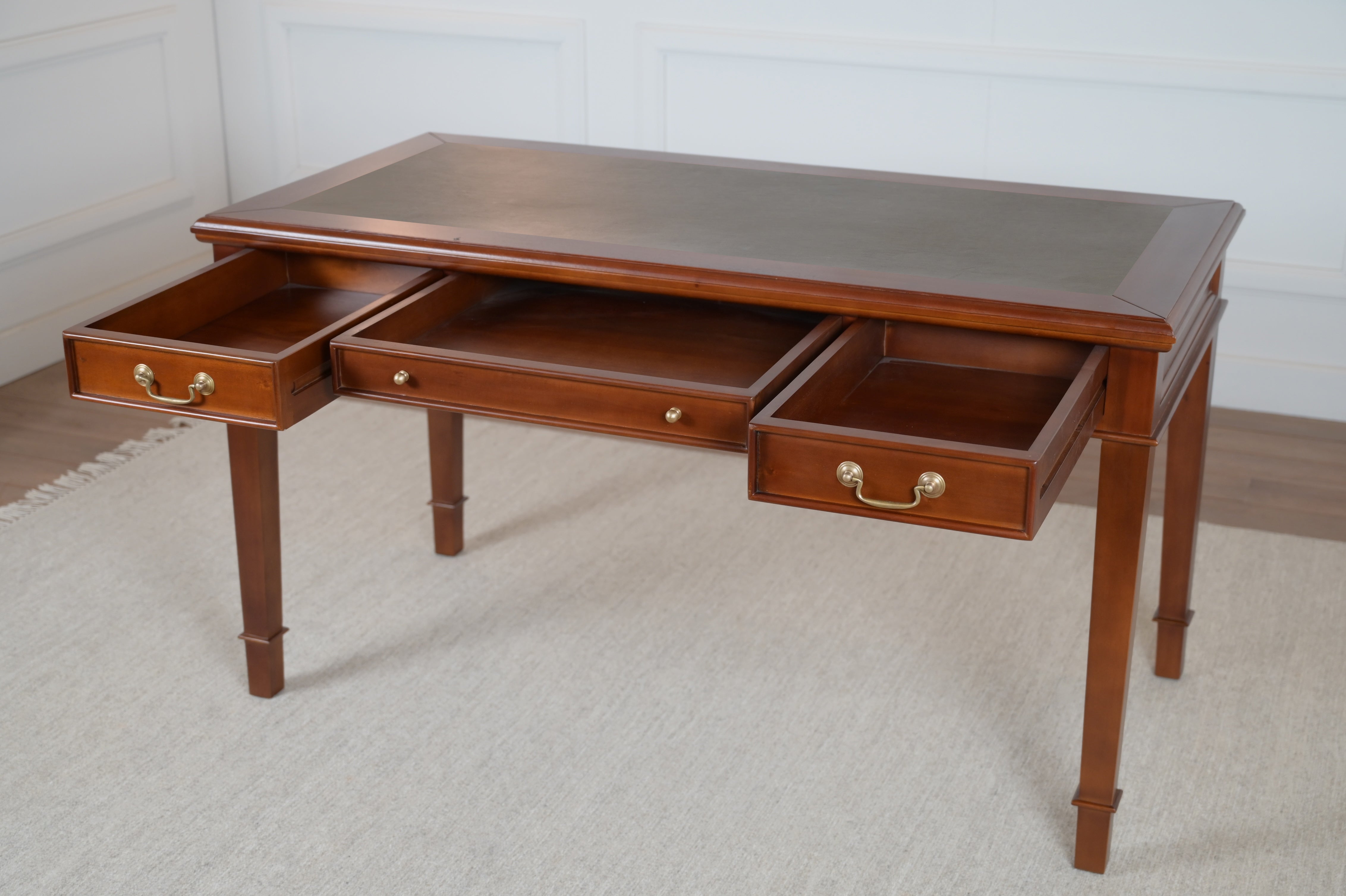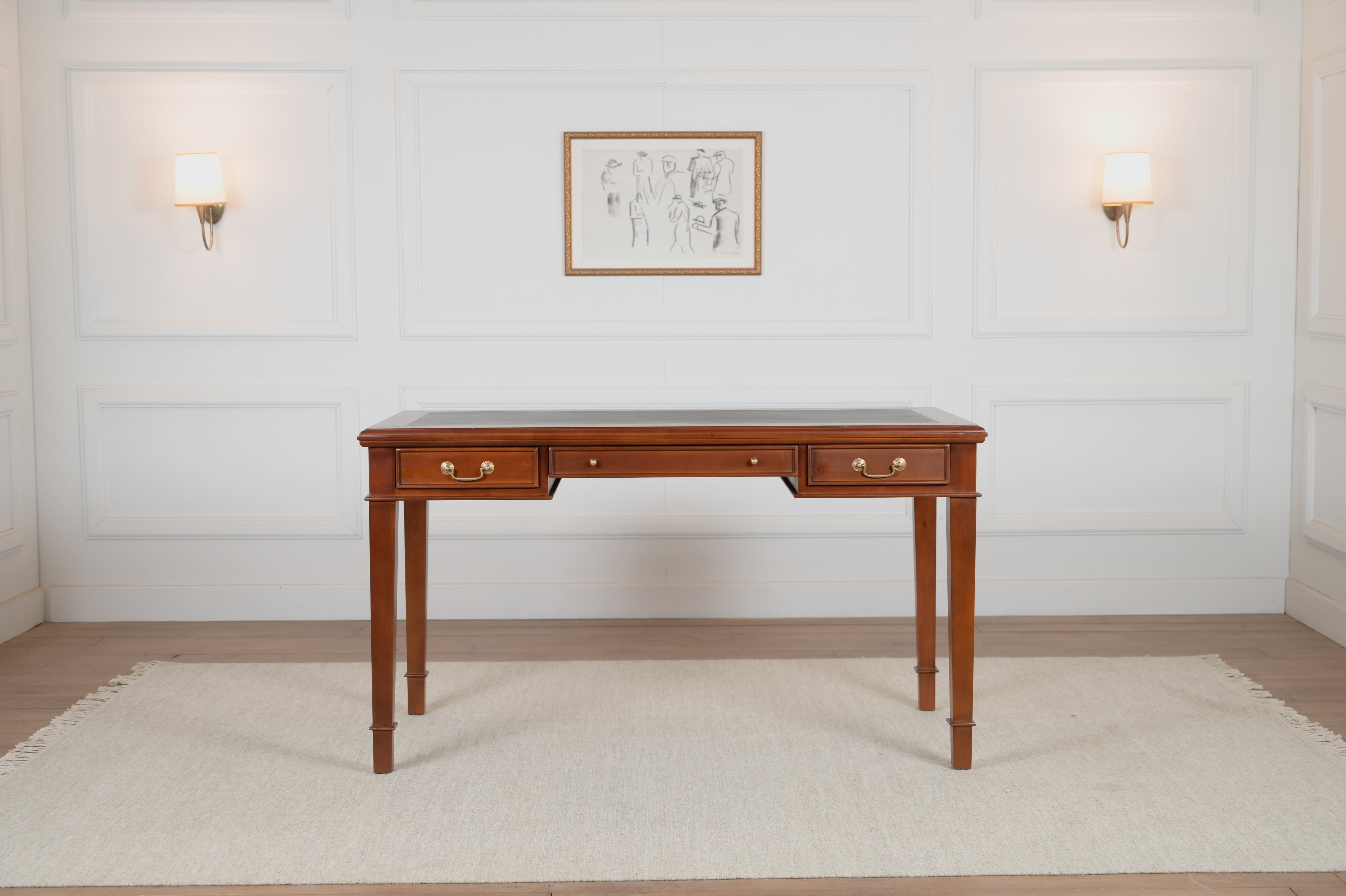 Klassieke schrijftafel van massief mahoniehout met een luxe lederen inleg. Perfect voor een stijlvol kantoor of werkplek.