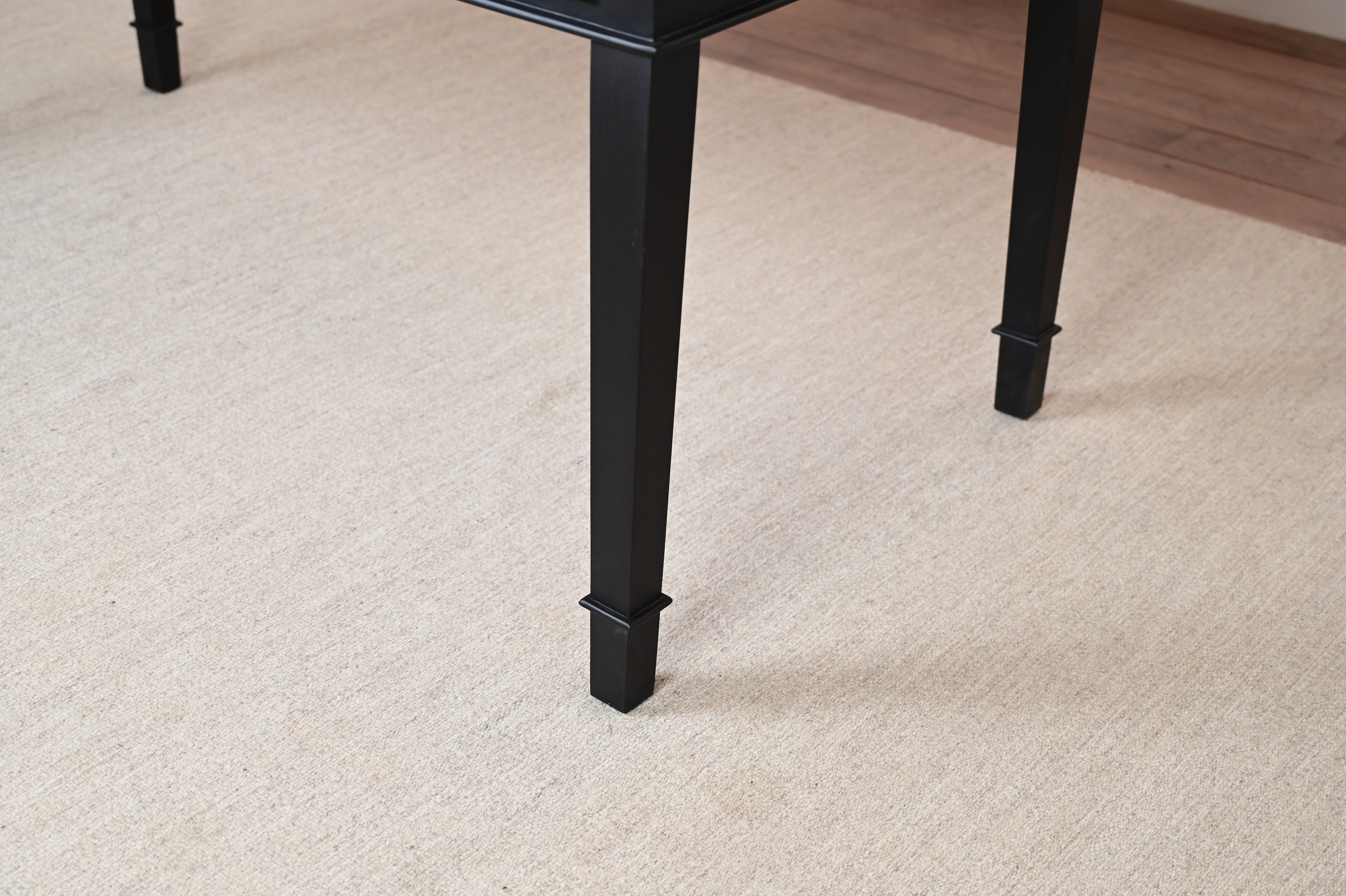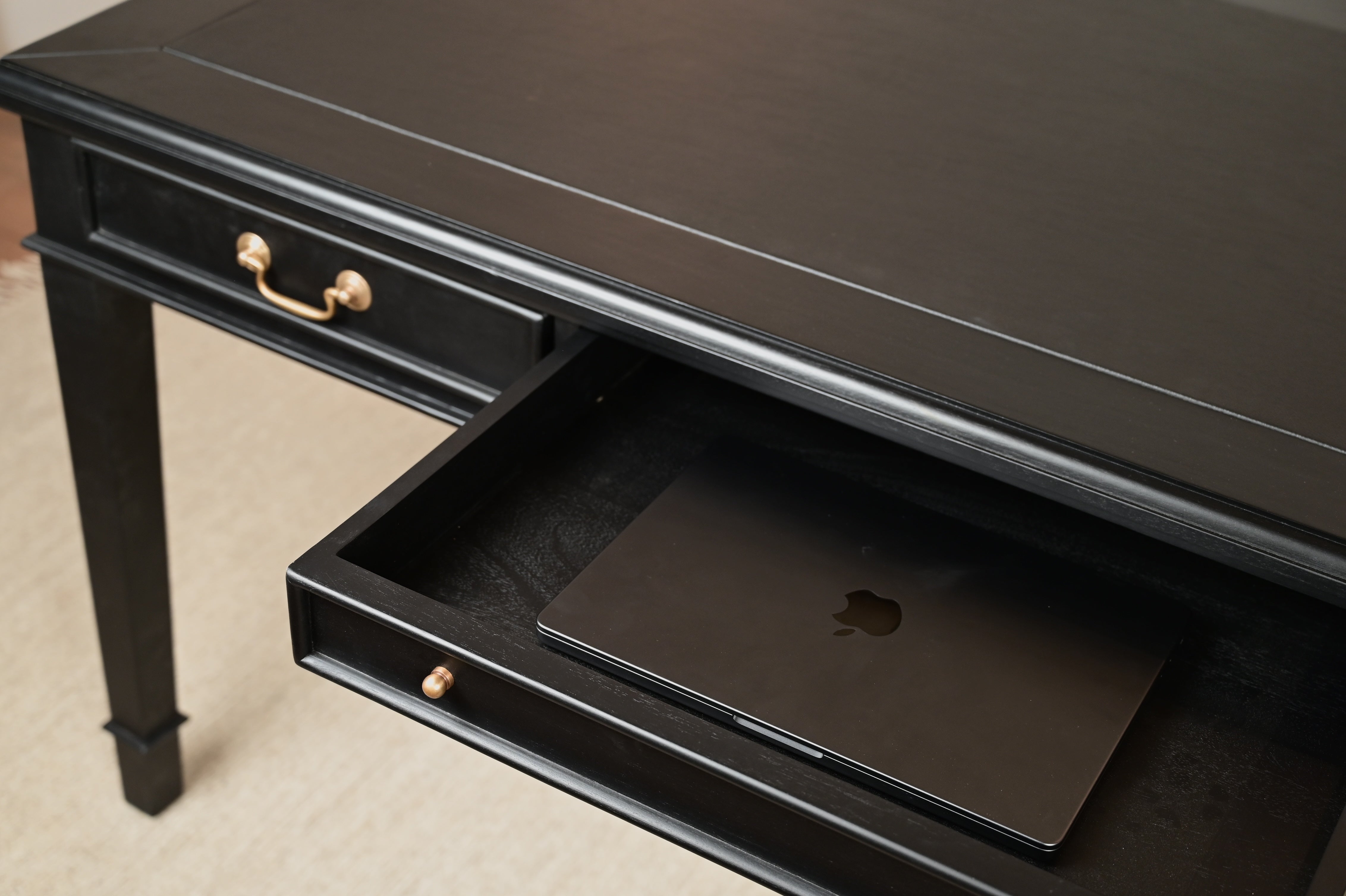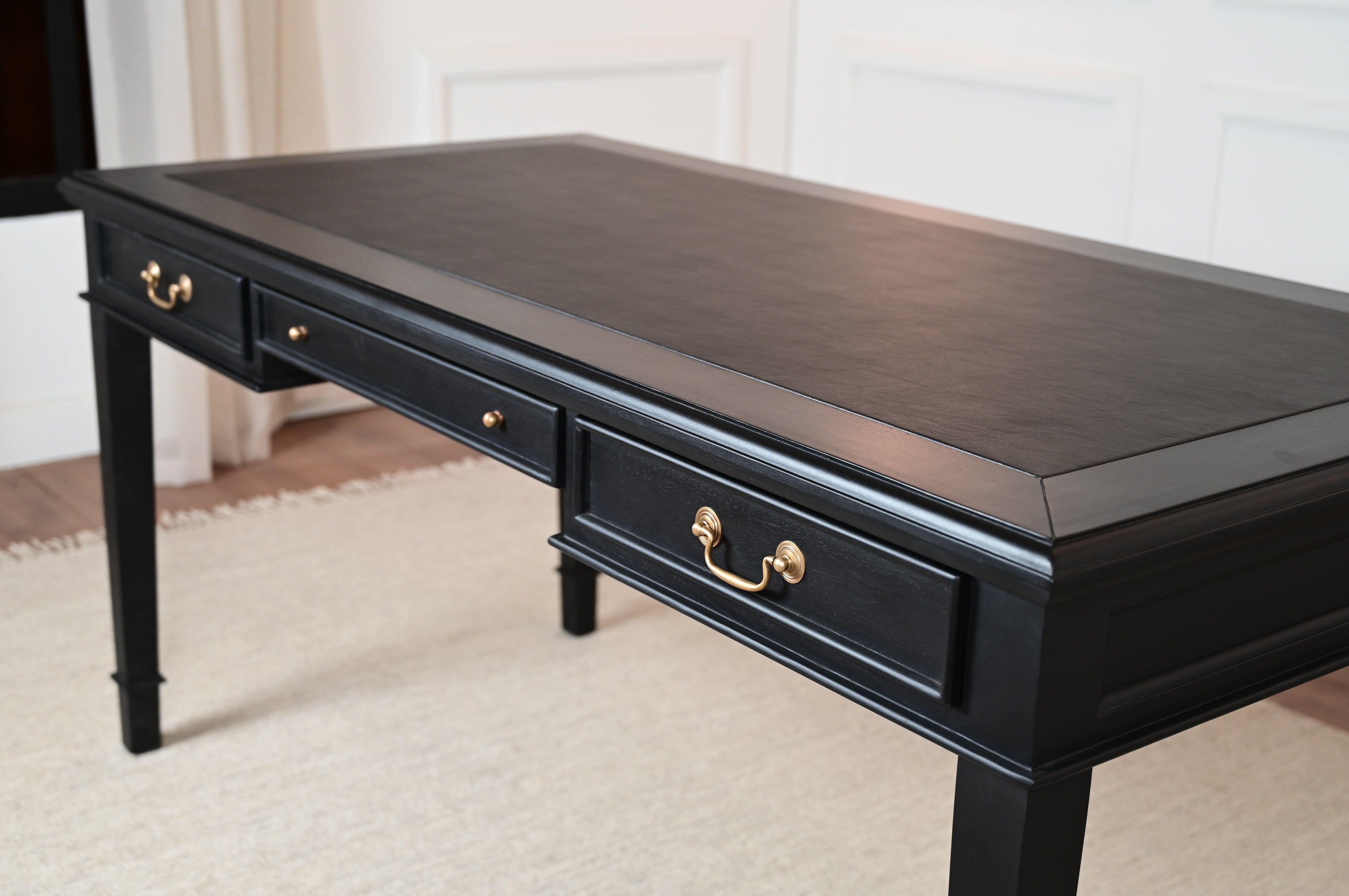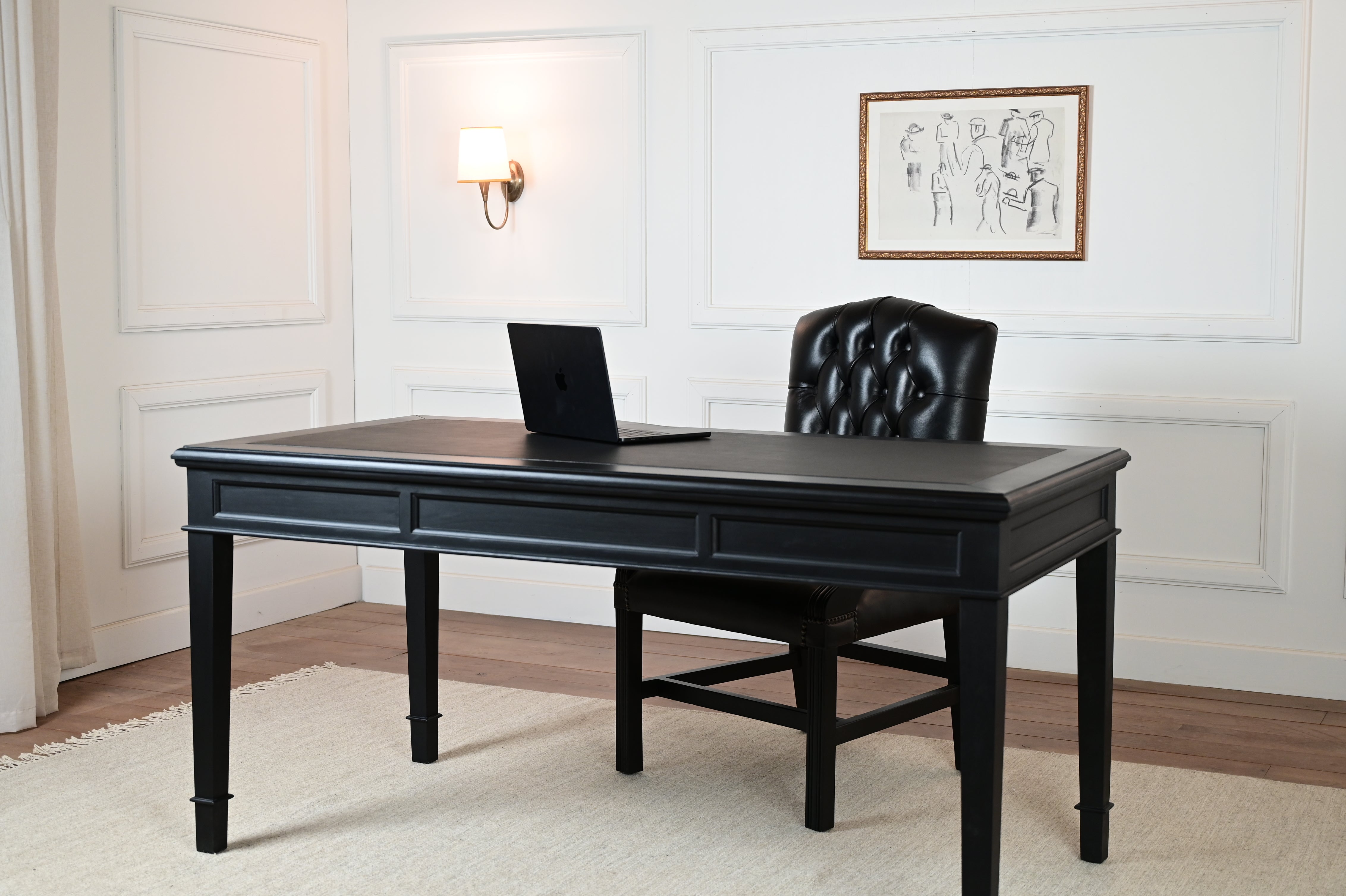 Klassieke zwarte schrijftafel van massief mahoniehout met een luxe lederen inleg. Perfect voor een stijlvol kantoor of werkplek.