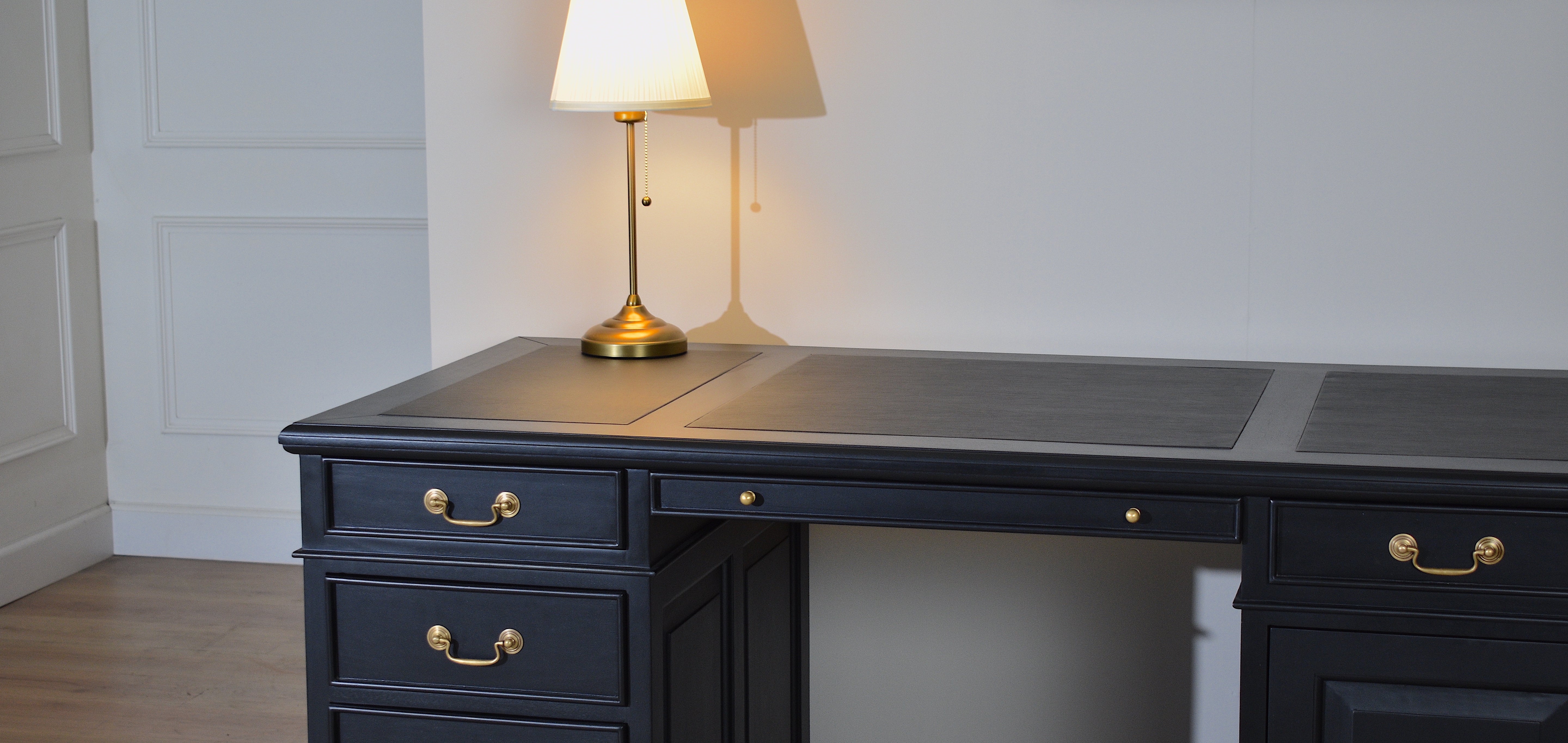Pillar schwarz, Messinggriffe, klassischer englischer Schreibtisch, massives Mahagoniholz