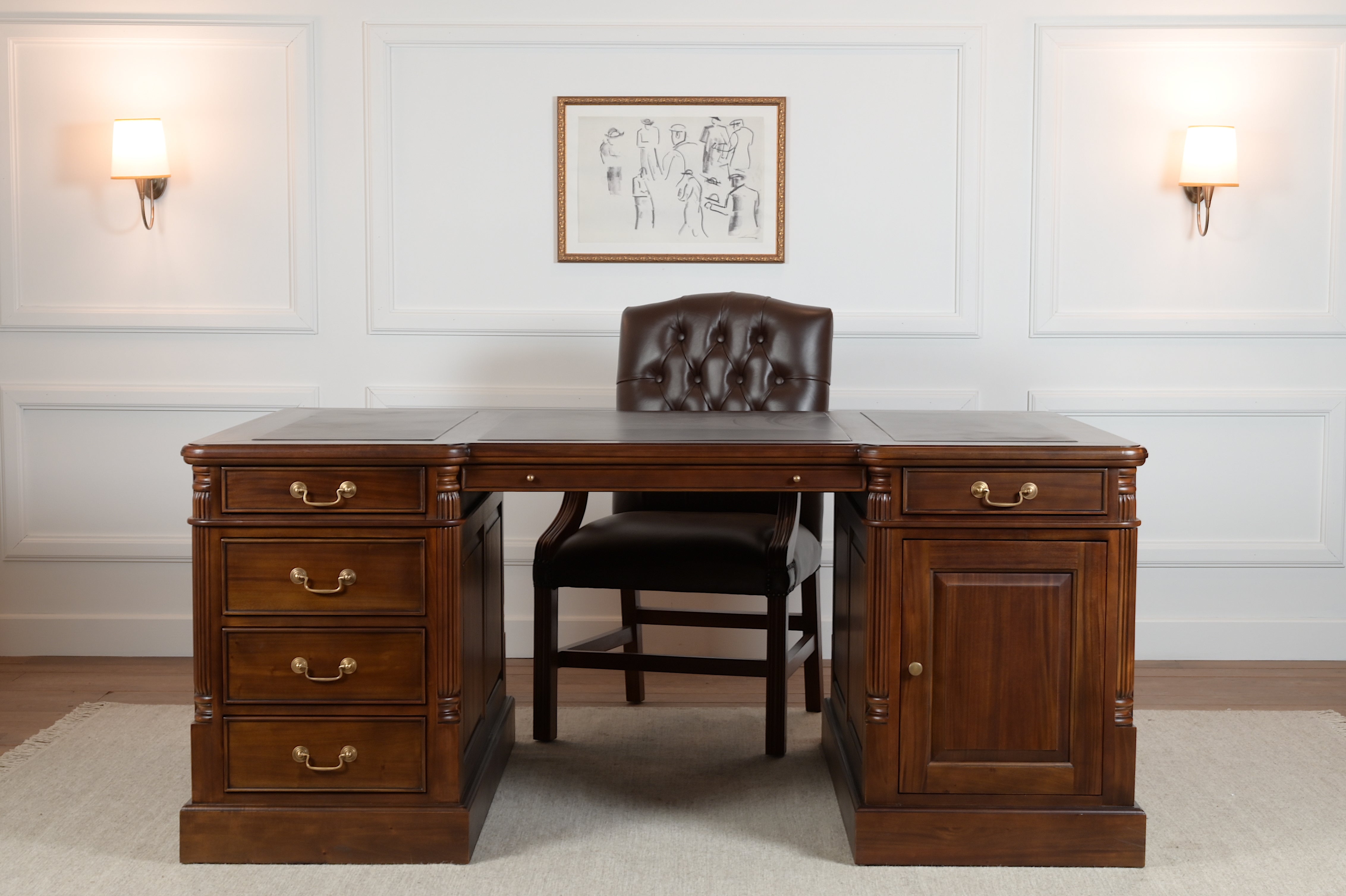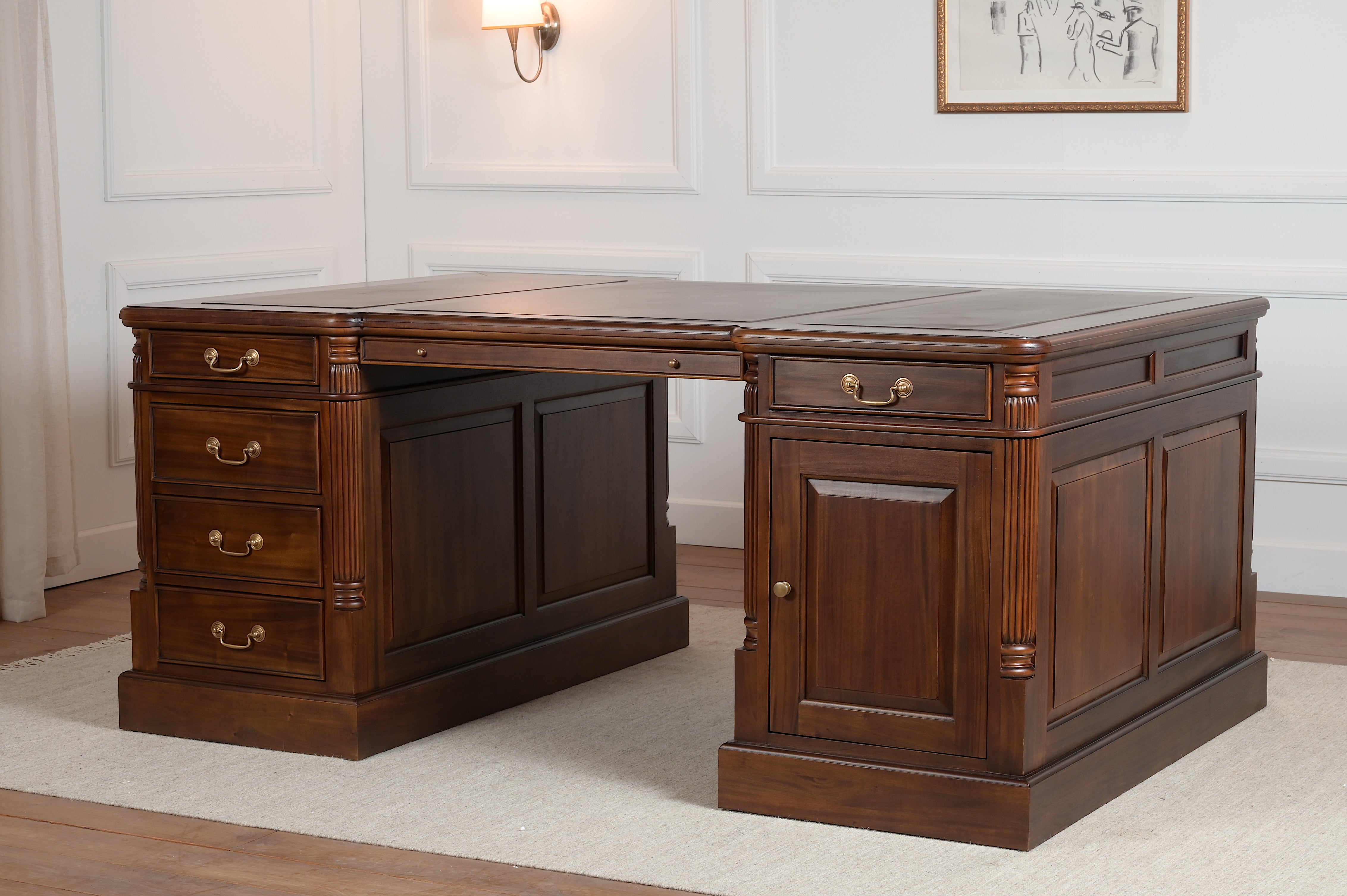 Dieser Schreibtisch ist aus hochwertigem massivem Mahagoniholz gefertigt und die Platte ist mit echtem Leder eingelegt. Der Schreibtisch ist in der Farbe Nussbaum gebeizt .