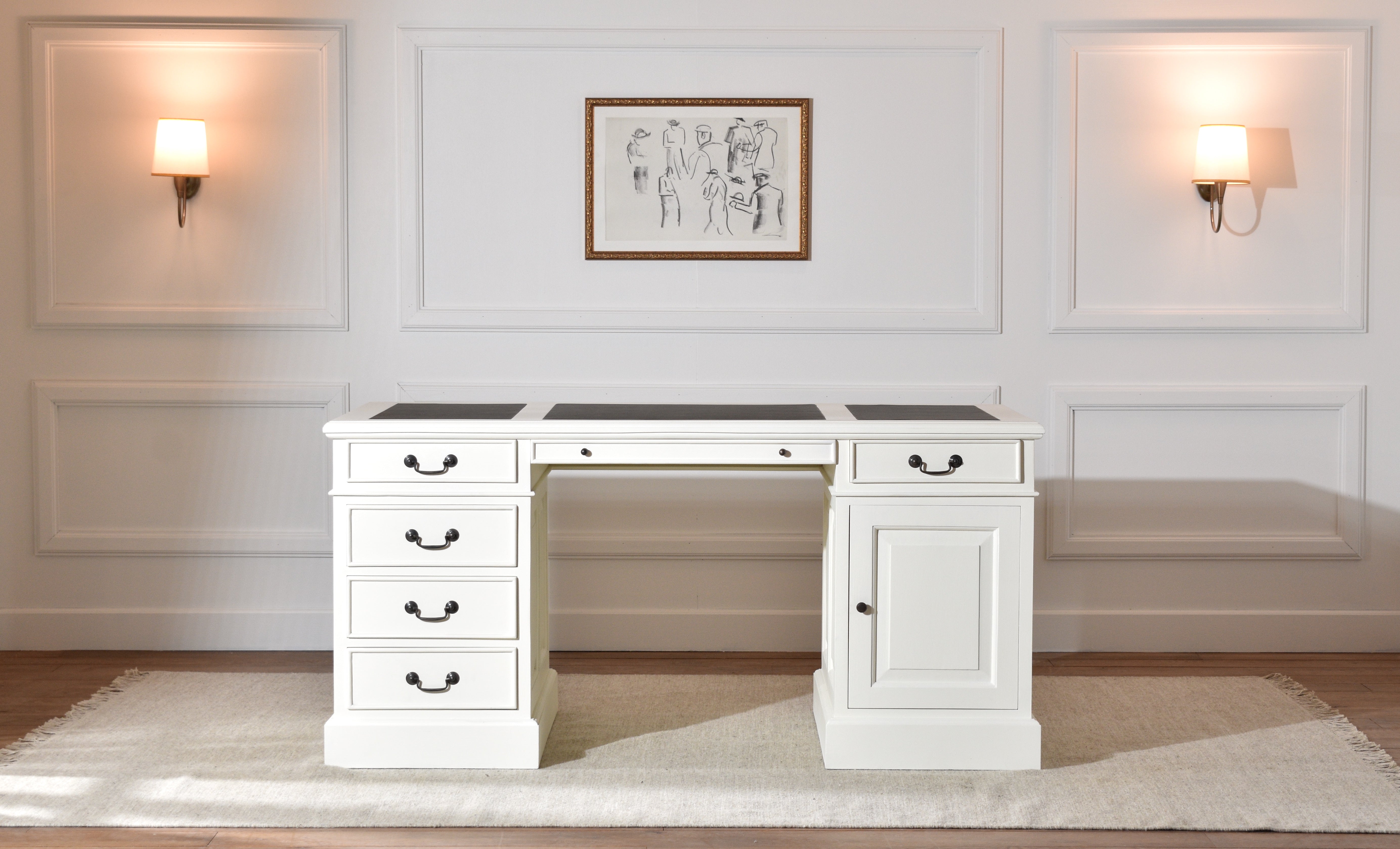 Klassischer weißer Schreibtisch aus massivem Mahagoni mit luxuriöser Ledereinlage, perfekt für einen stilvollen Arbeitsbereich oder ein Büro. Passt gut zu unseren anderen Büromöbeln.
