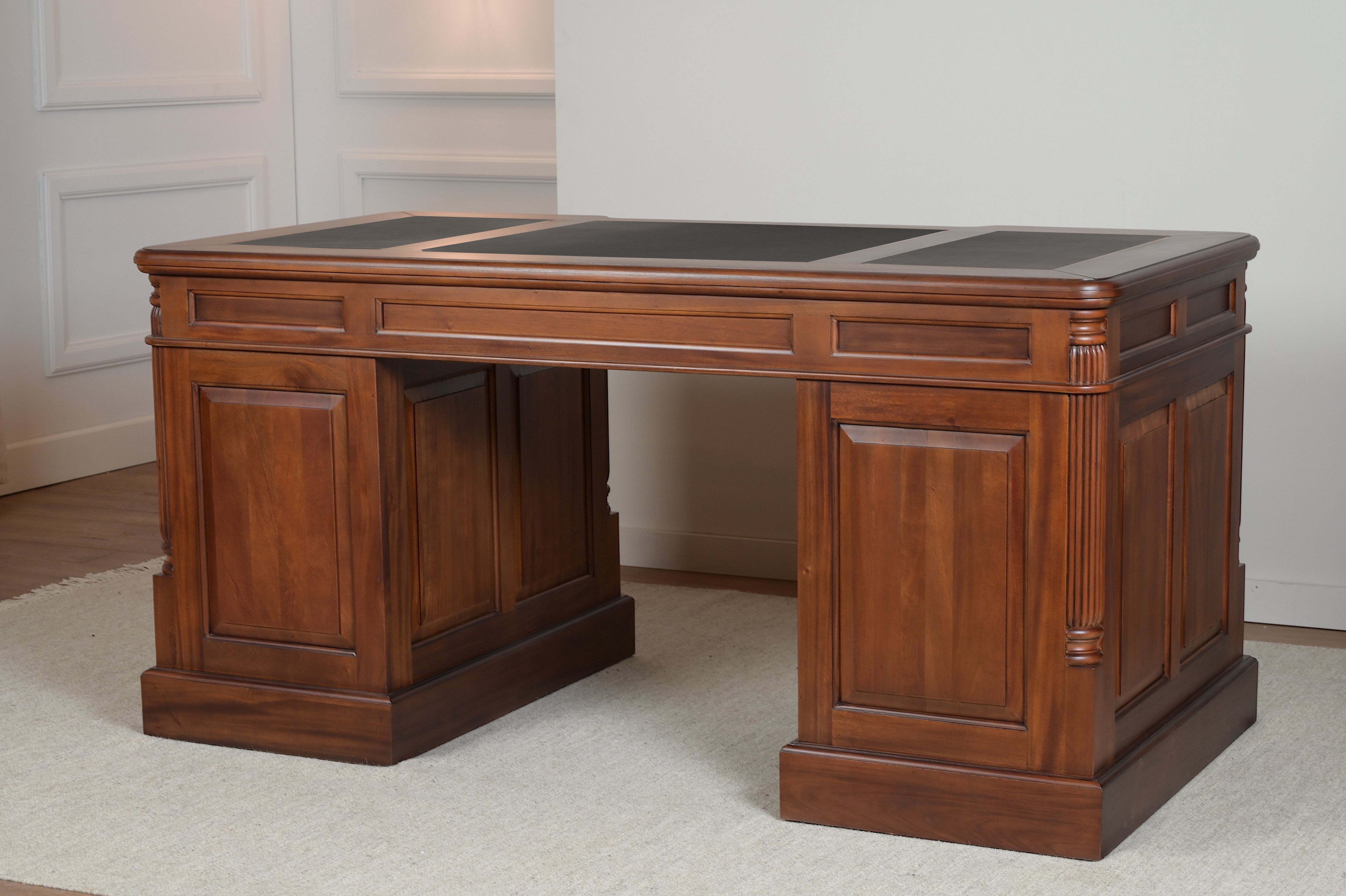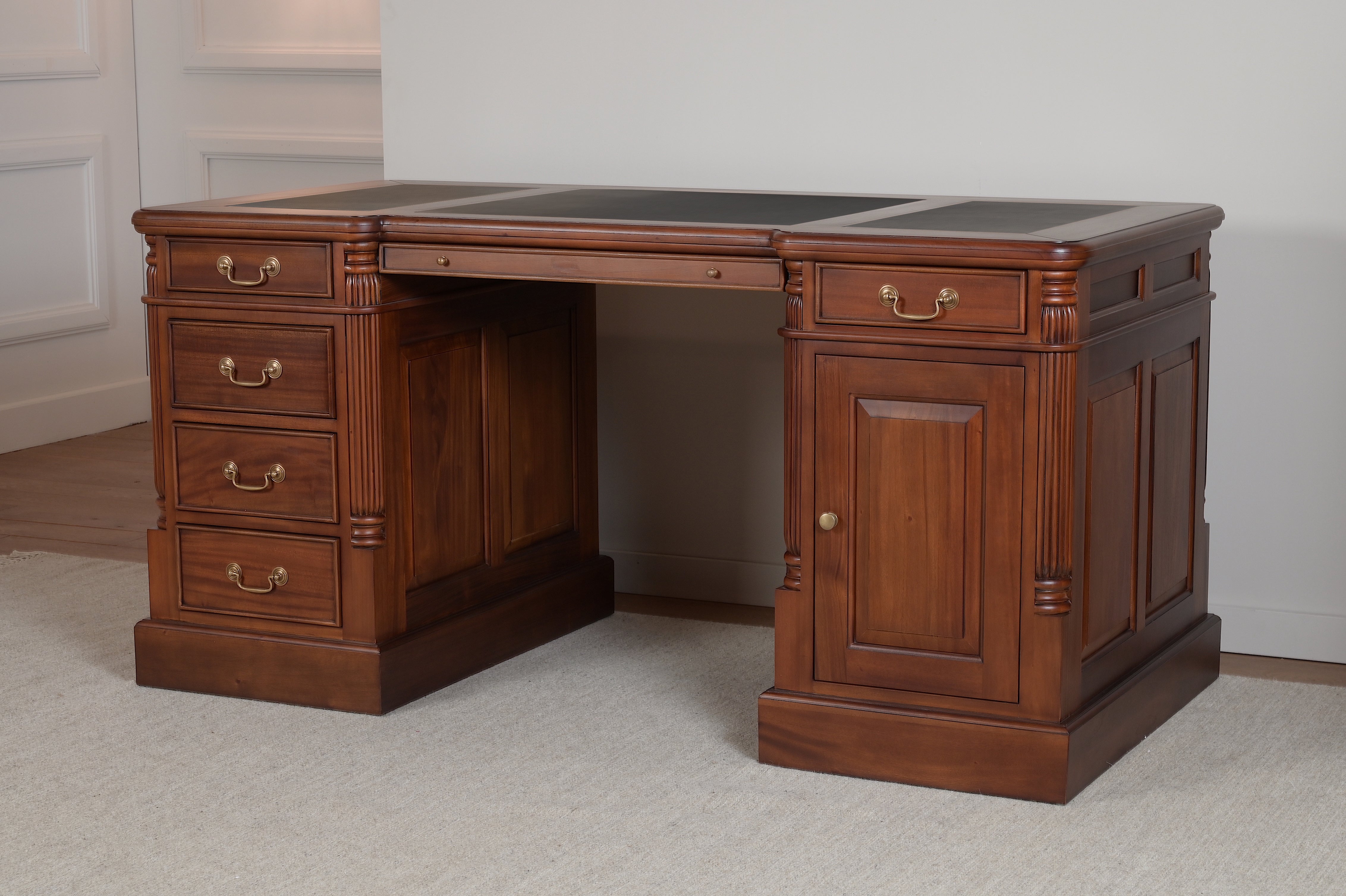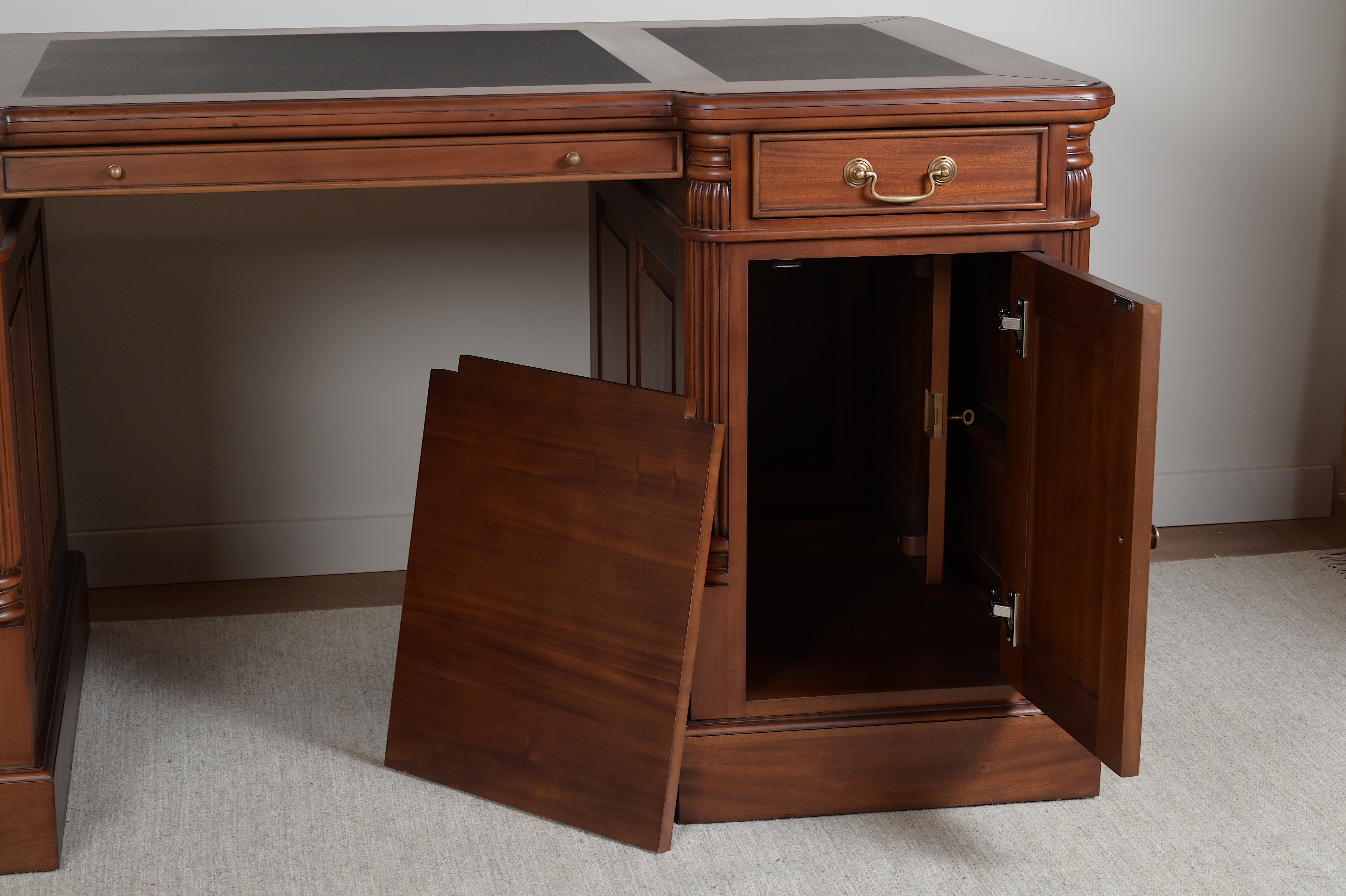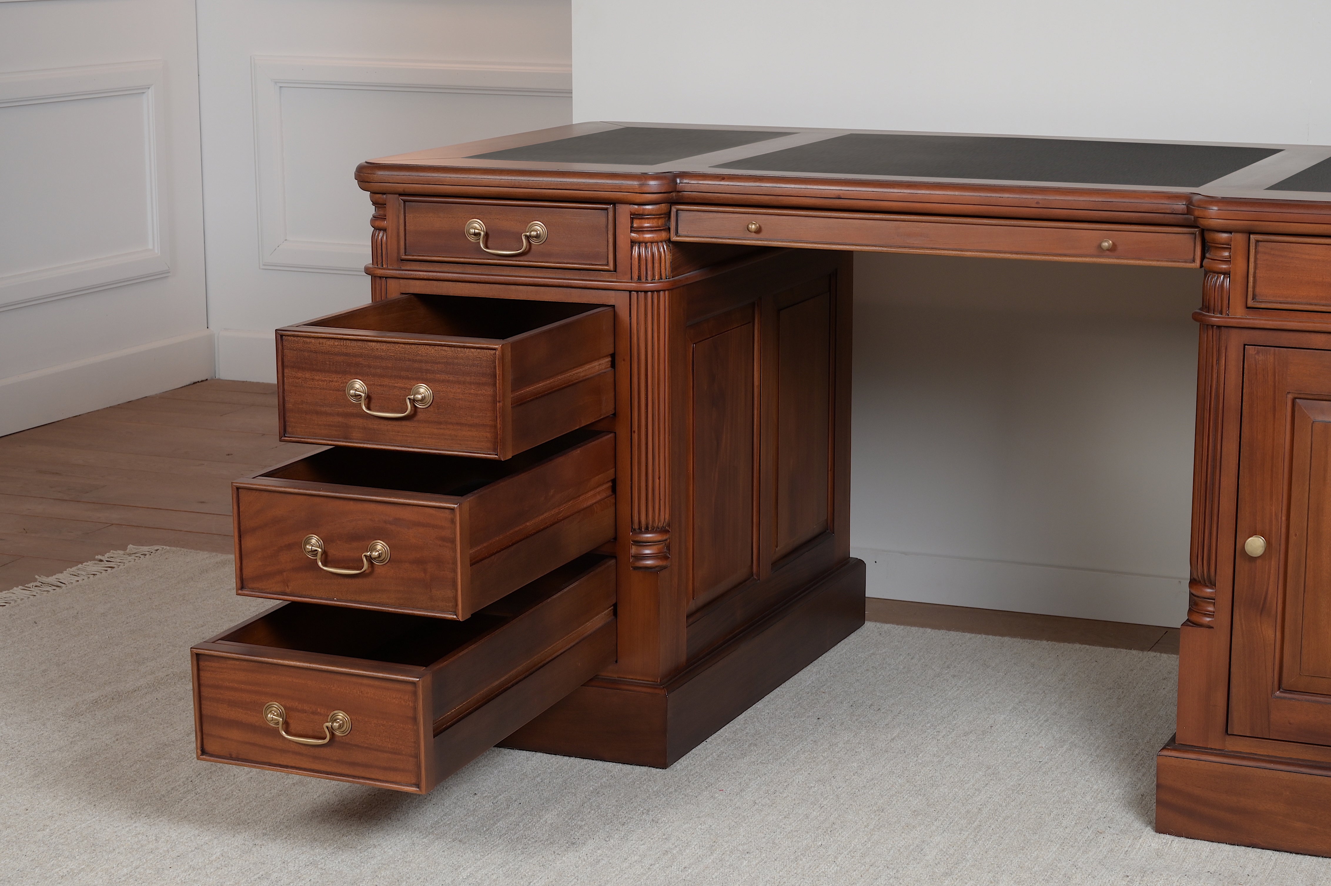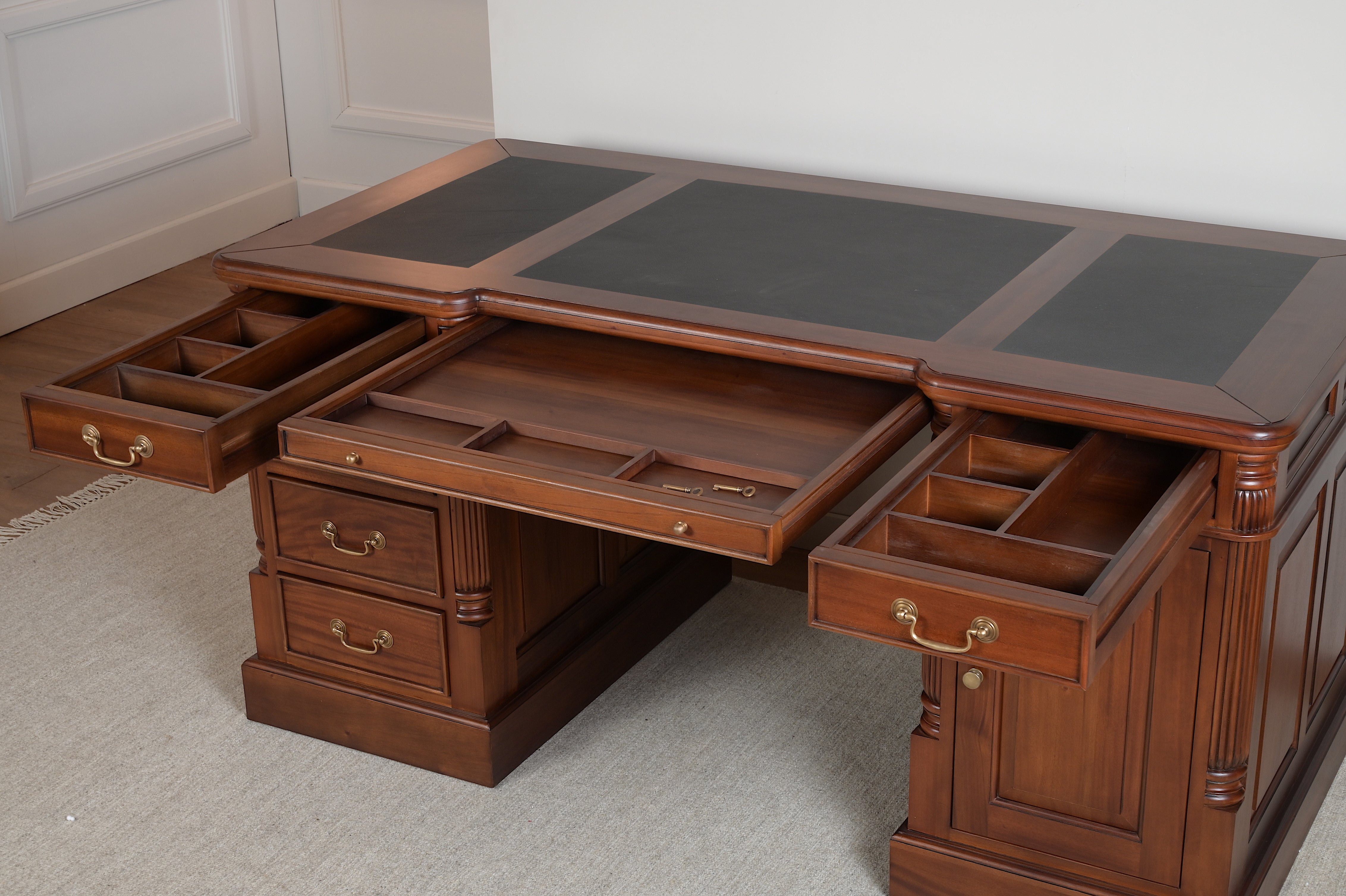 Dieser Schreibtisch ist aus hochwertigem massivem Mahagoniholz gefertigt und die Platte ist mit echtem Leder eingelegt. Der Schreibtisch ist in der Farbe Bernstein gebeizt .