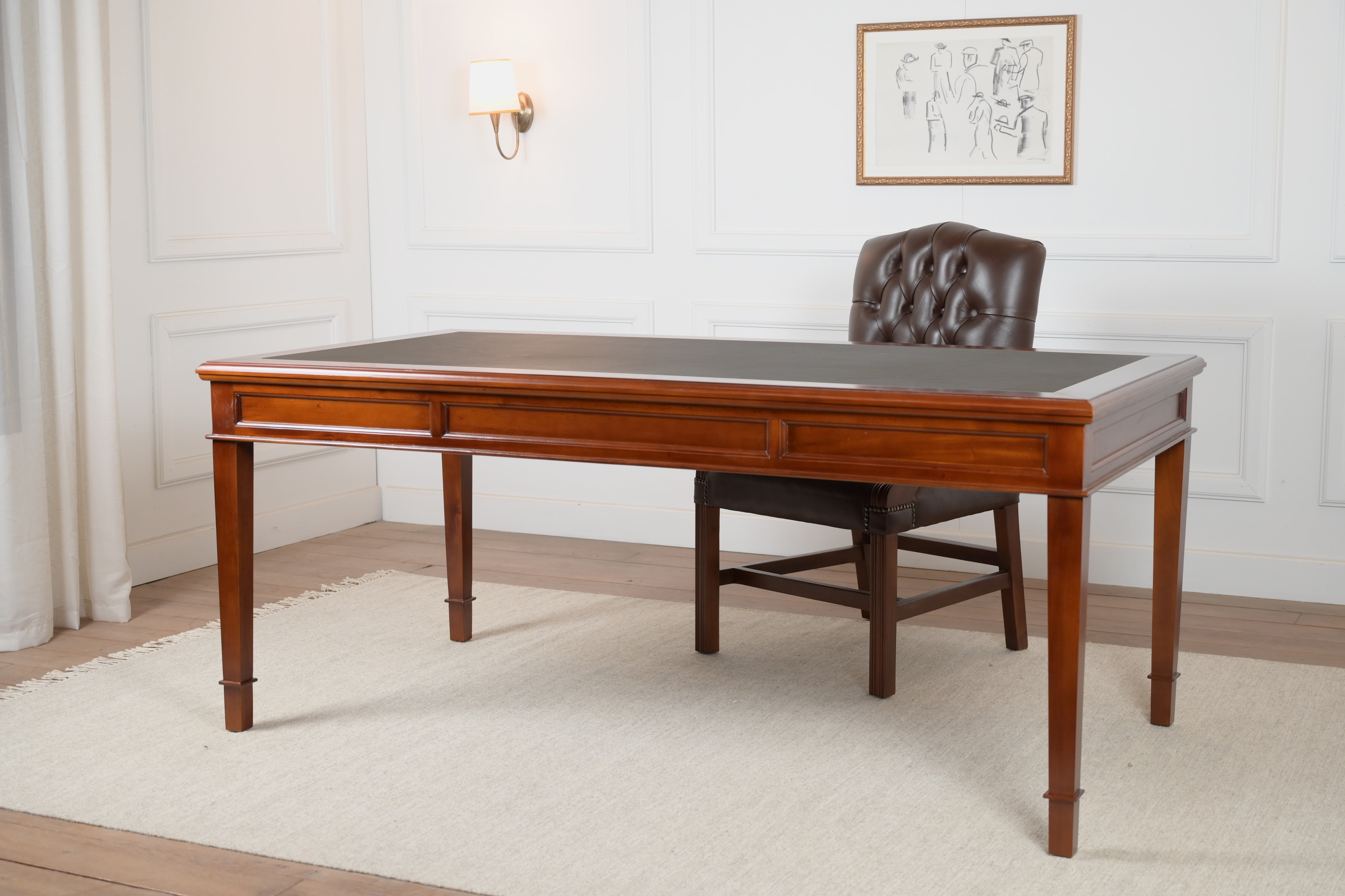 Classic writing desk made of solid mahogany with a luxurious leather inlay. Perfect for a stylish office or workspace.