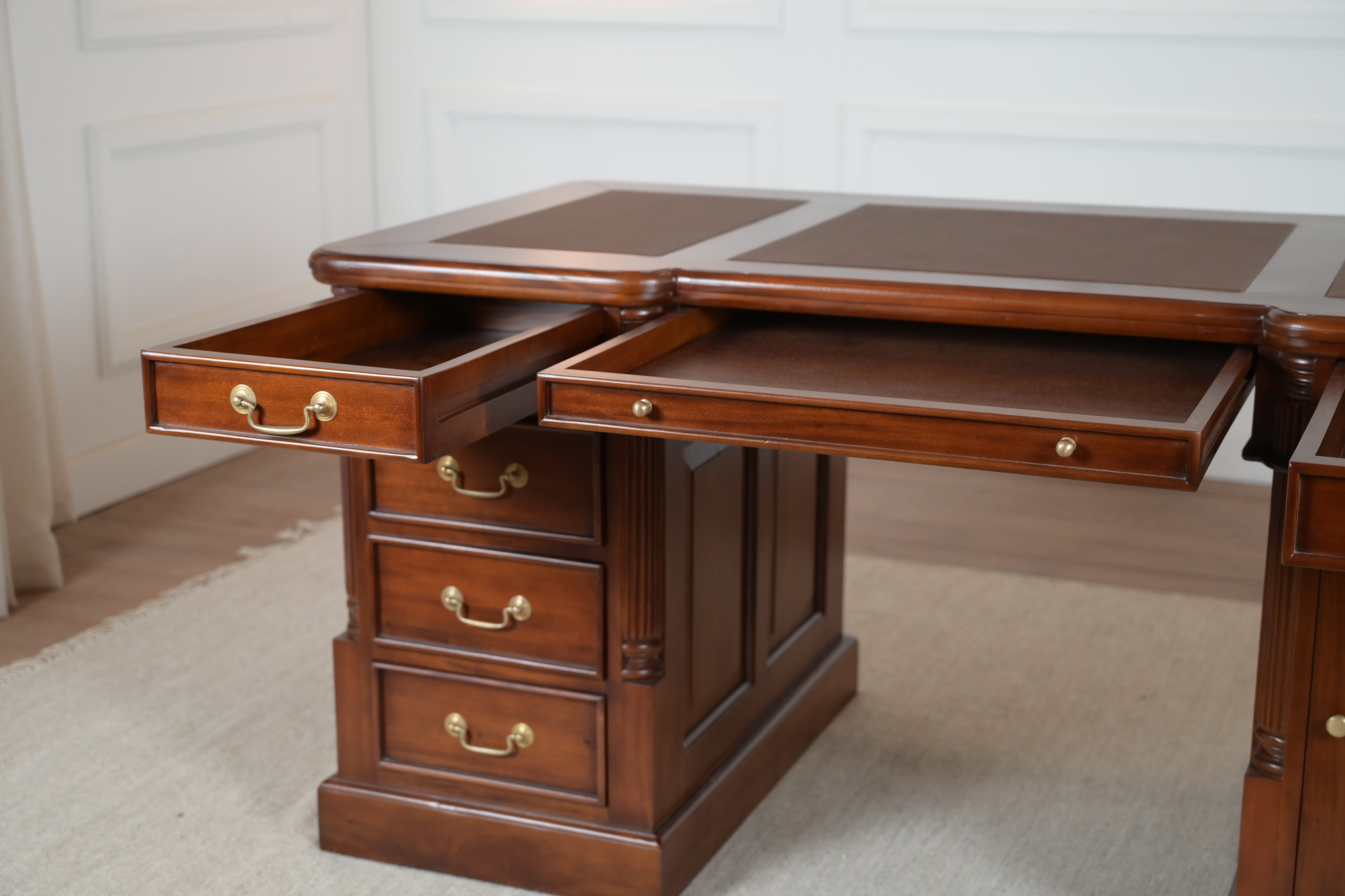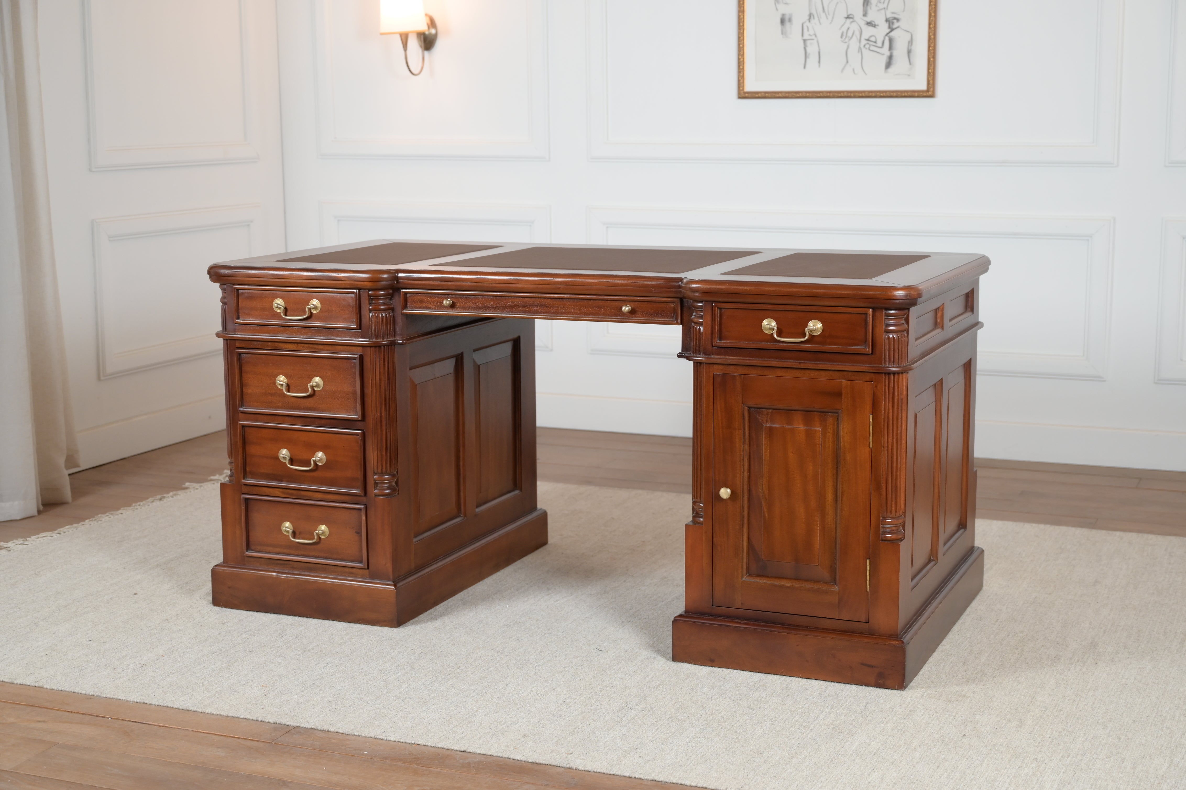 Bureau classique en acajou massif avec une luxueuse incrustation de cuir. Parfait pour un bureau ou un lieu de travail élégant.