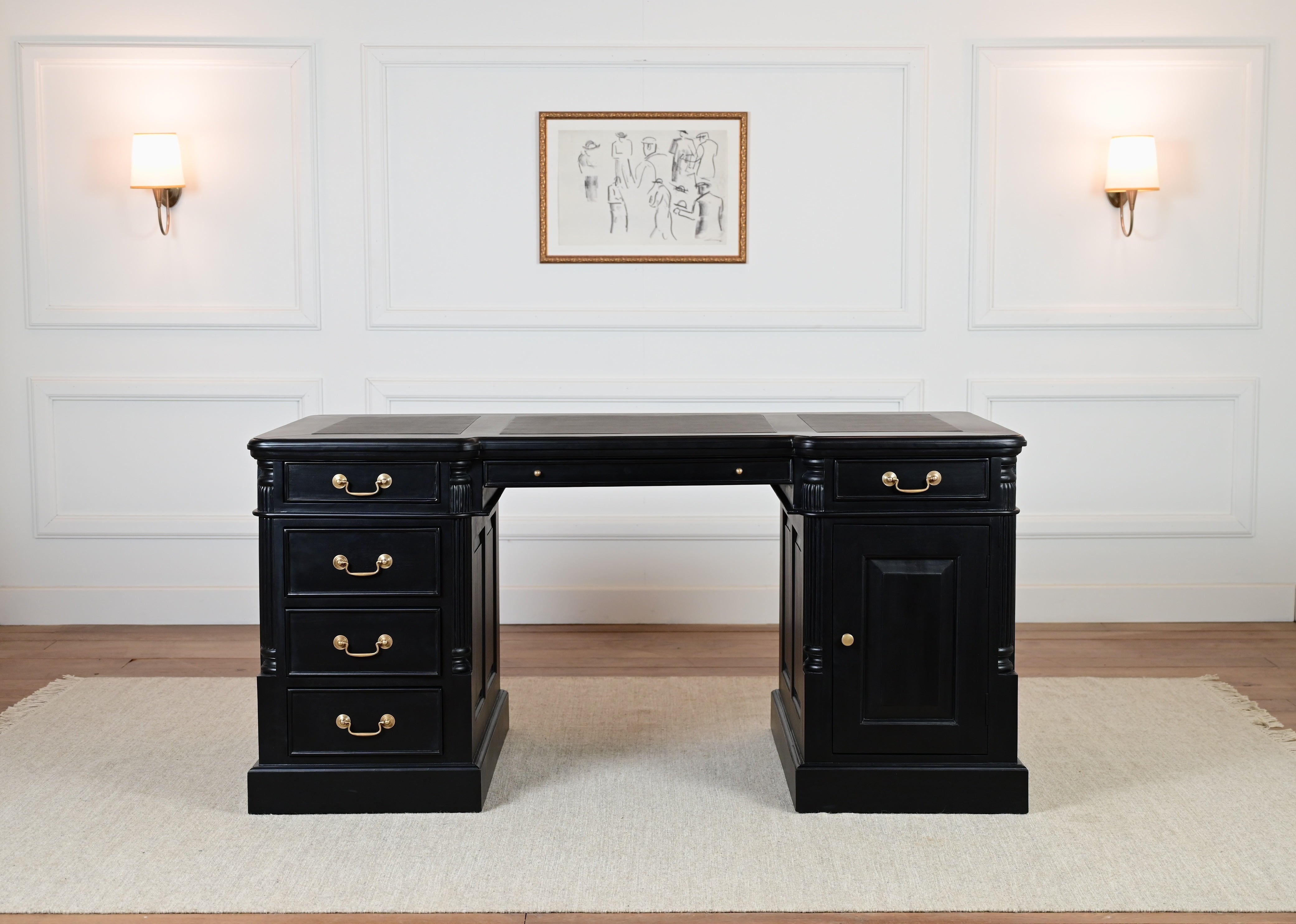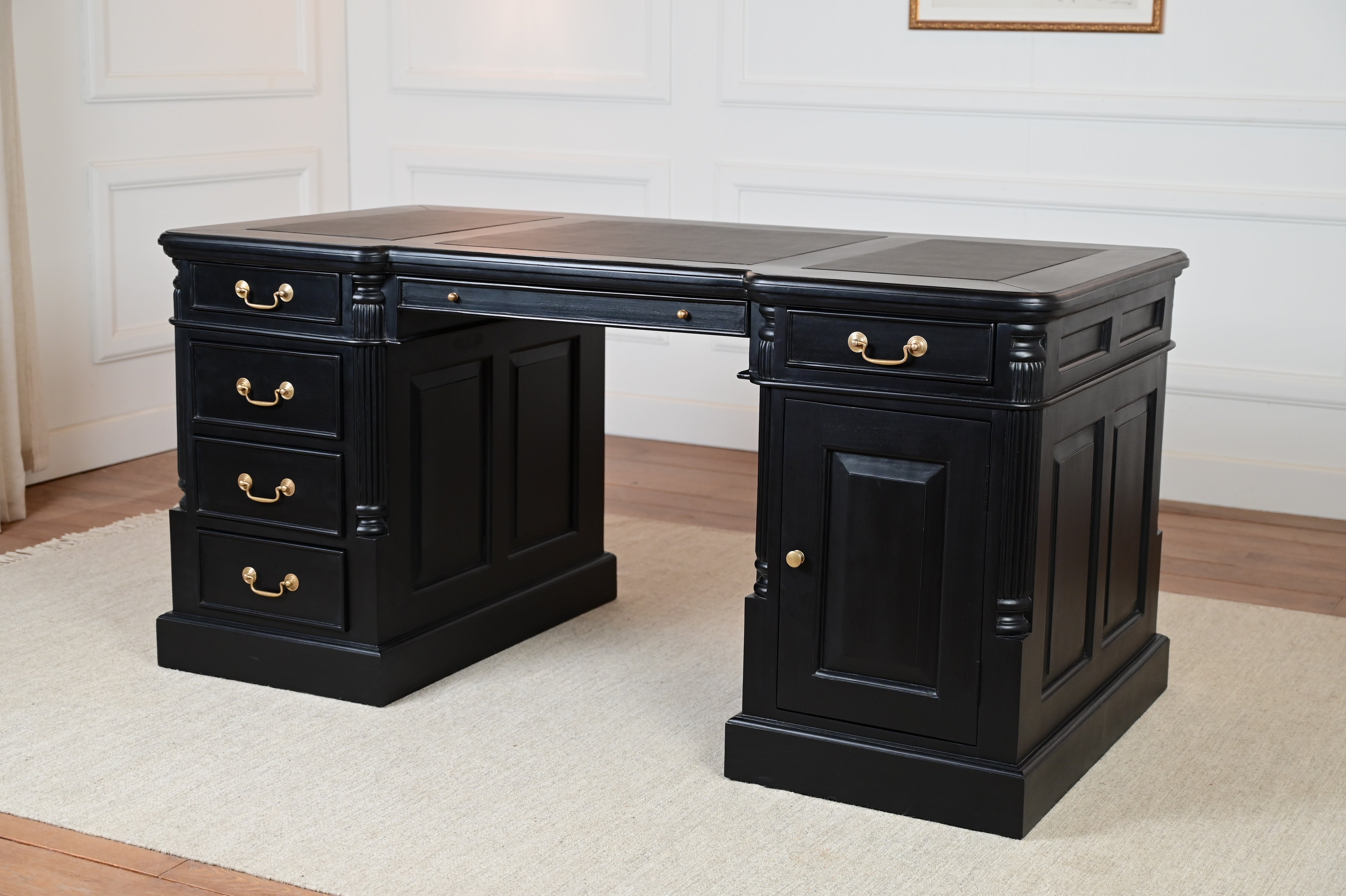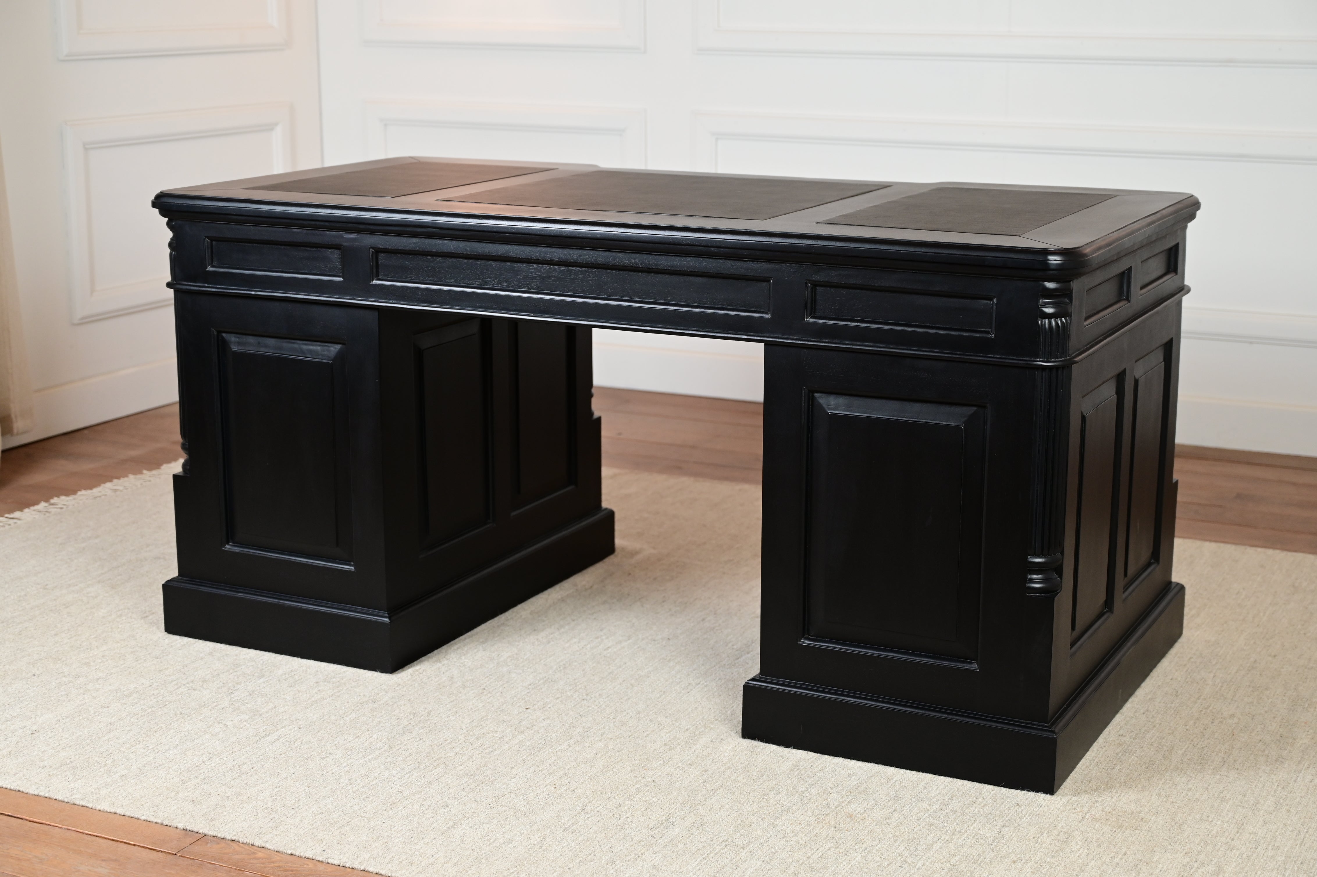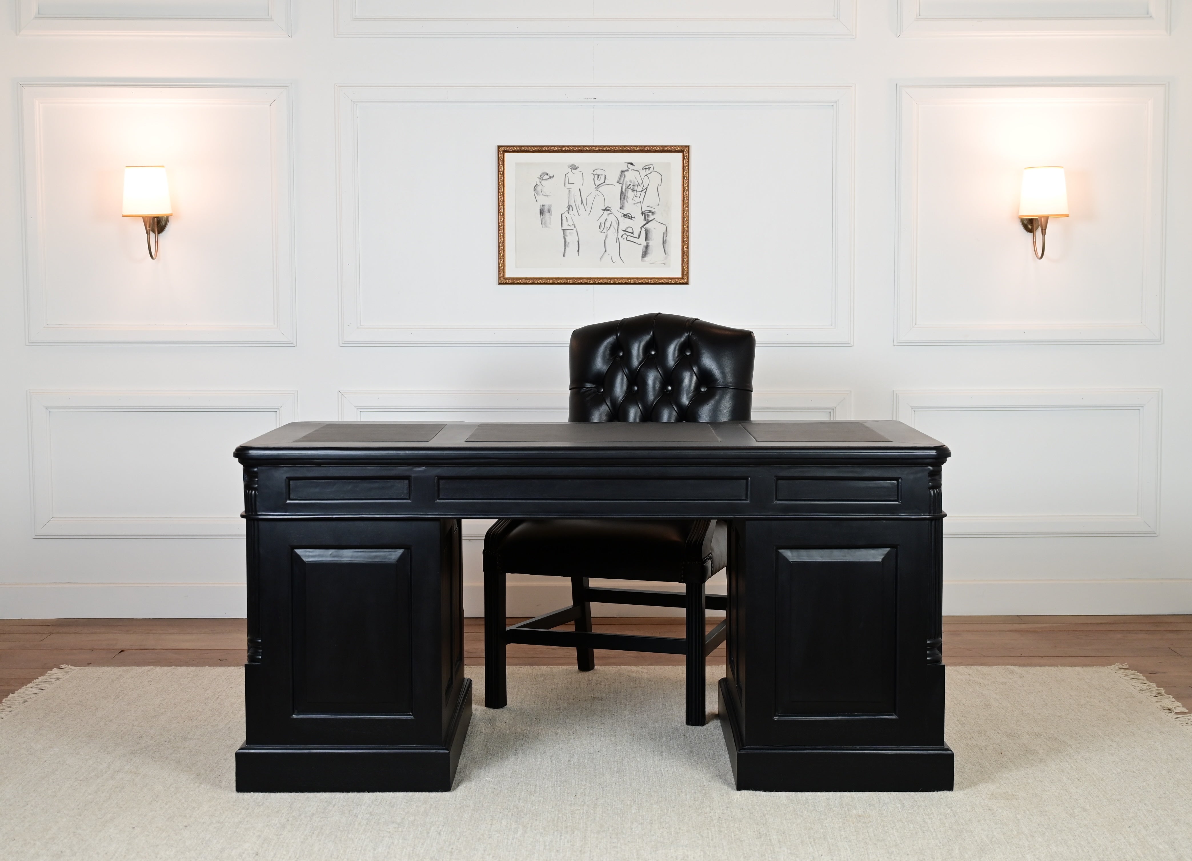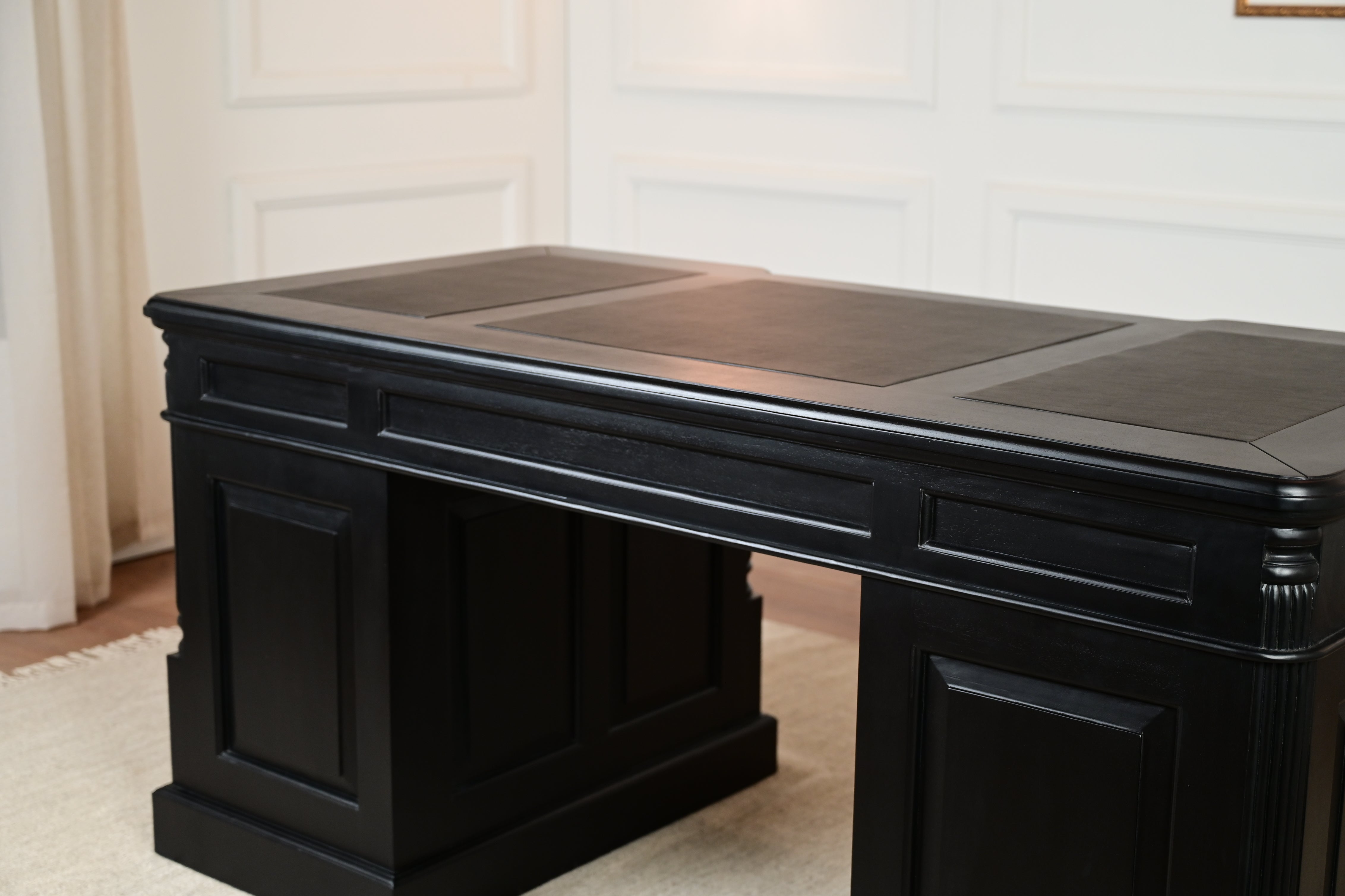 Bureau noir classique en acajou massif avec une luxueuse incrustation de cuir. Parfait pour un bureau ou un lieu de travail élégant.