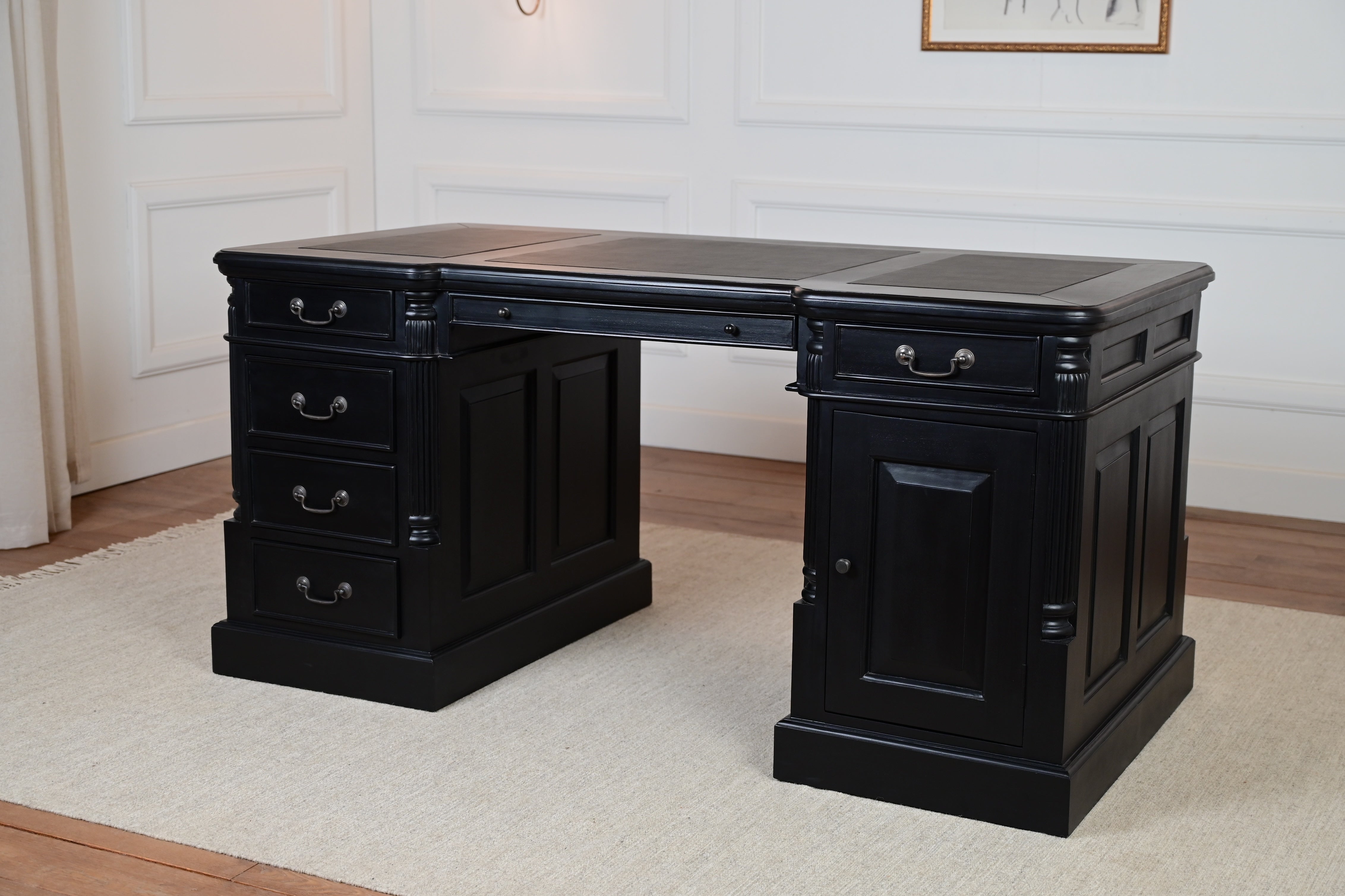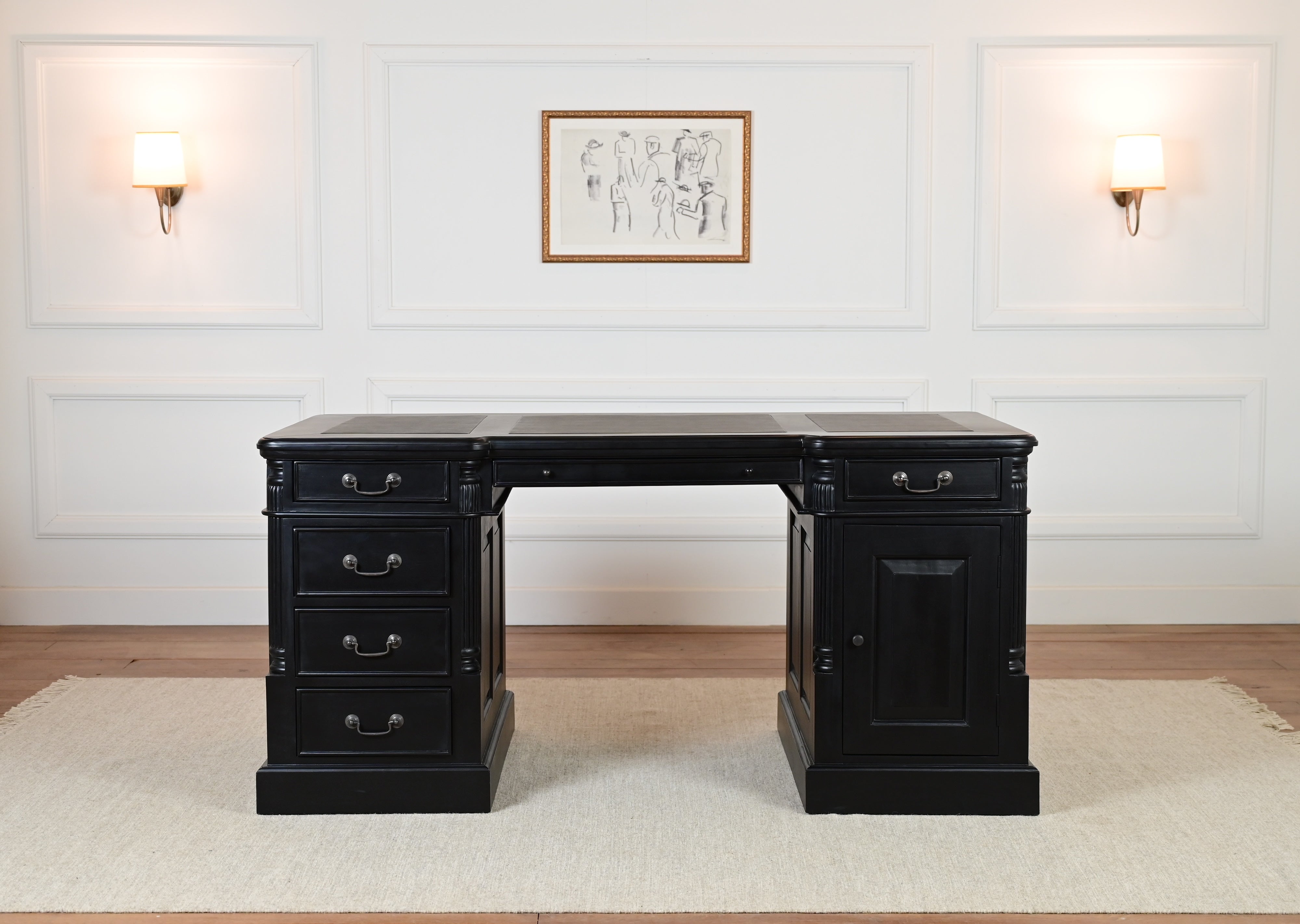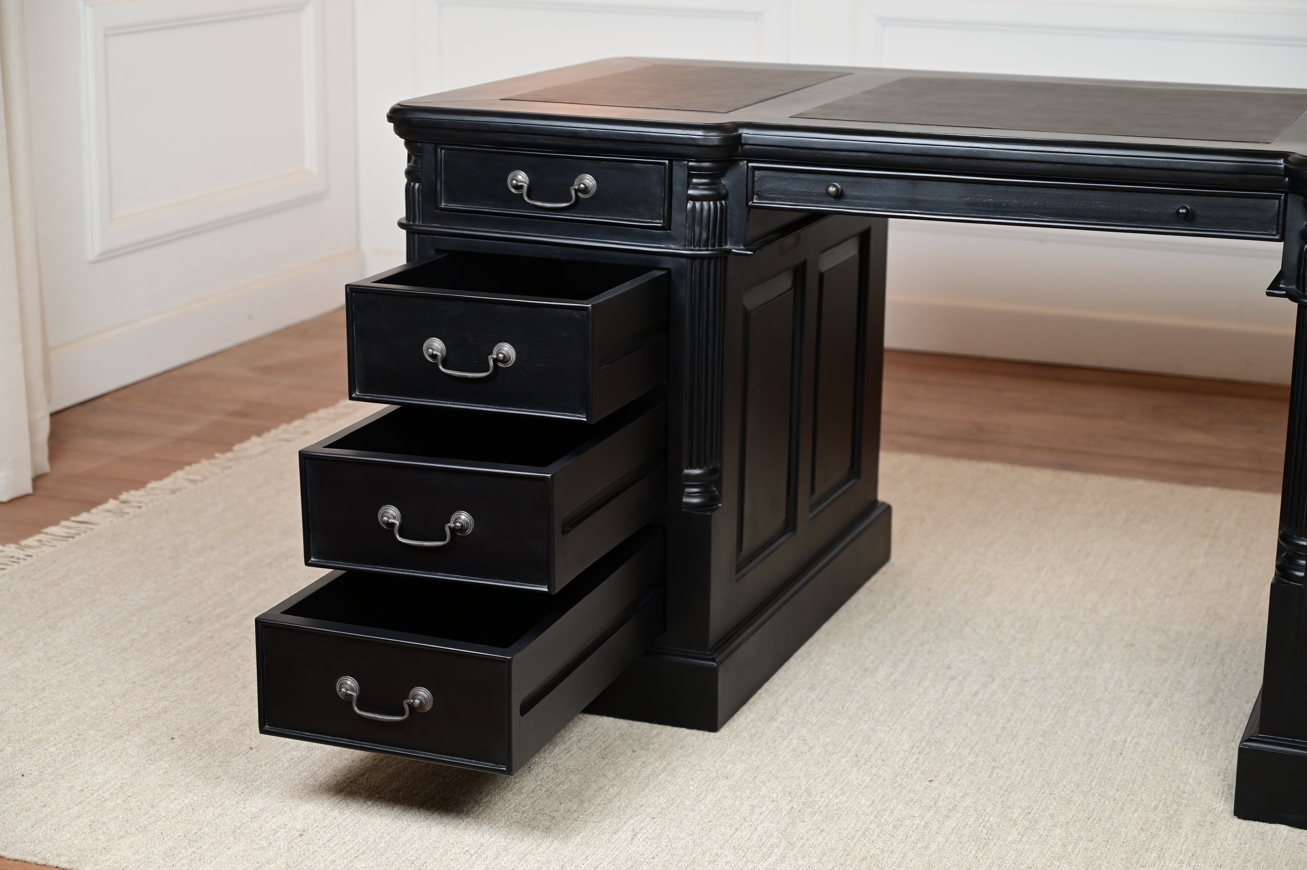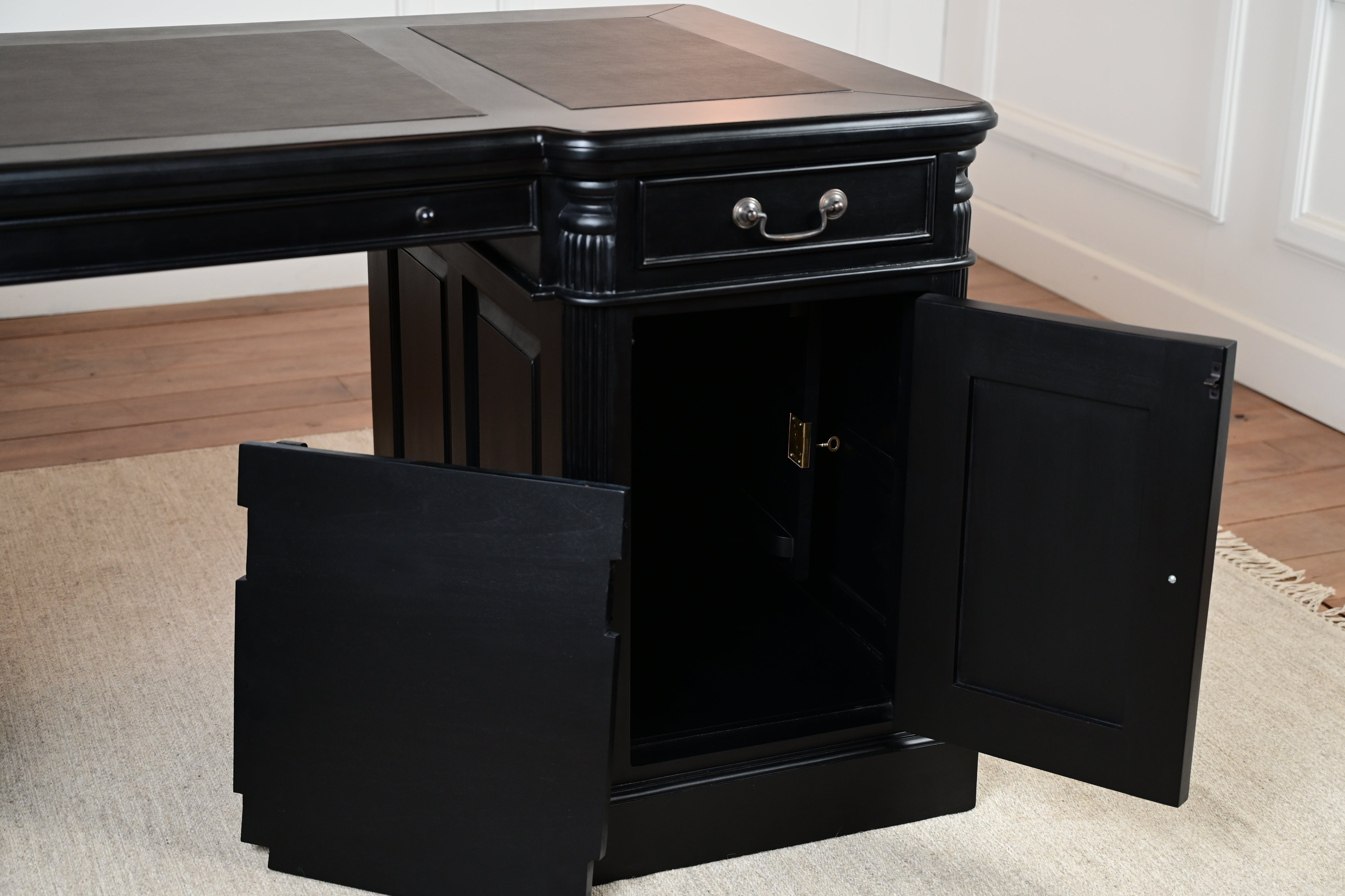 Bureau noir classique en acajou massif avec une luxueuse incrustation de cuir. Parfait pour un bureau ou un lieu de travail élégant.