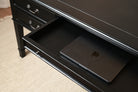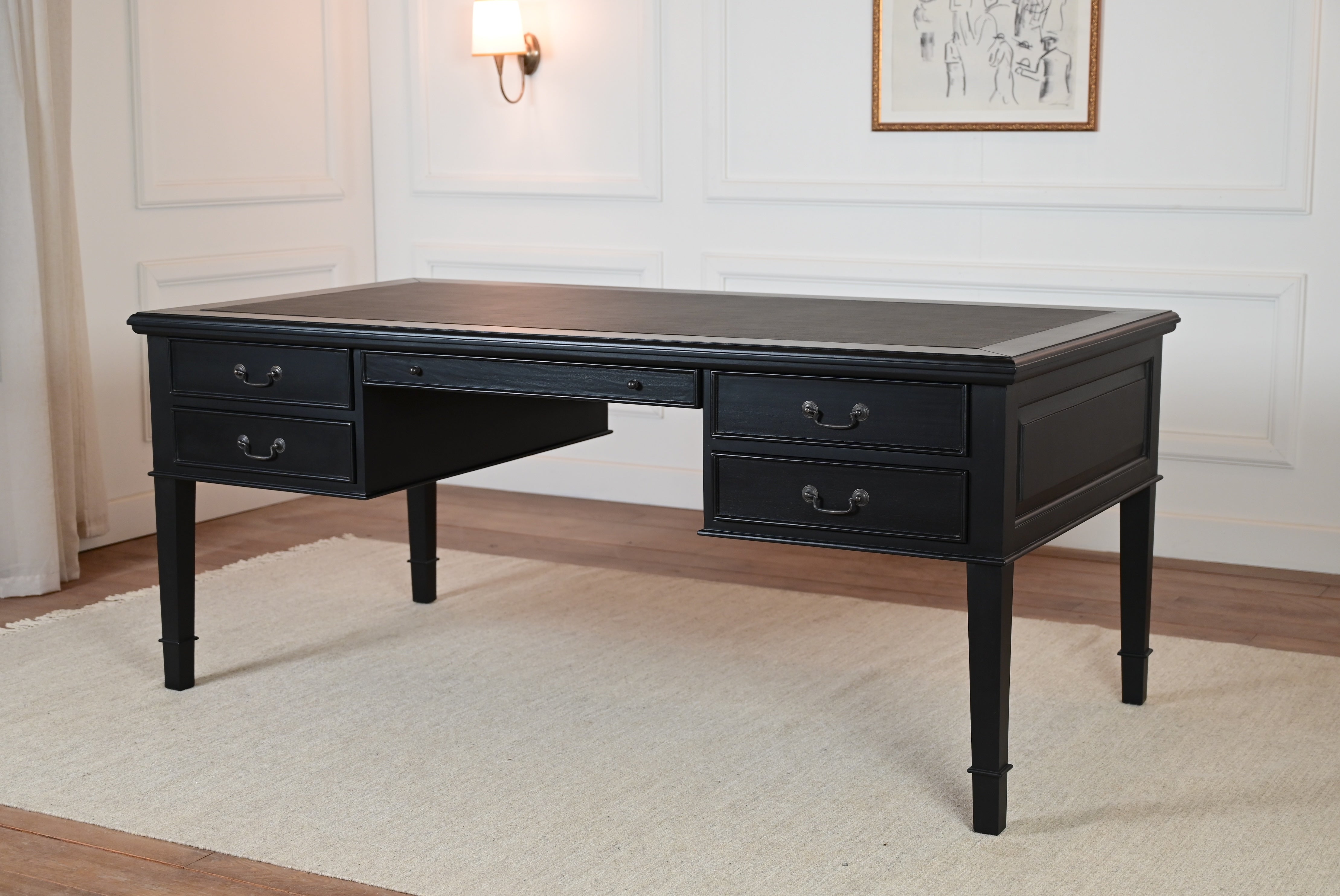 Klassieke zwarte schrijftafel van massief mahoniehout met een luxe lederen inleg. Perfect voor een stijlvol kantoor of werkplek.