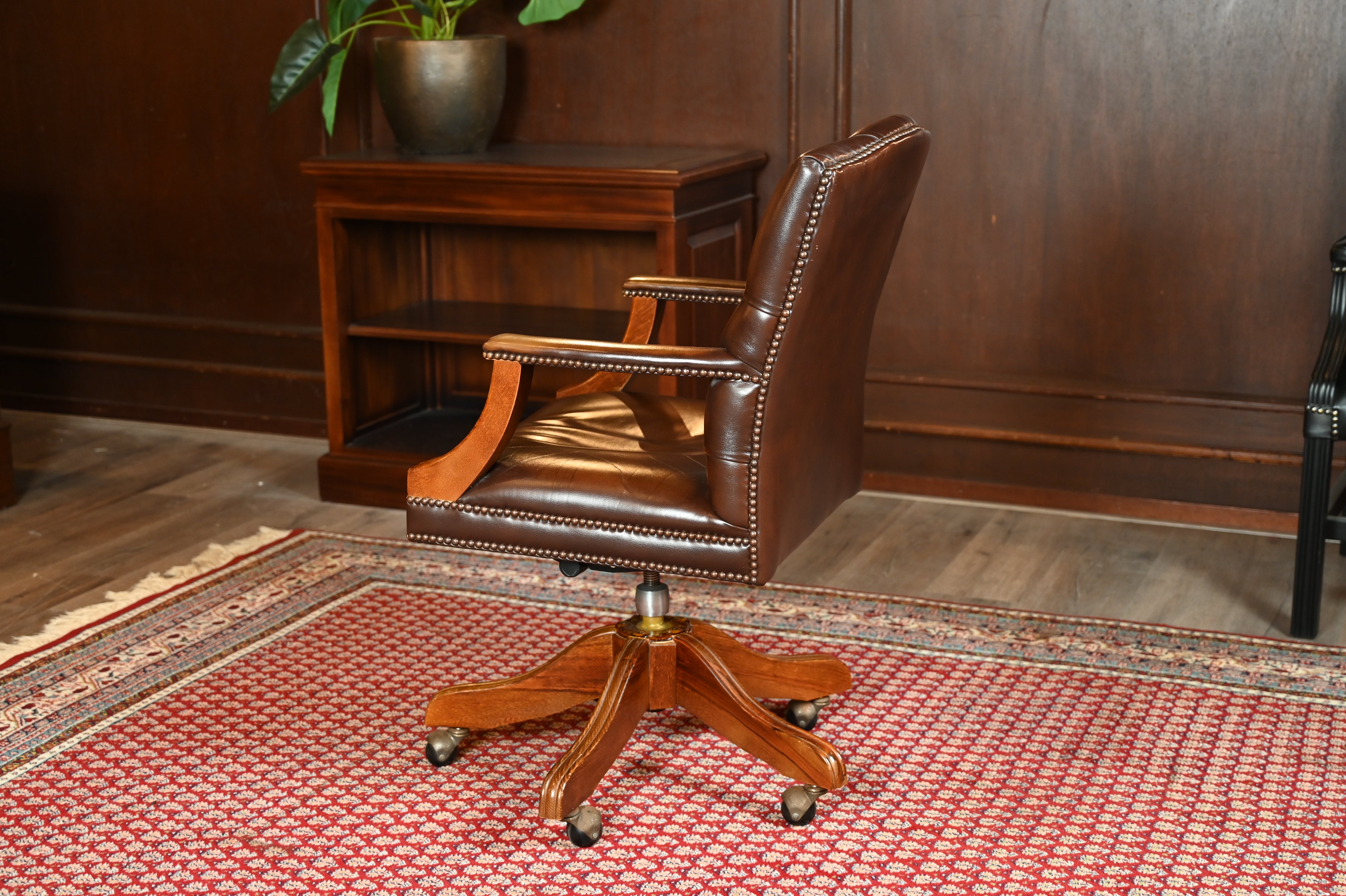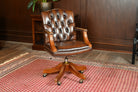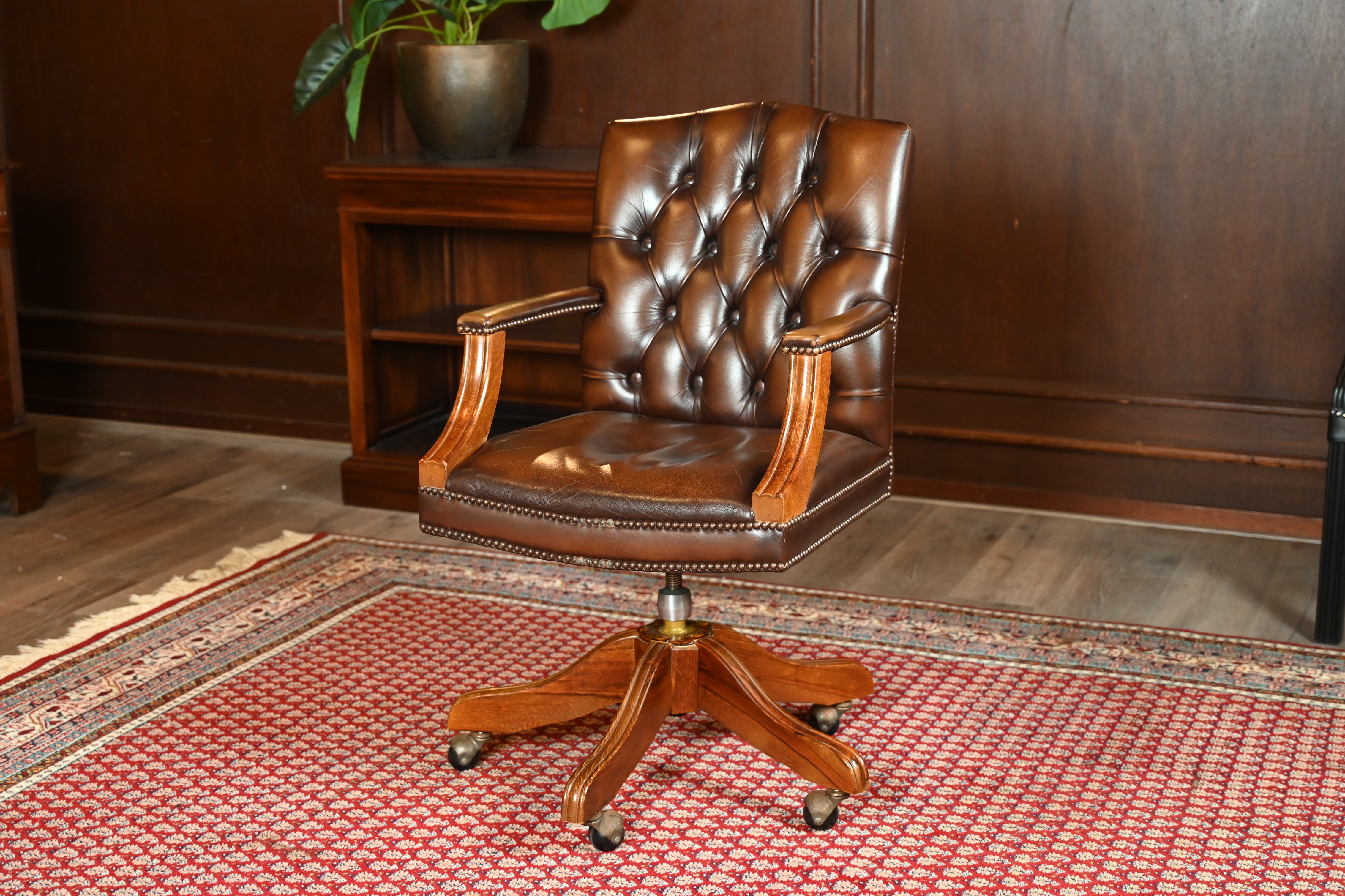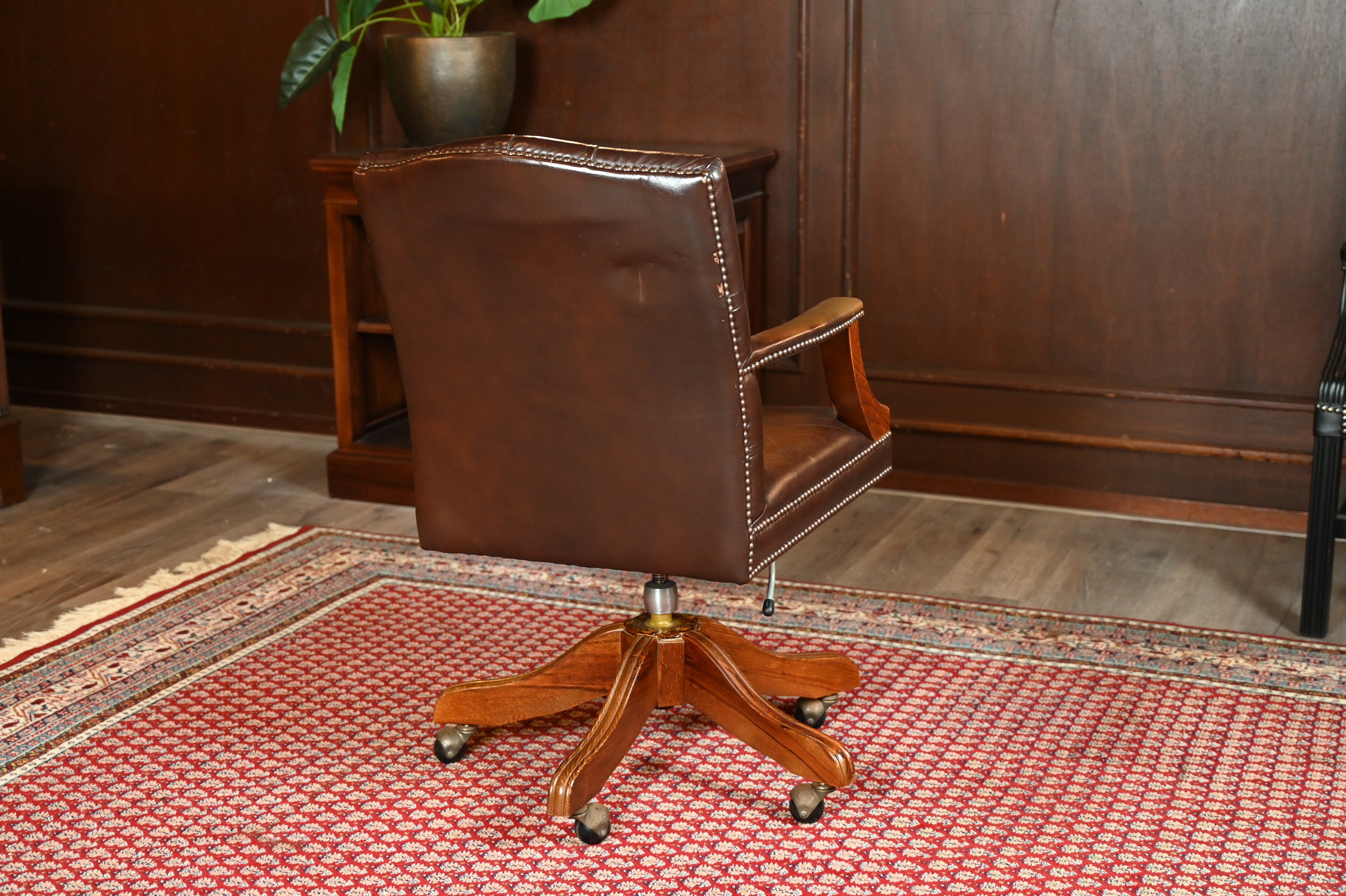 Vintage stoel, bruin leer, eikenhout, Chesterfield, 251
