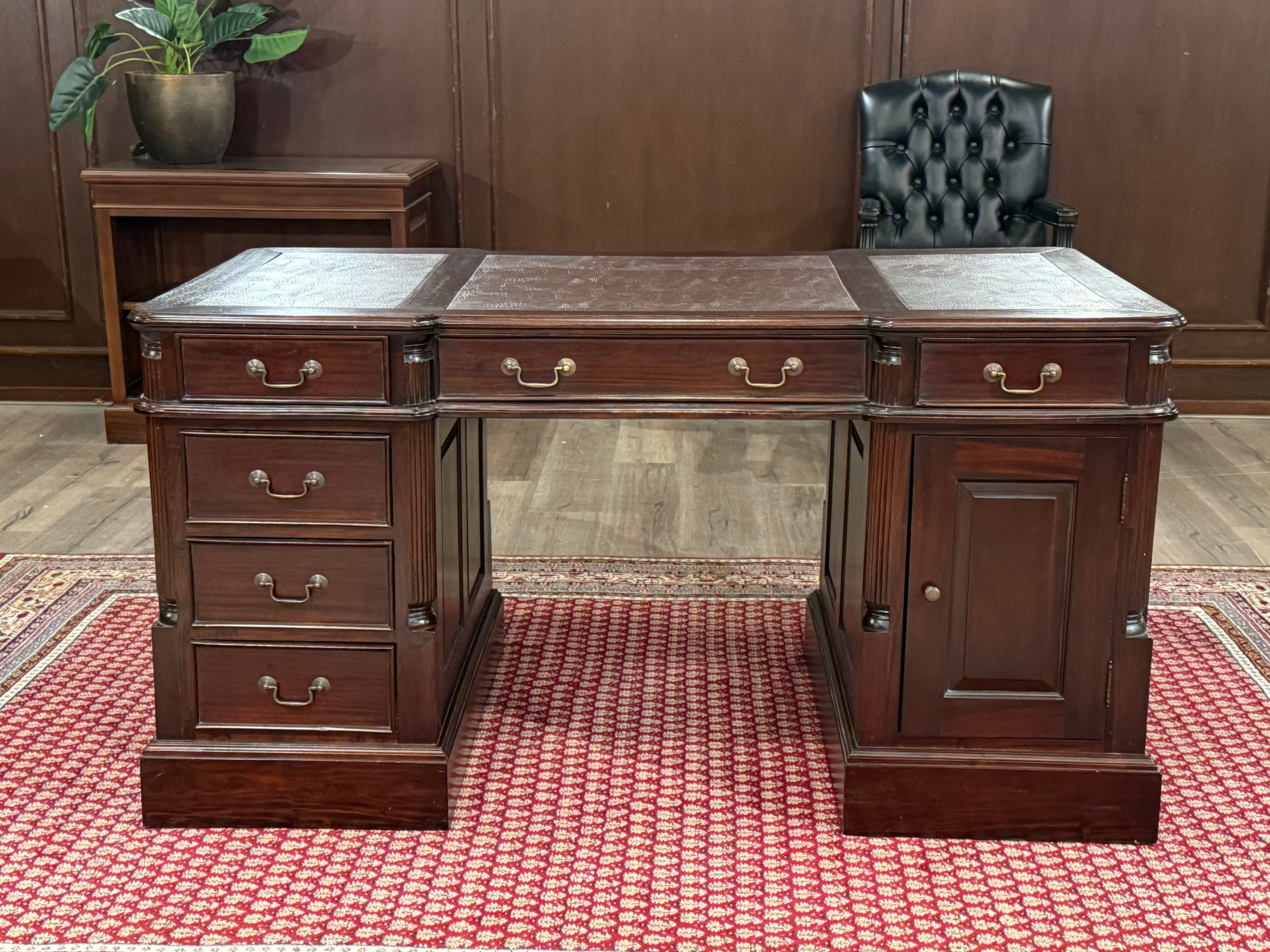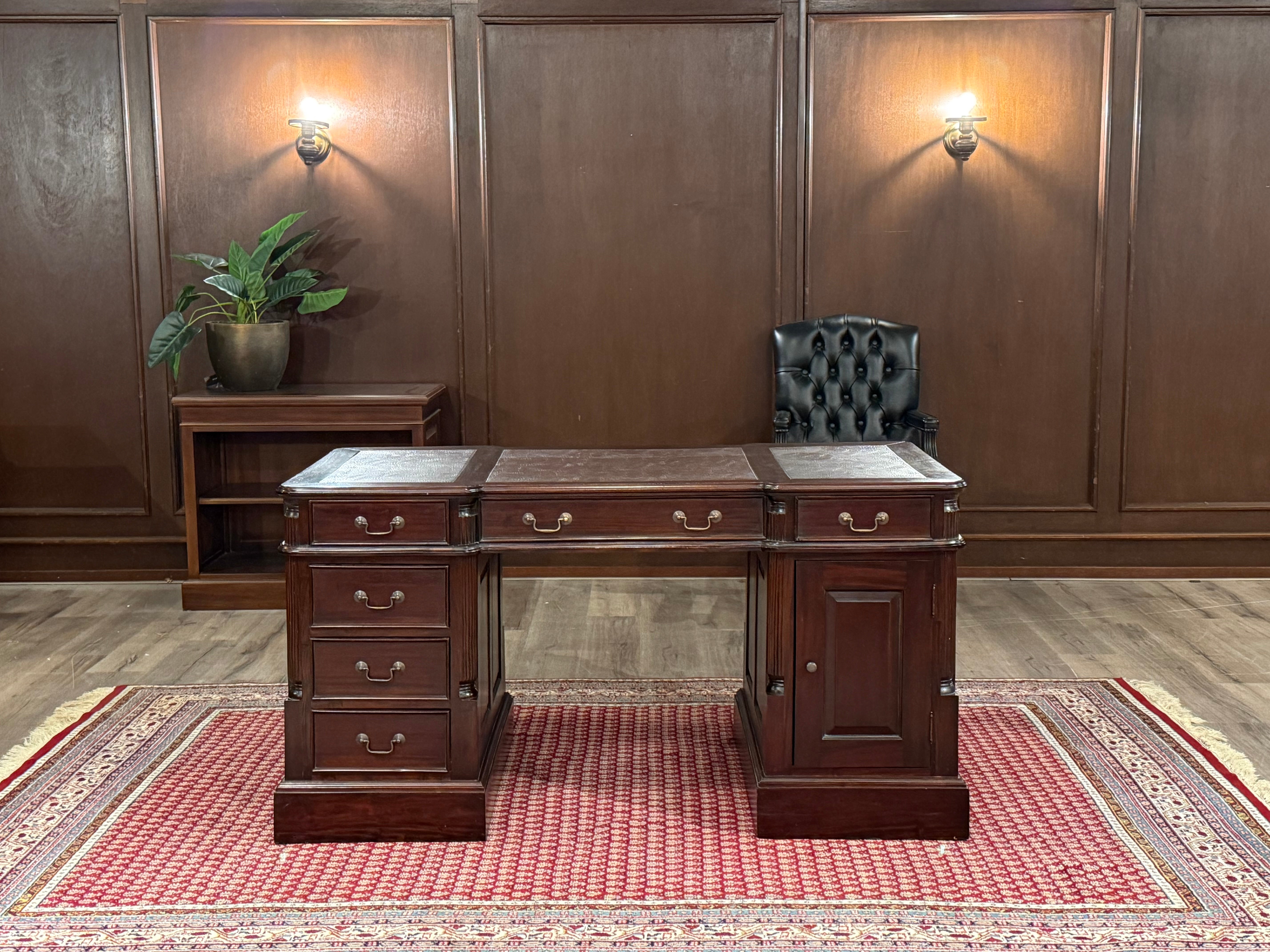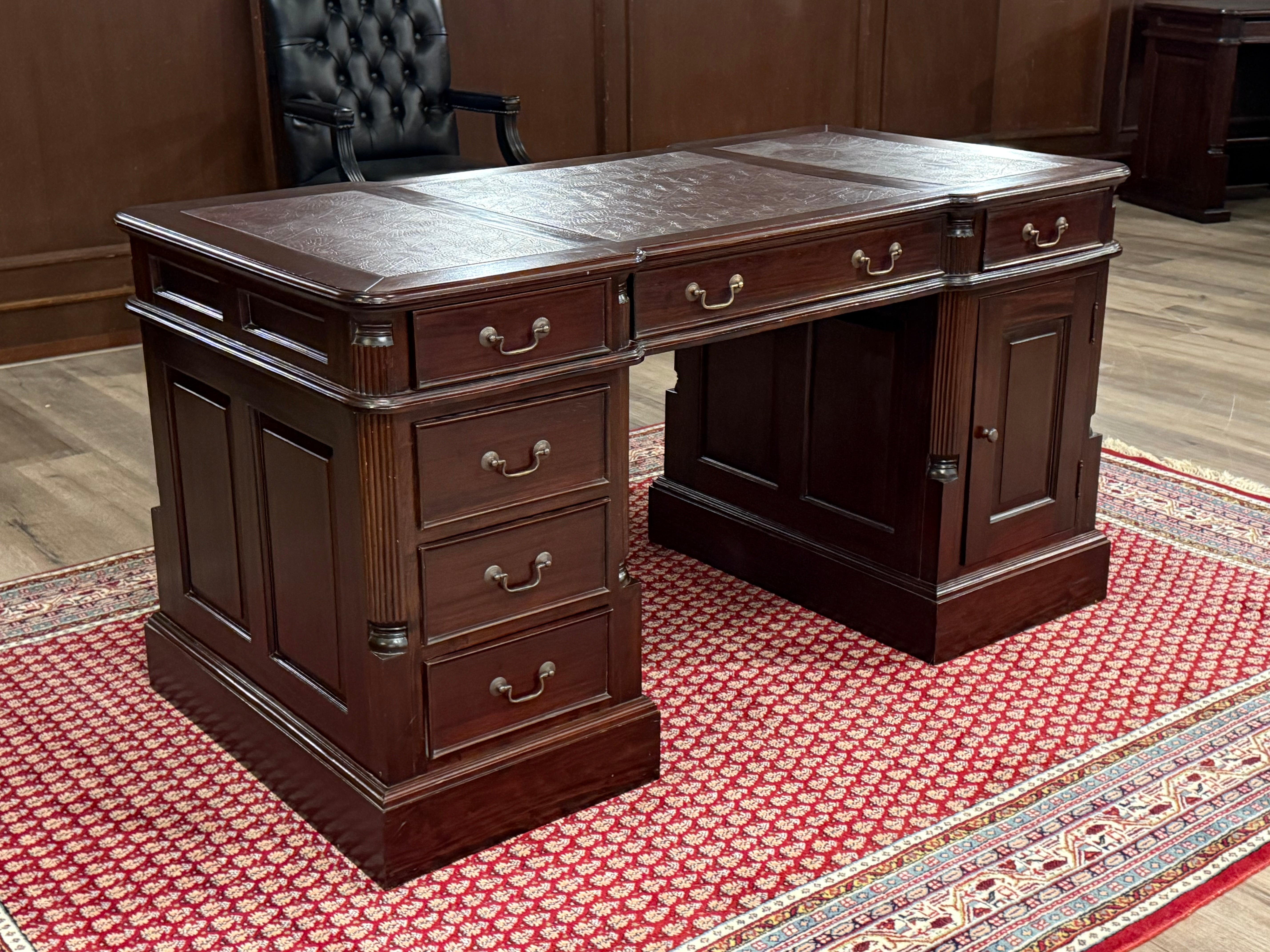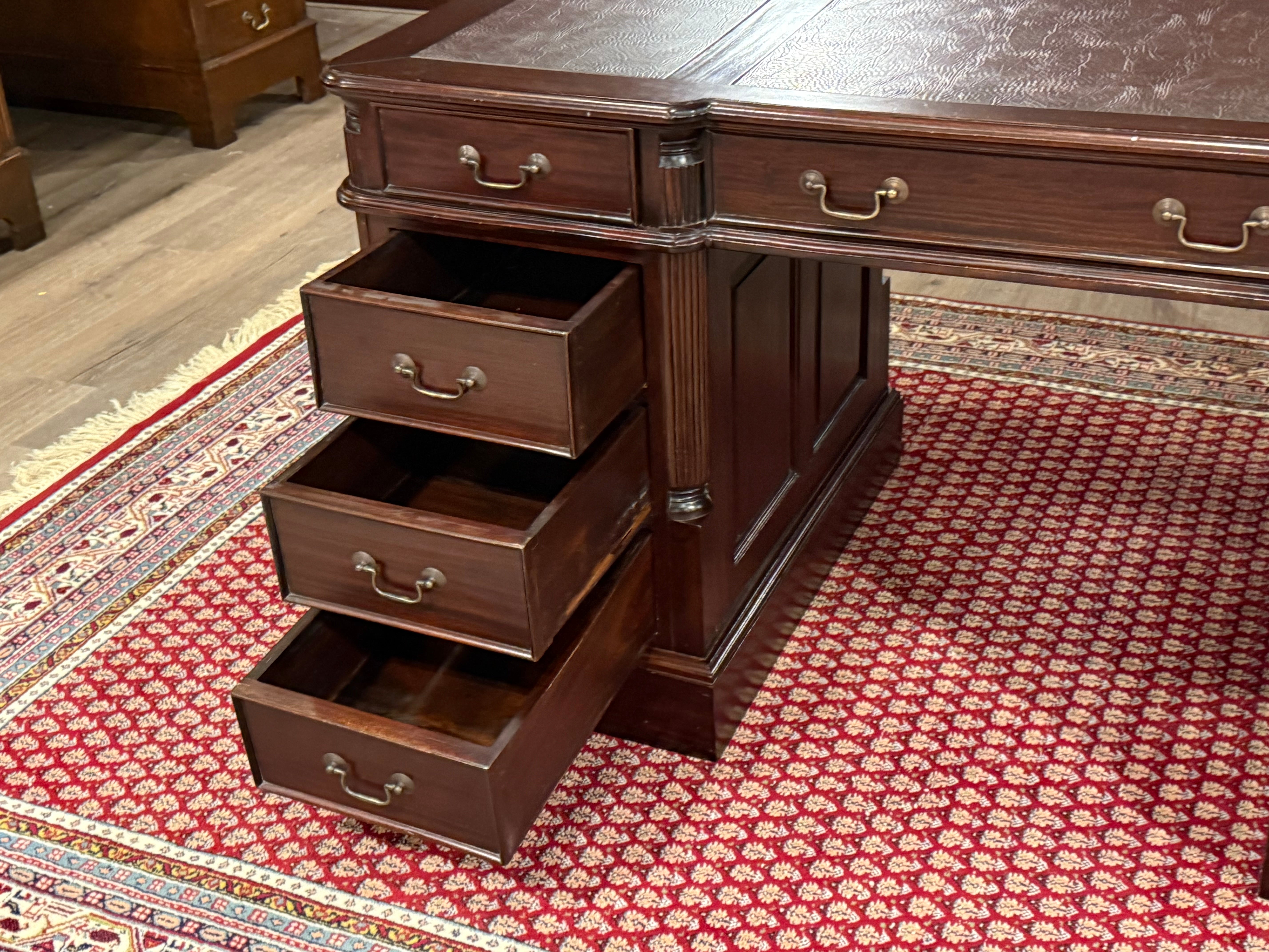 Vintage bureau, klassiek Engels bureau, mahoniehout, rood leer, 546